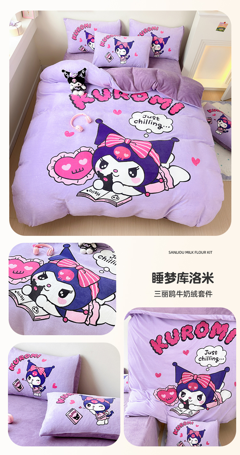 当前位置: 91家纺网 > 商品网购 > 床品套件 > 四件套 > 牛奶绒四件套 > 孩子王家纺 2024新款正版授权三丽鸥库洛米大版卡通学生宿舍双面加厚牛奶绒系列四件套--提供买家秀 睡梦库洛米
