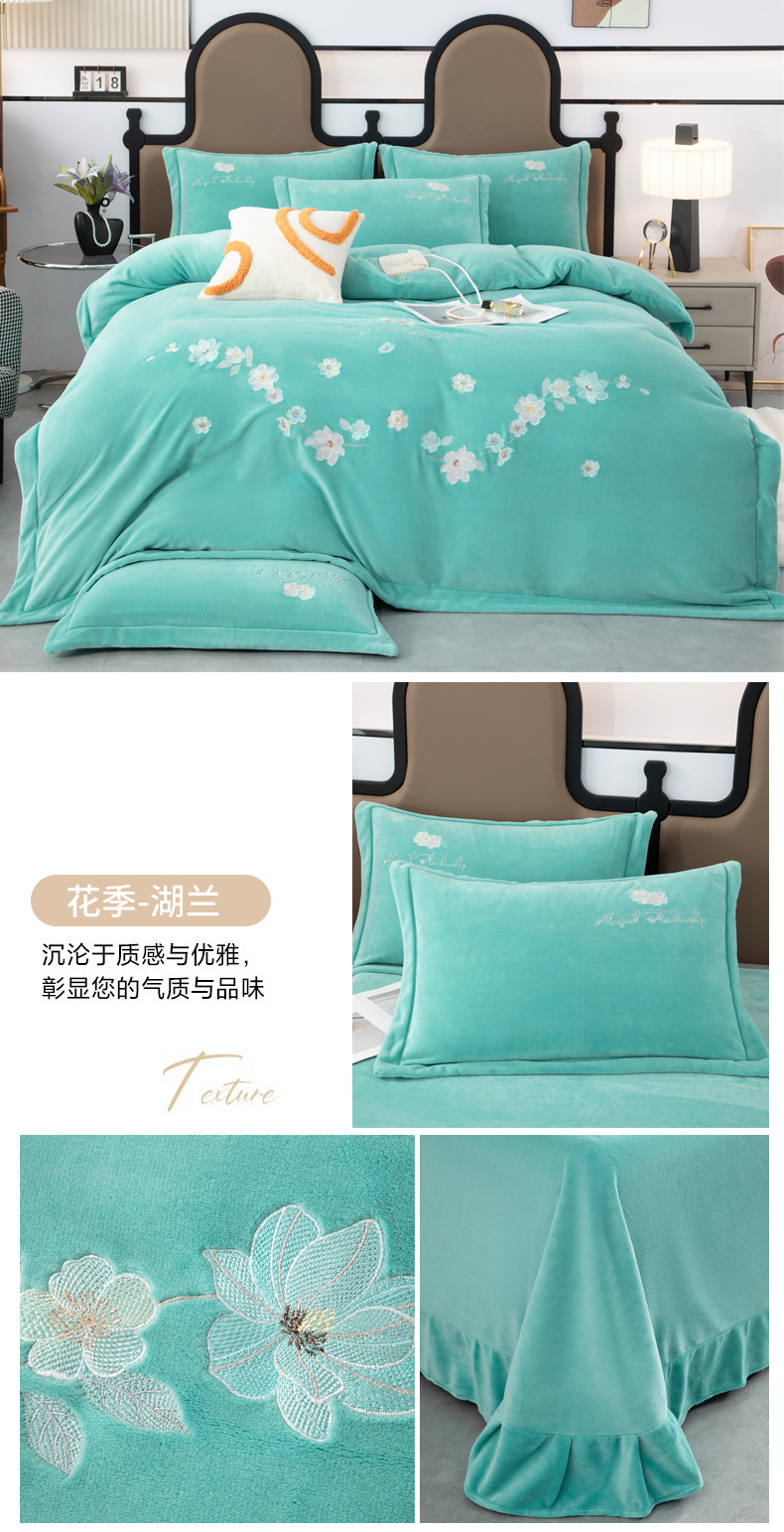 商品名称:优姿家纺 2025新款全消光10斤牛奶绒宽边绣花保暖四件套 花季-湖兰