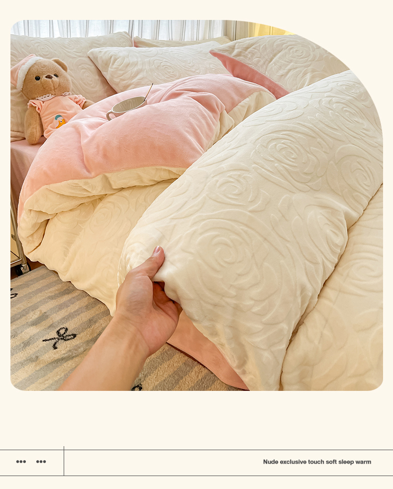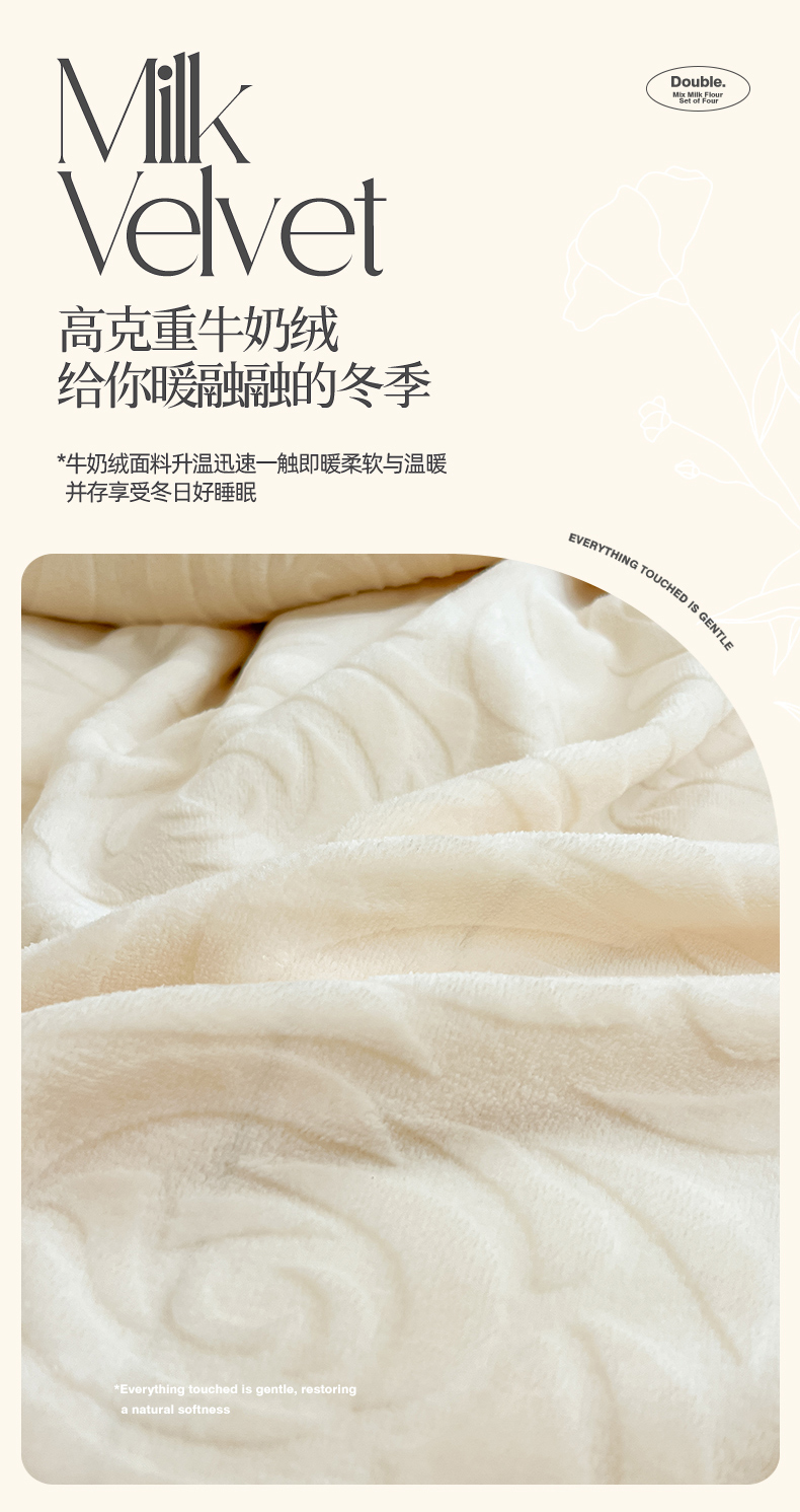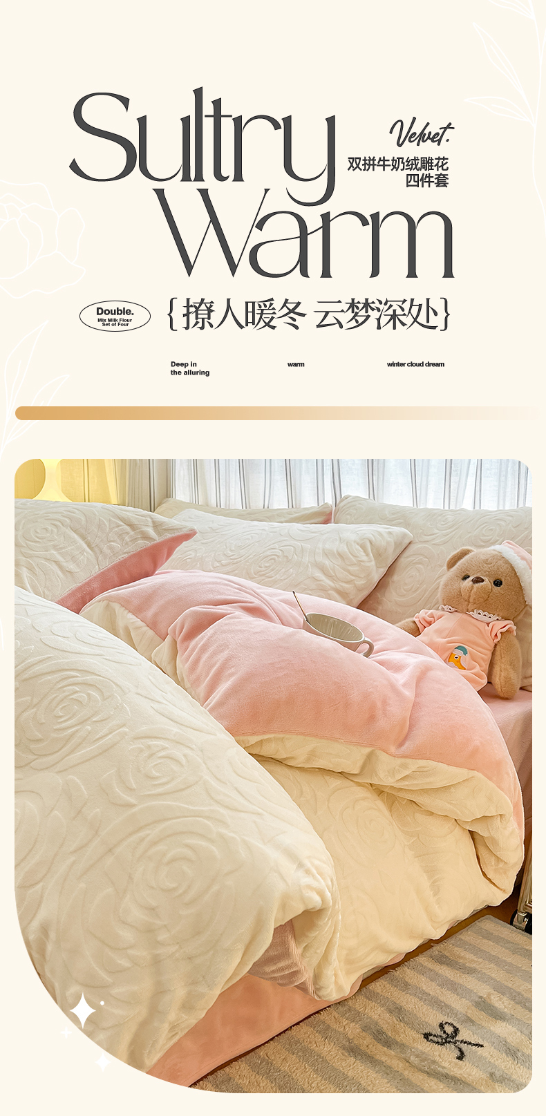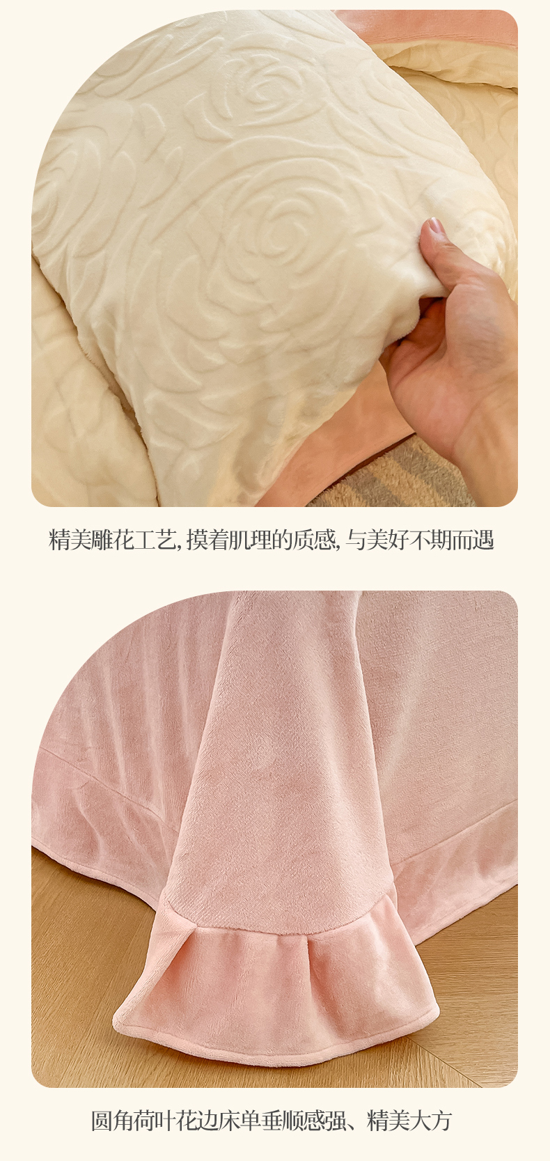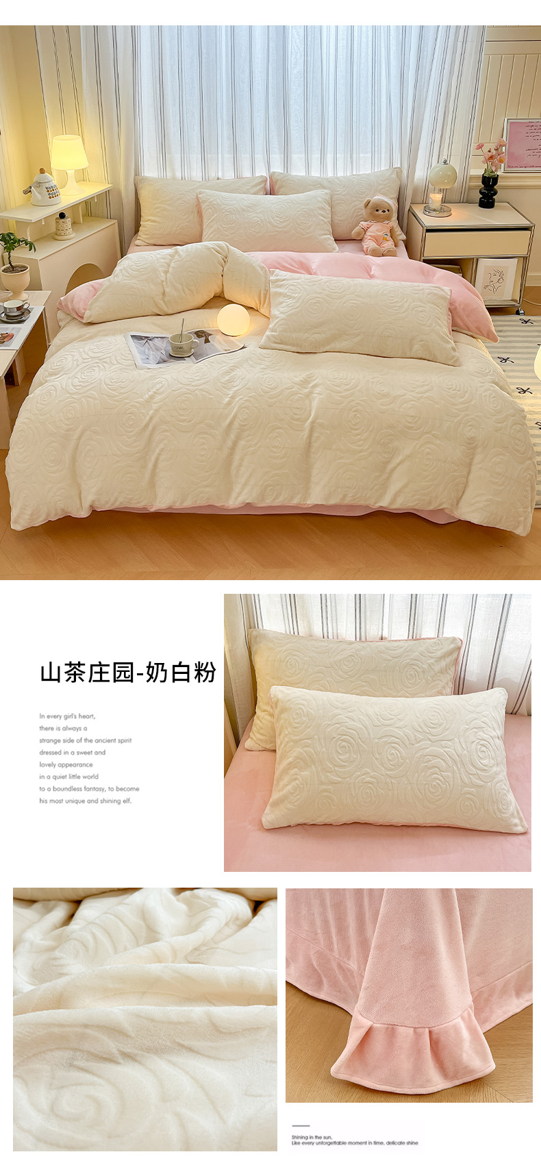 绘萱家居 2025新款高克重雕花雕印纯色牛奶绒四件套双拼法莱绒珊瑚绒 山茶庄园-奶白粉