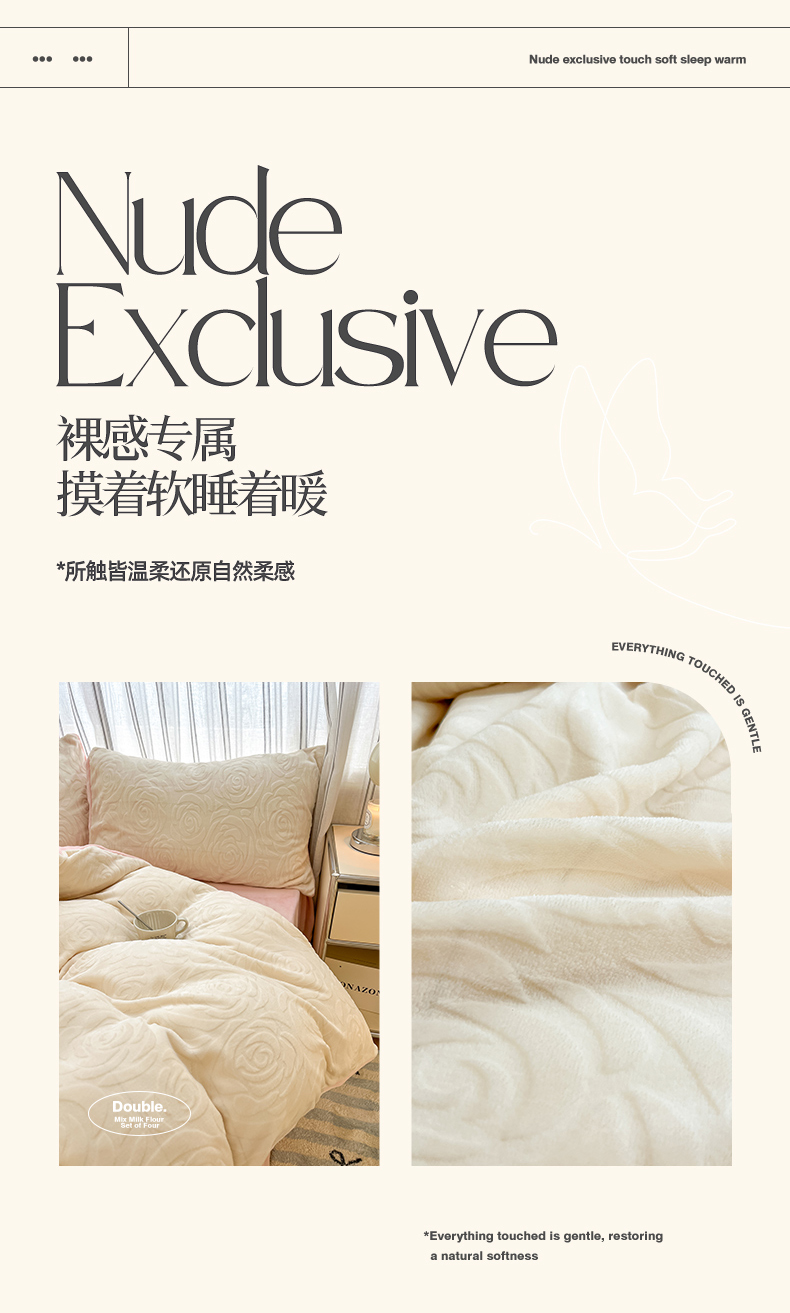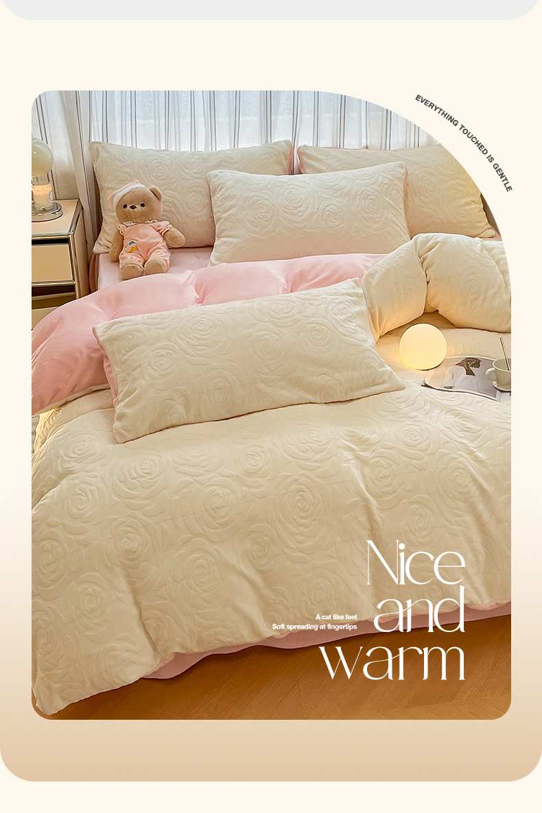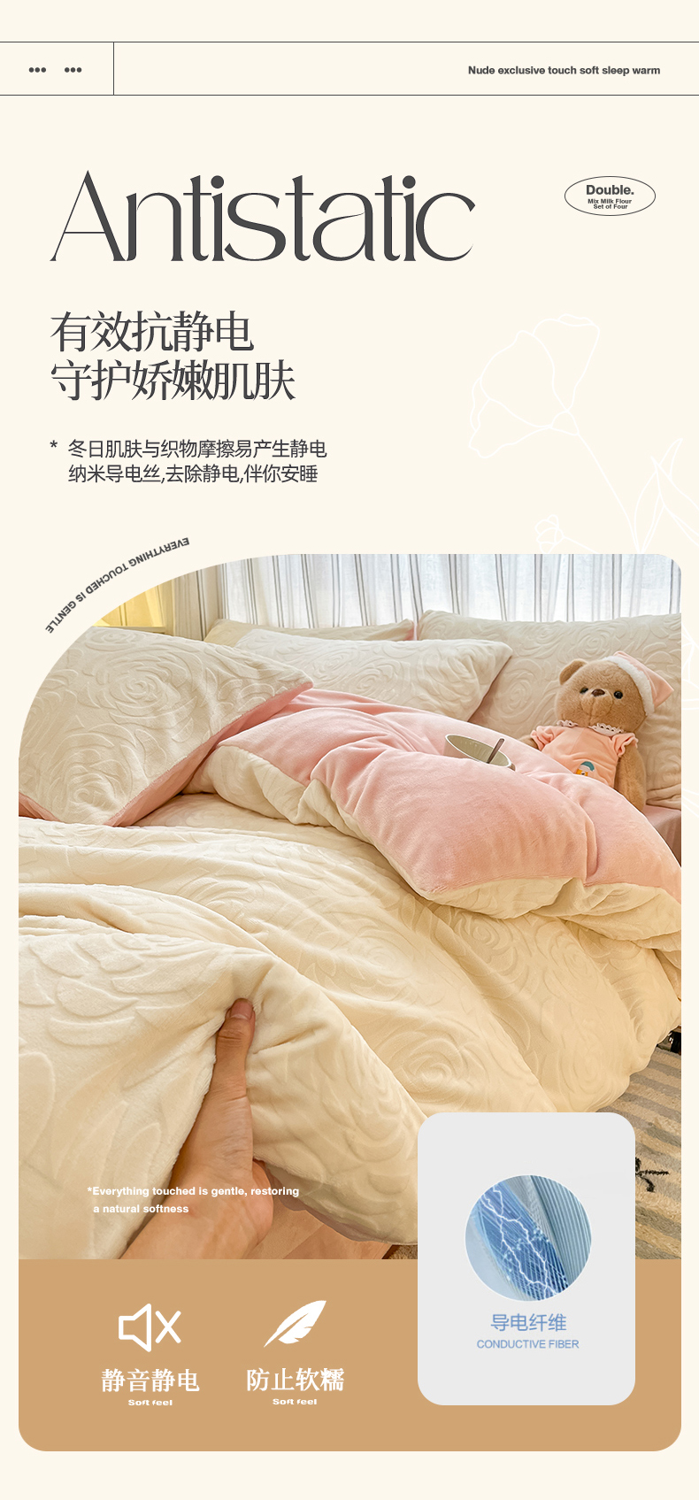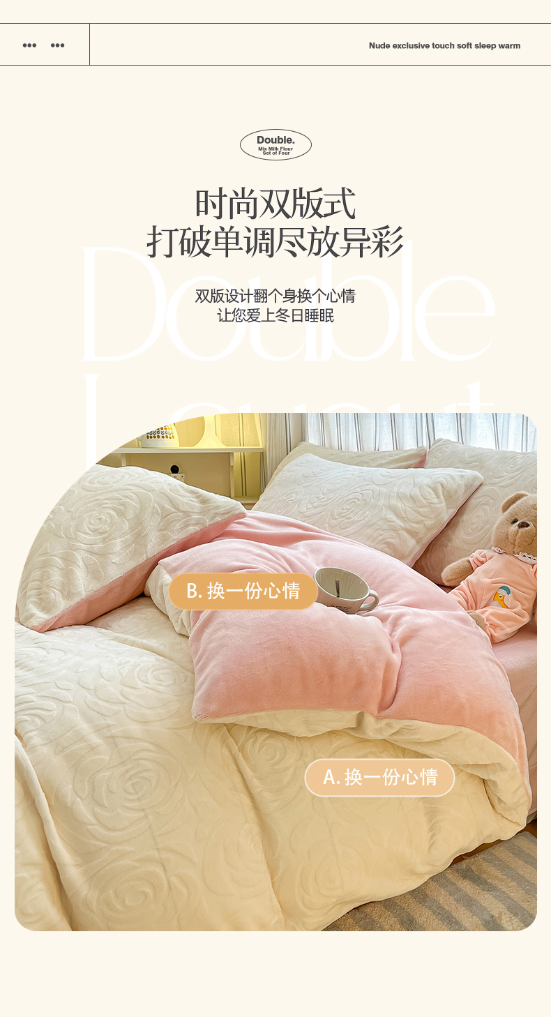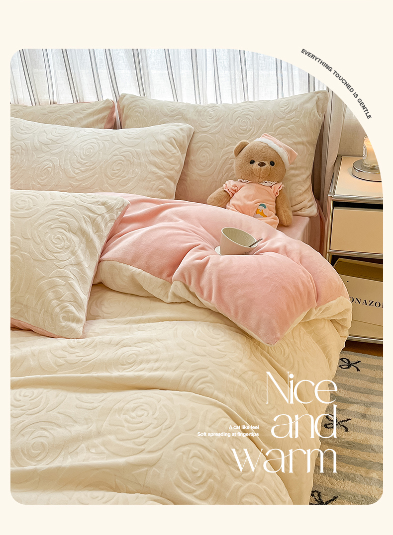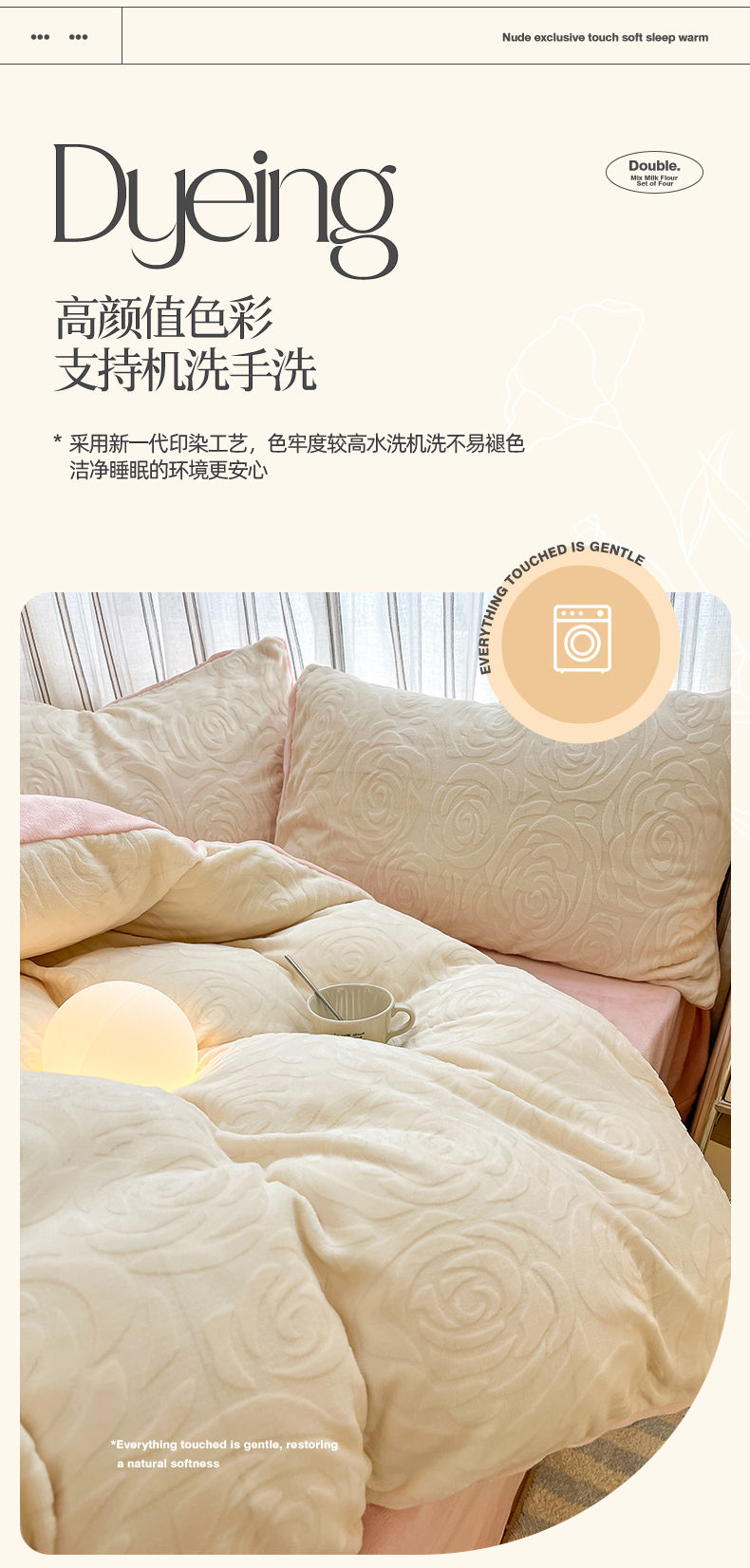 绘萱家居 2025新款高克重雕花雕印纯色牛奶绒四件套双拼法莱绒珊瑚绒 山茶庄园-奶白粉
