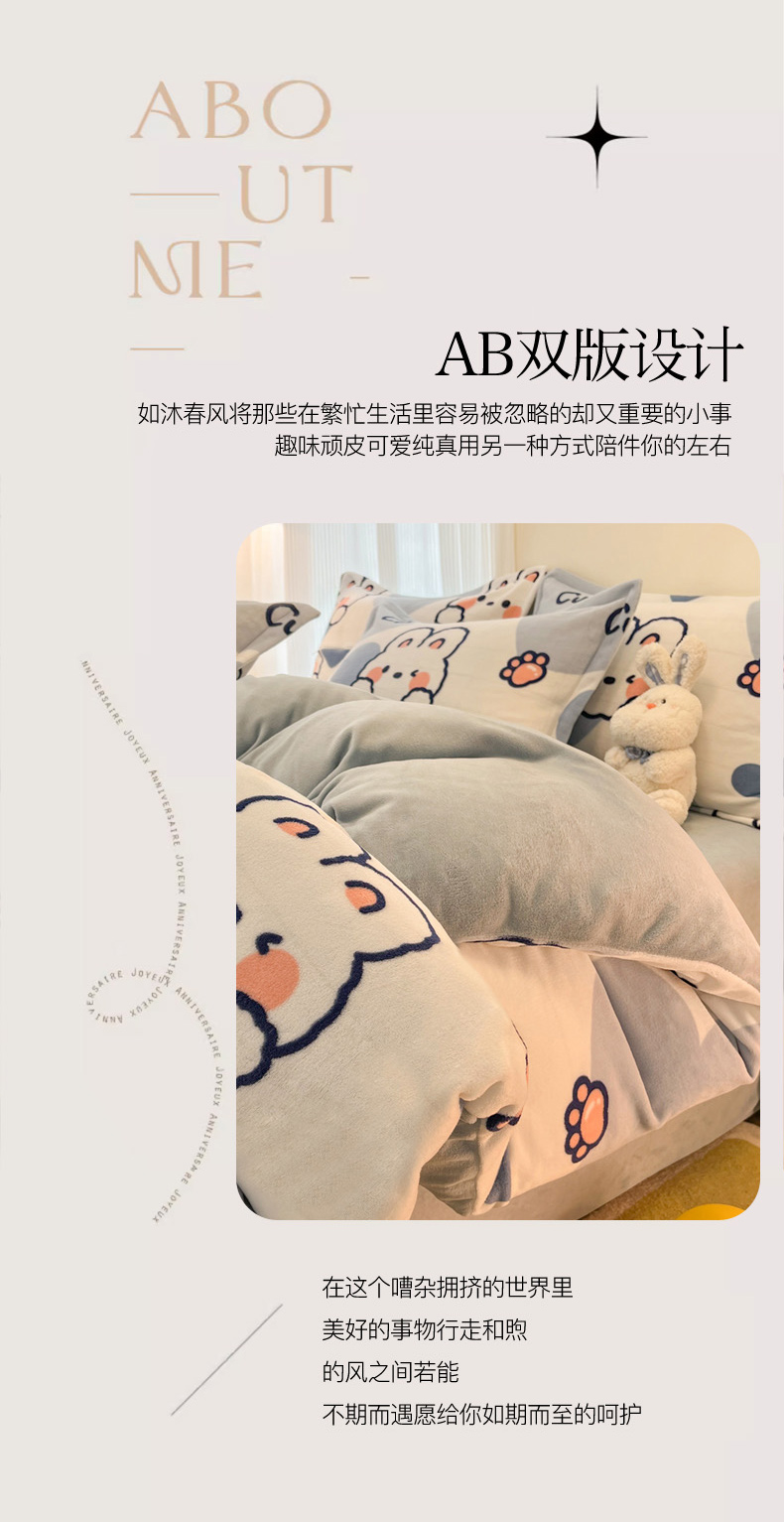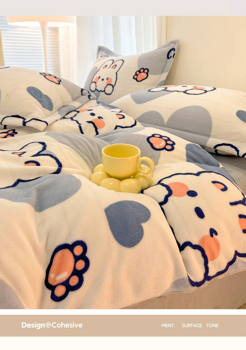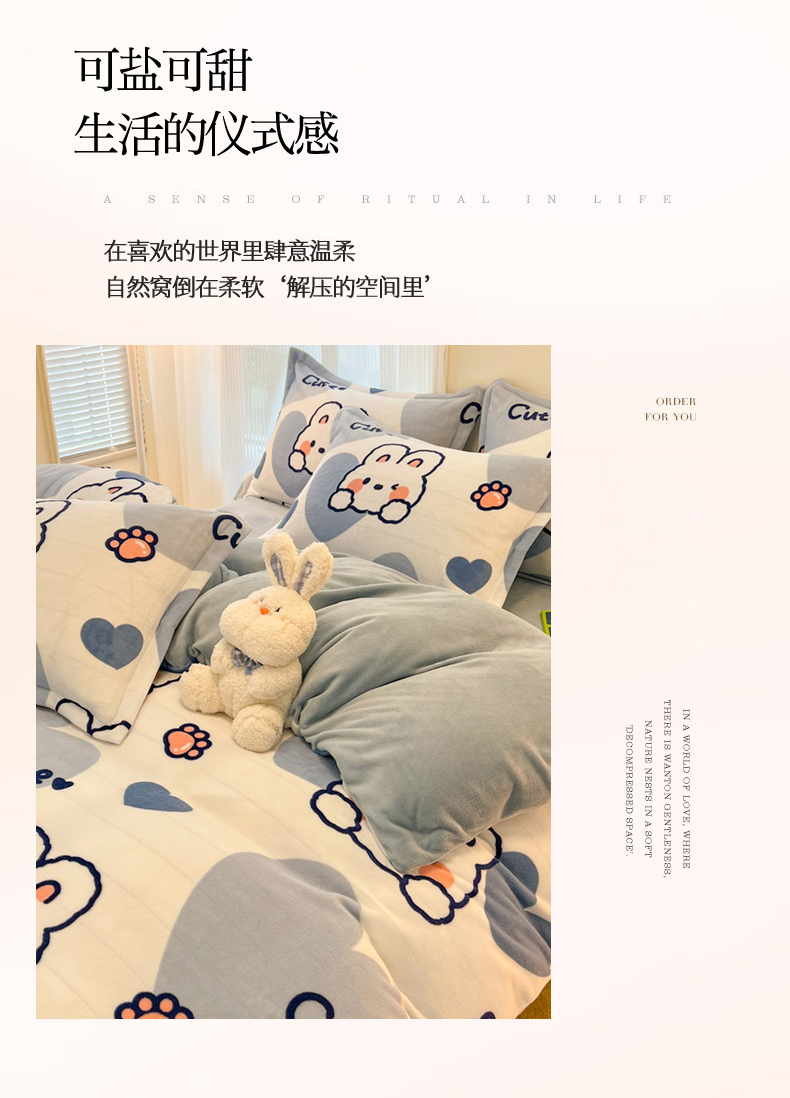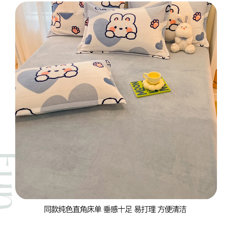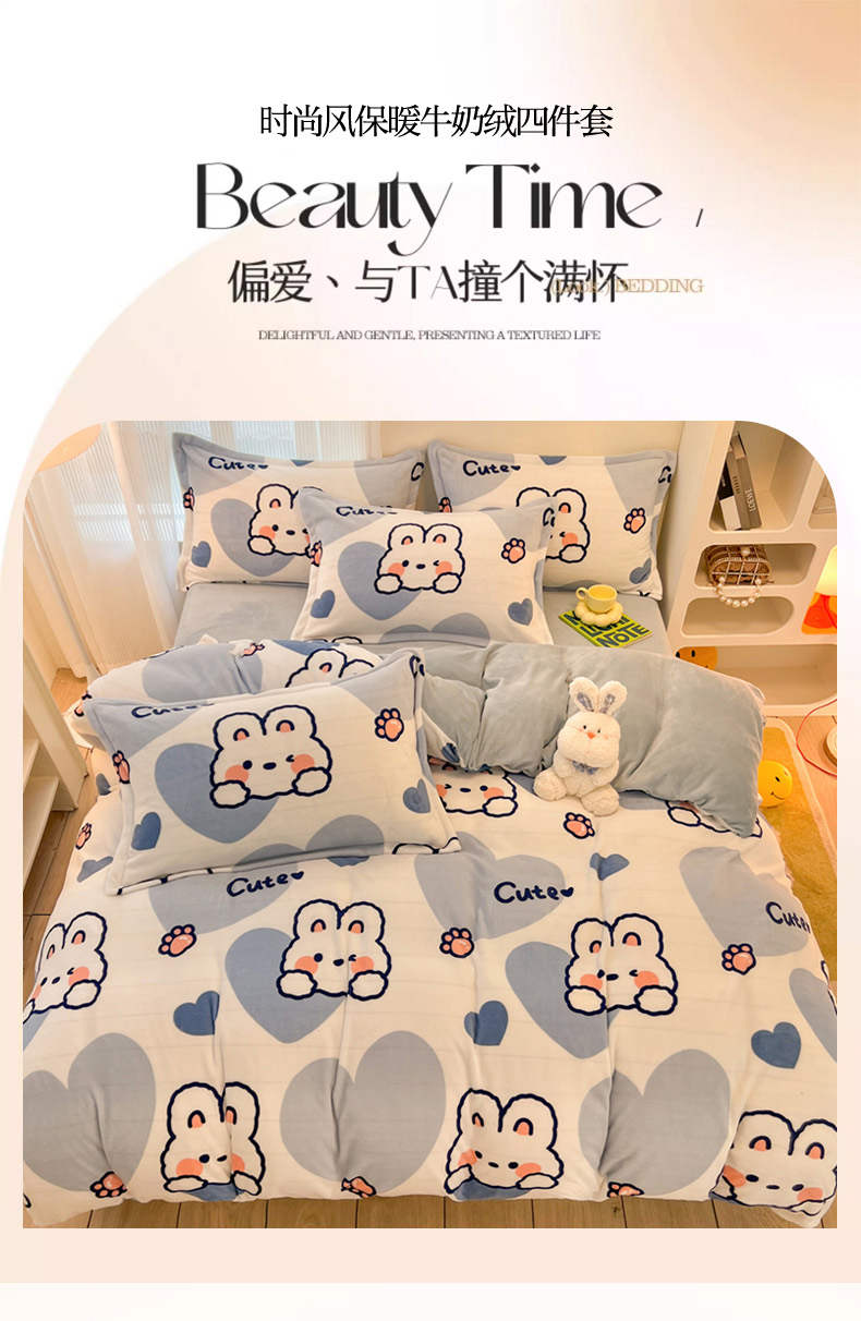 当前位置: 91家纺网 > 商品网购 > 床品套件 > 四件套 > 牛奶绒四件套 > 2024新款A类高克重时尚风牛奶绒加厚保暖系列套件单品-四件套 爱心兔