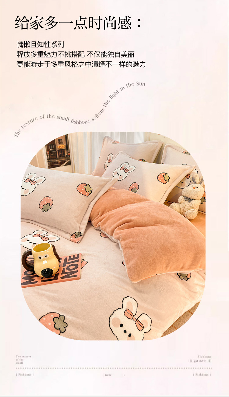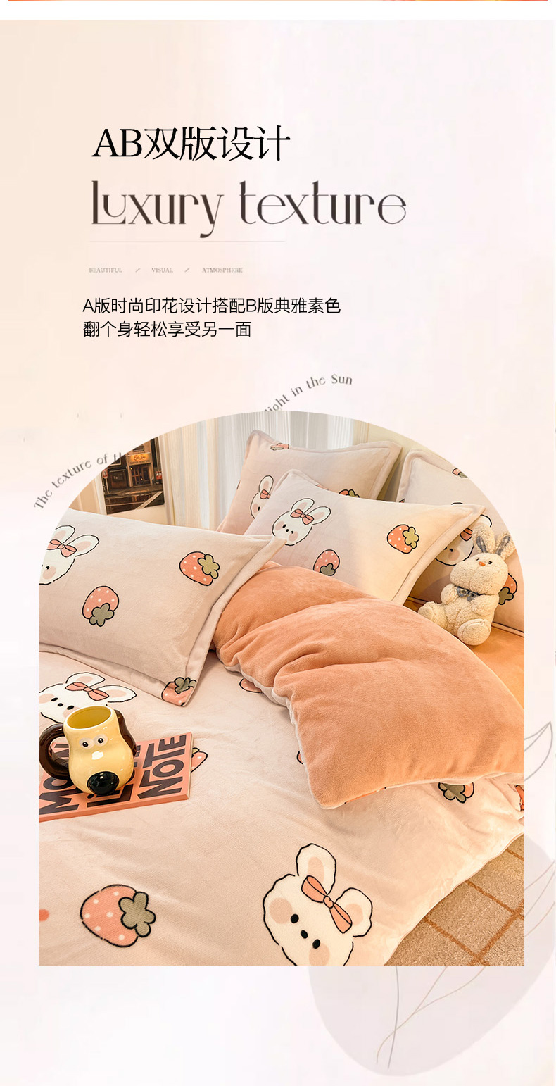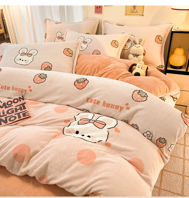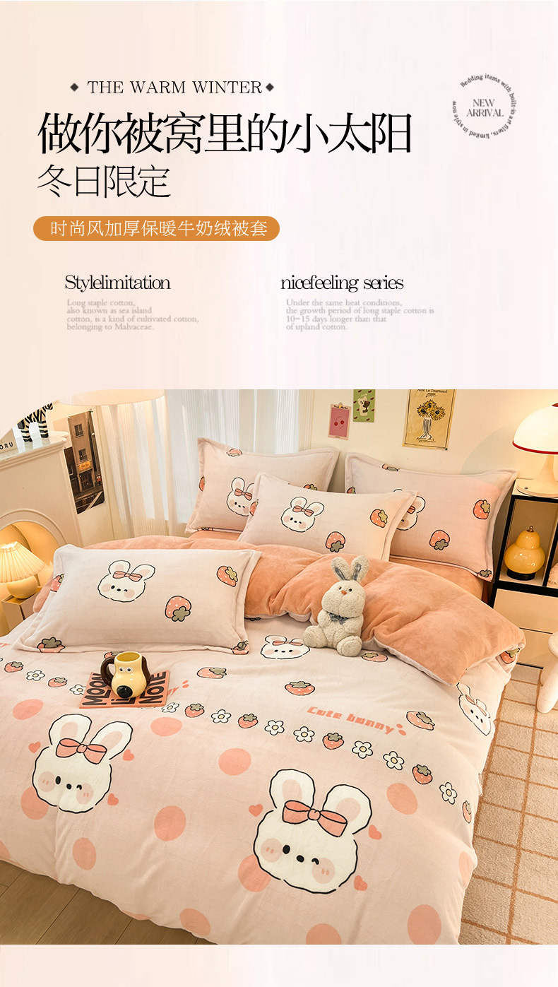 商品名称:2024新款A类高克重时尚风牛奶绒加厚保暖系列套件单品-被套 小兔草莓