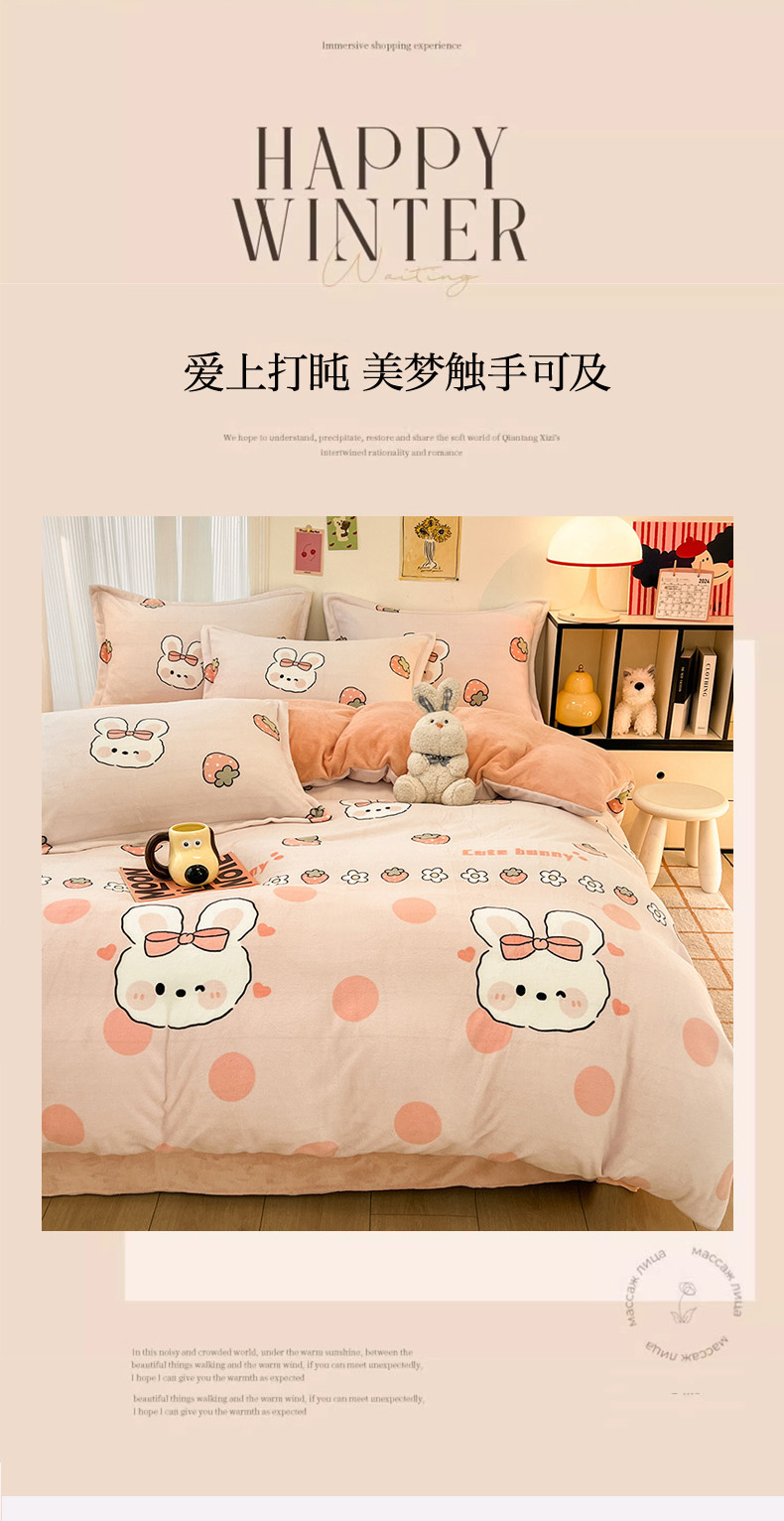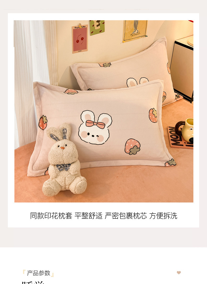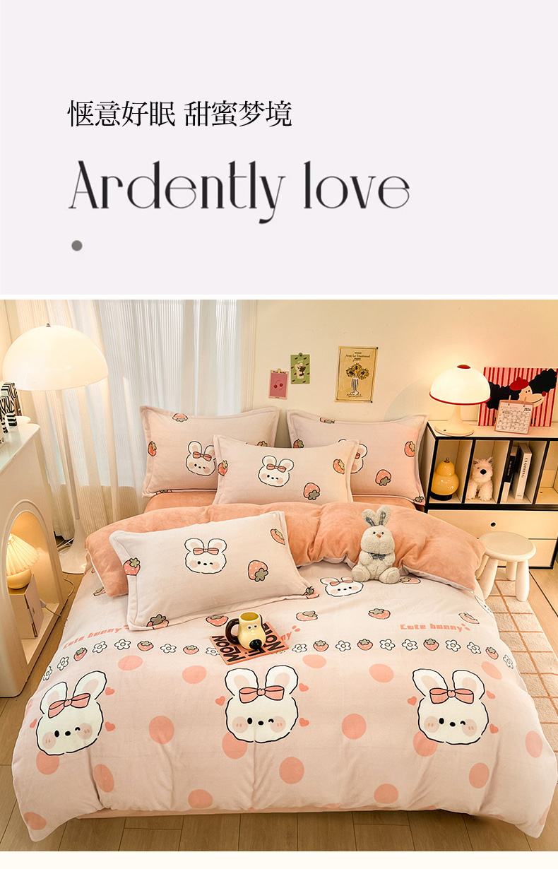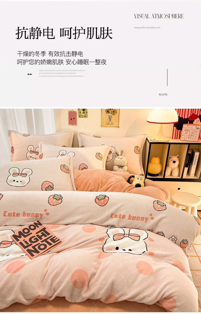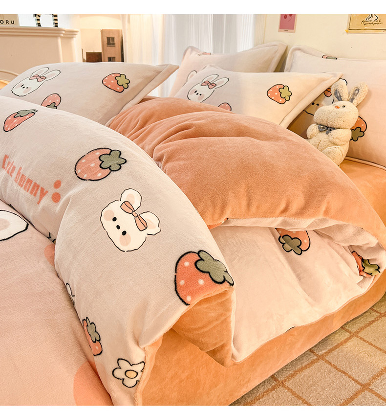 商品名称:2024新款A类高克重时尚风牛奶绒加厚保暖系列套件单品-被套 小兔草莓