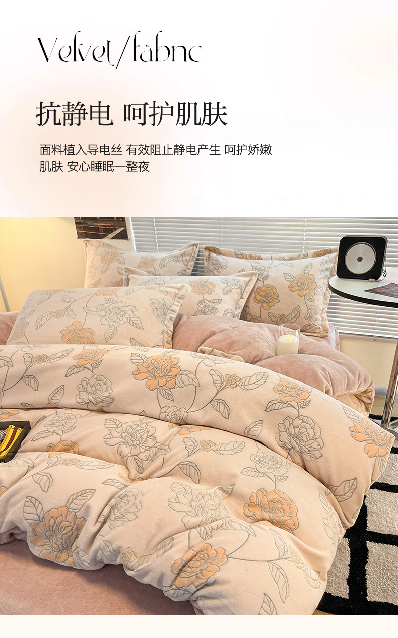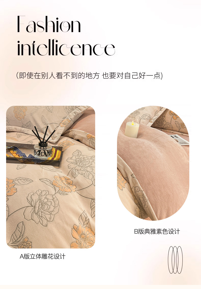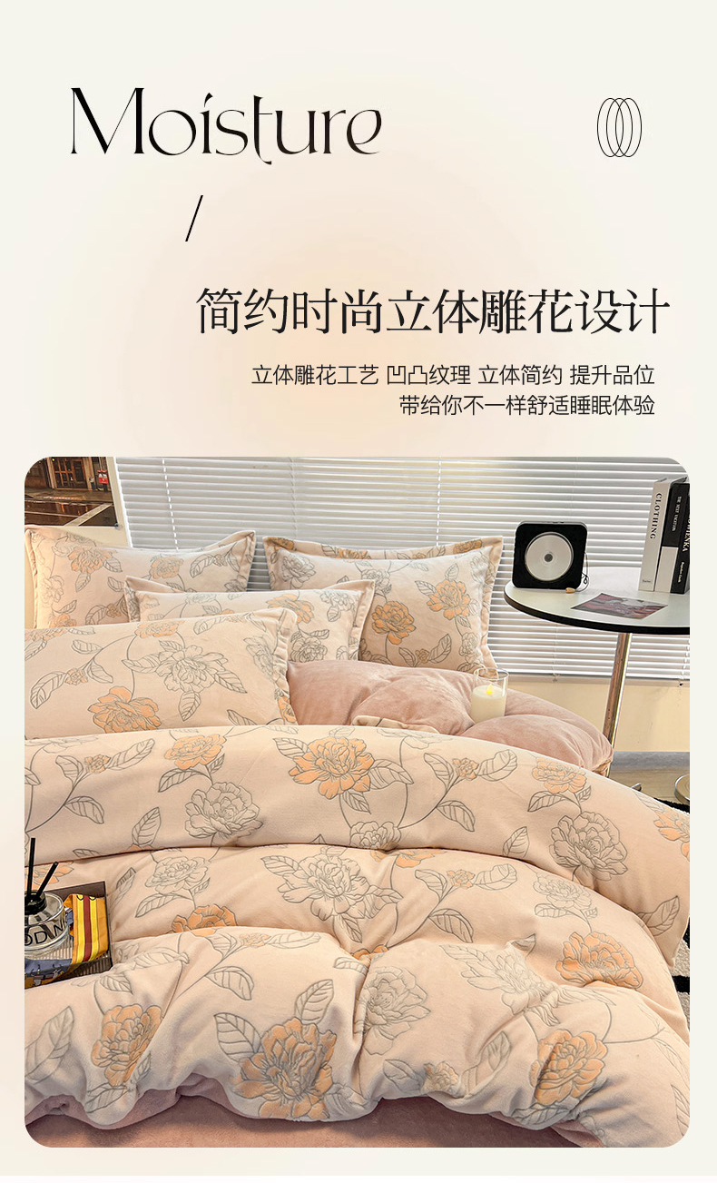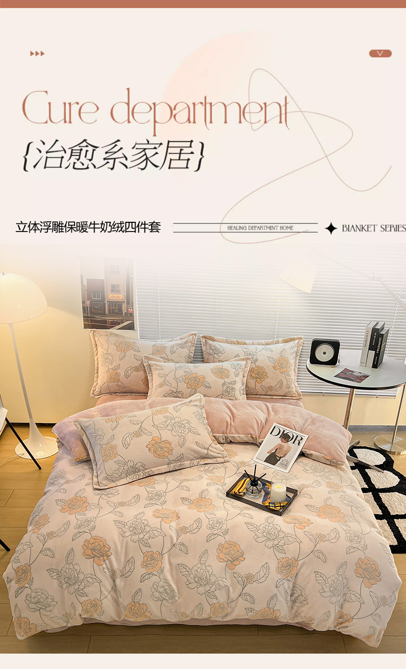 当前位置: 91家纺网 > 商品网购 > 床品套件 > 四件套 > 牛奶绒四件套 > 2024新款A类高克重立体浮雕牛奶绒加厚保暖简约风系列四件套 华恋花粉