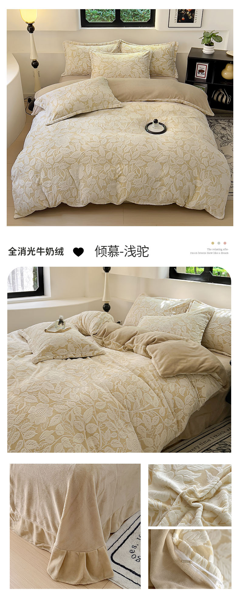 商品名称:新印象 2025新款高克重牛奶绒烂花四件套雕花绒四件套倾慕-浅驼