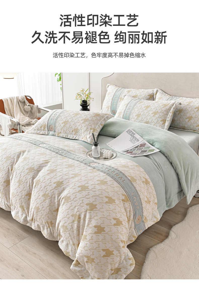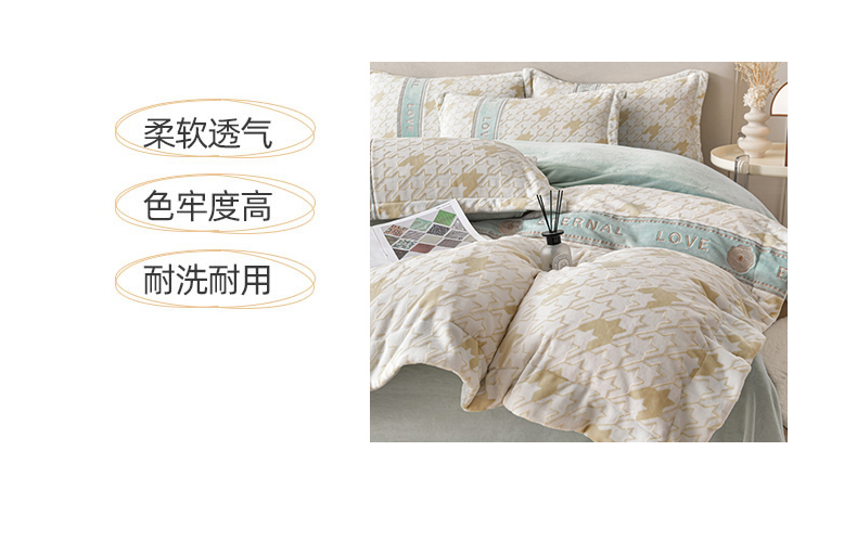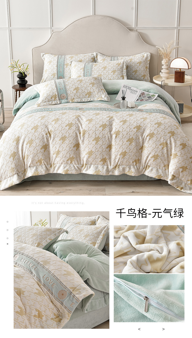 妮恒美 2024新款牛奶绒四件套雕花刺绣千鸟格法莱绒四件套 千鸟格-元气绿