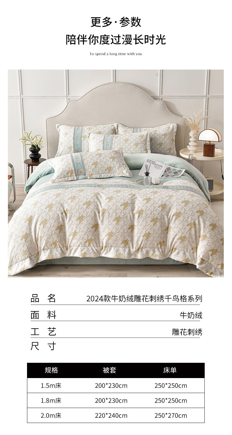 商品名称:妮恒美 2024新款牛奶绒四件套雕花刺绣千鸟格法莱绒四件套 千鸟格-元气绿