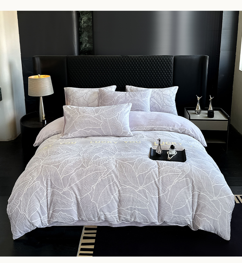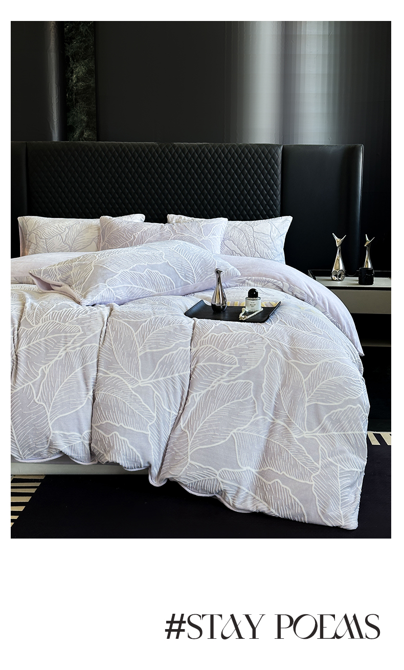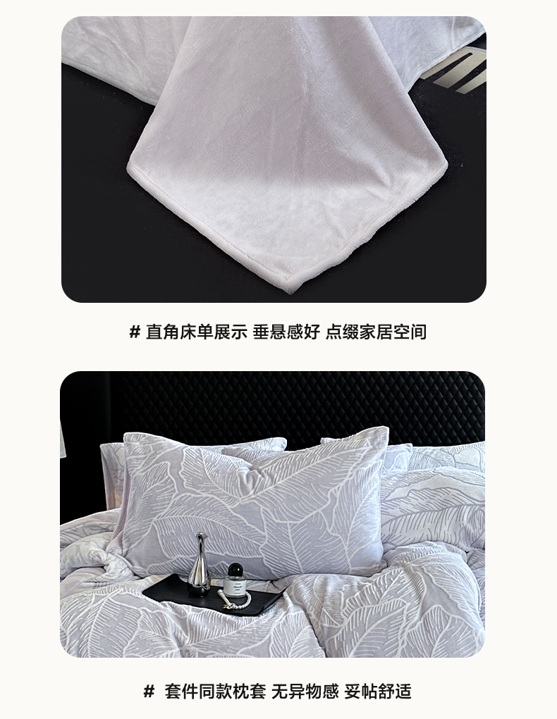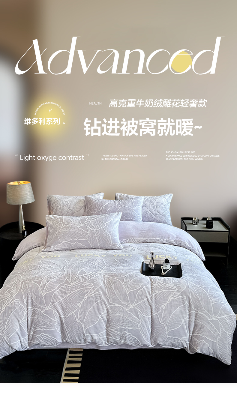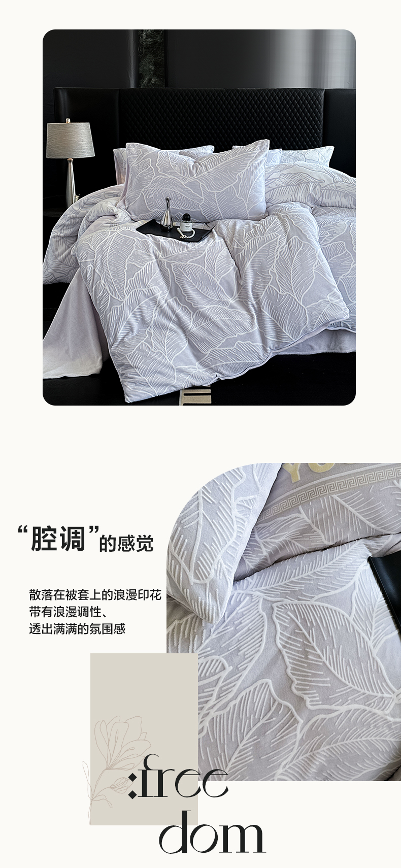 当前位置: 91家纺网 > 商品网购 > 床品套件 > 四件套 > 牛奶绒四件套 > 莱登卡奴 2024新款高克重牛奶绒雕花轻奢款四件套-维多利系列 叶魅奶昔紫