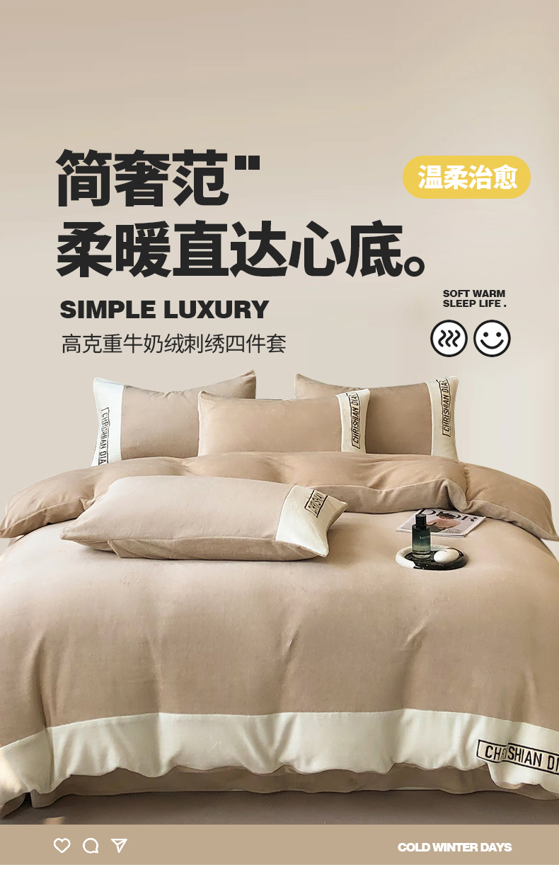 商品名称:典曼家纺 2024新款刺绣牛奶绒四件套-妮可 卡其-白