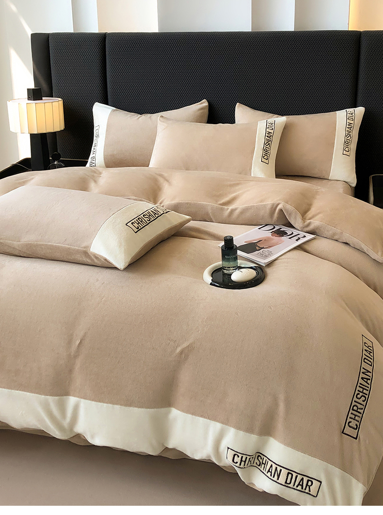 典曼家纺 2024新款刺绣牛奶绒四件套-妮可 卡其-白