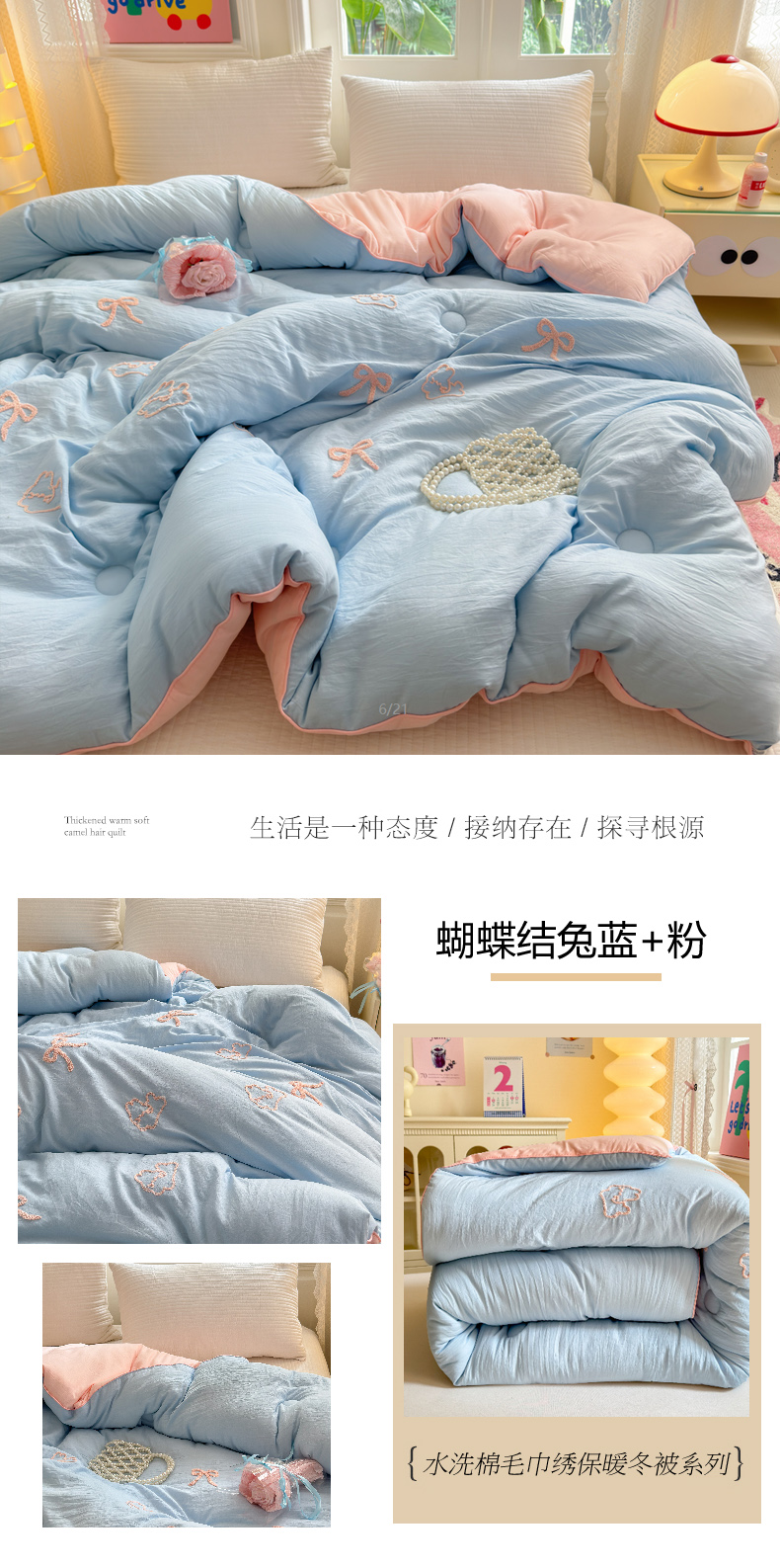 商品名称:花伞 2024新款INS小红书毛巾绣水洗棉冬被 蝴蝶结兔蓝+粉