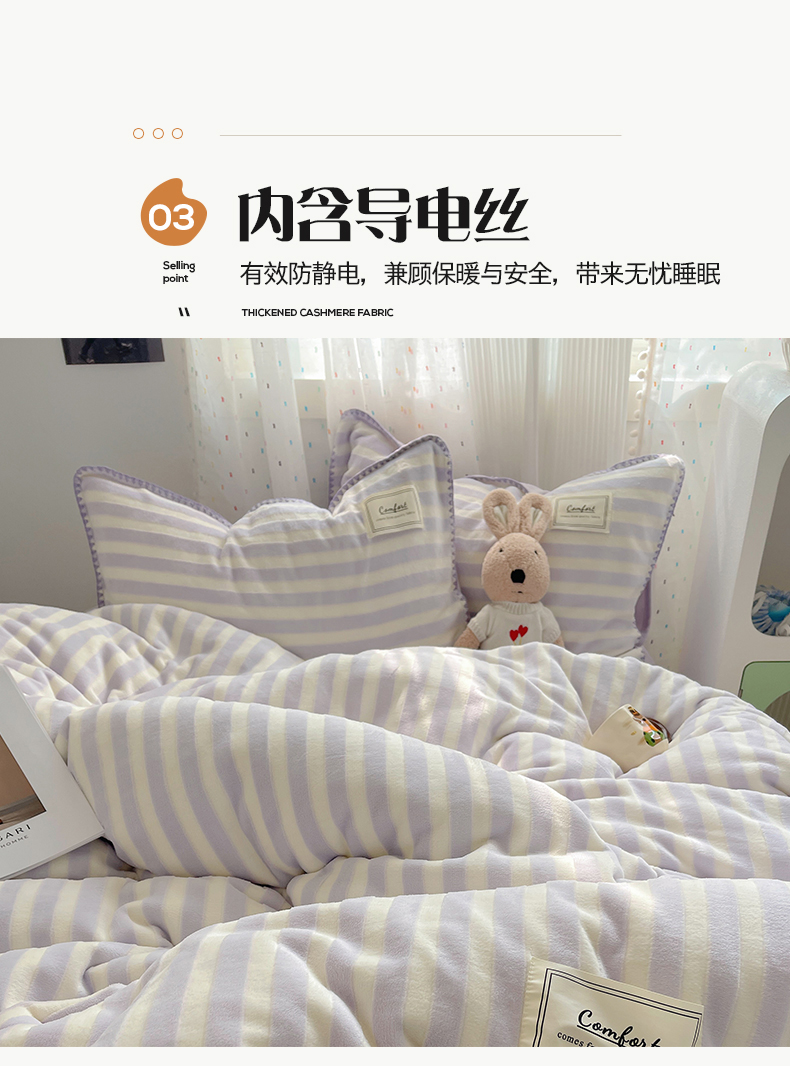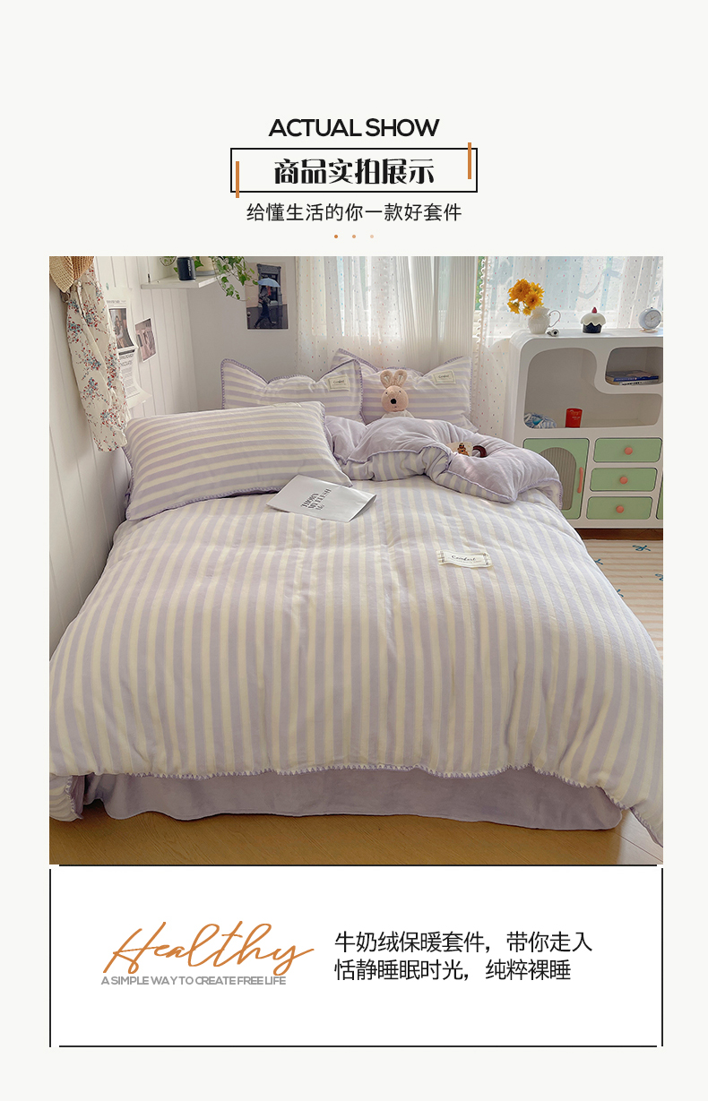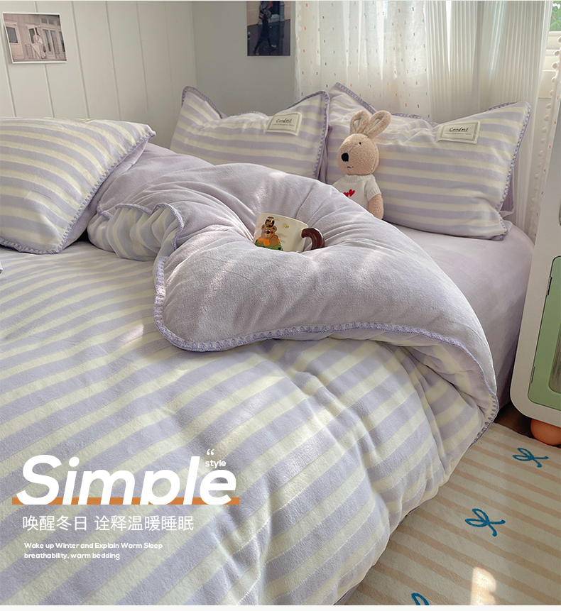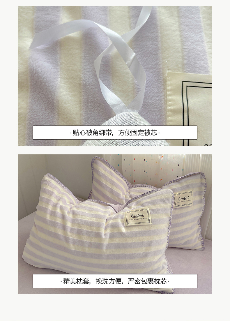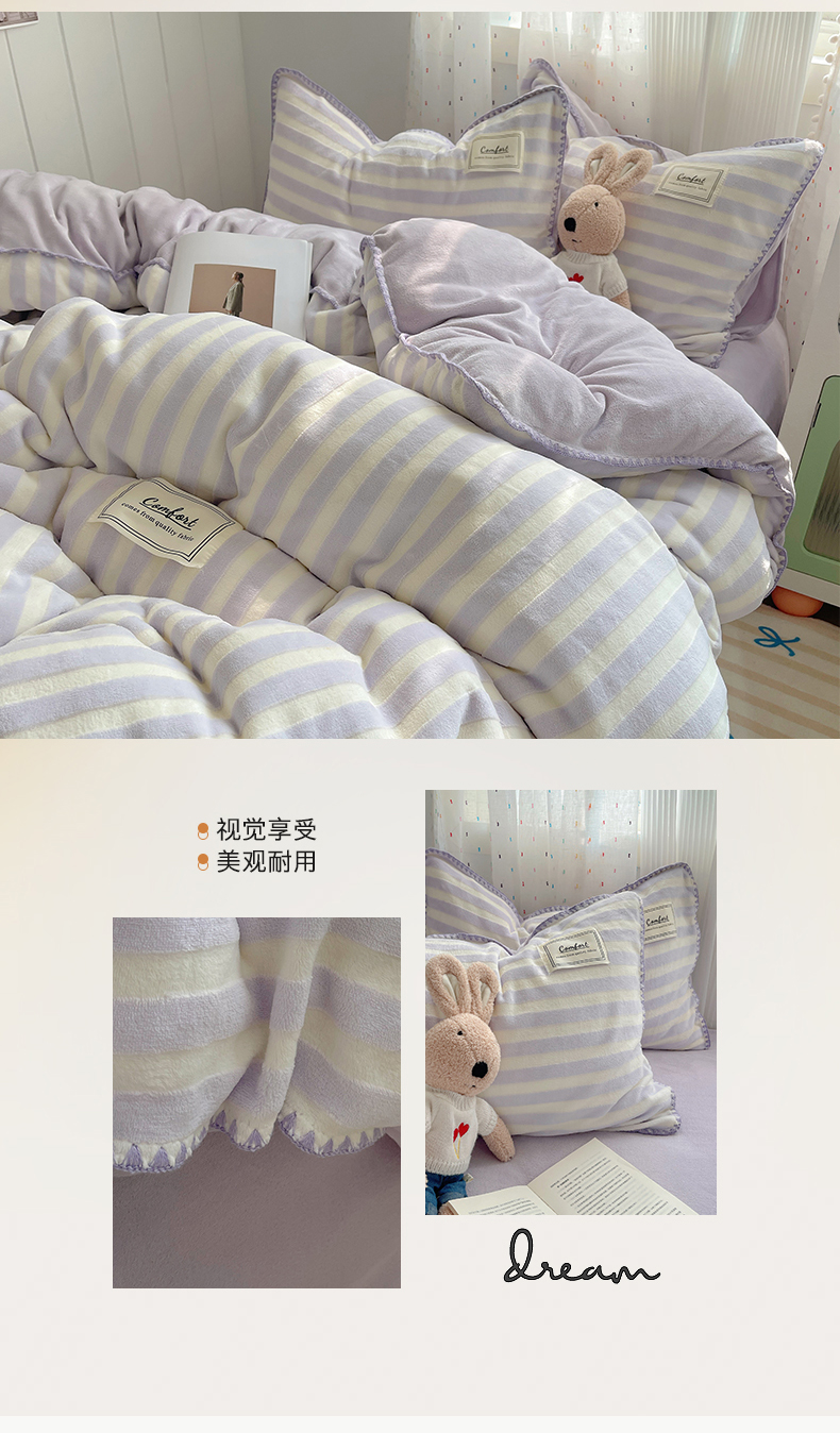 商品名称:桃子家居 2024新款A类ins无印格子条条简约撞色马卡龙立体提花烂花雕花三角贝壳边织标工艺加厚牛奶绒四件套 绒三角针-紫条紫紫