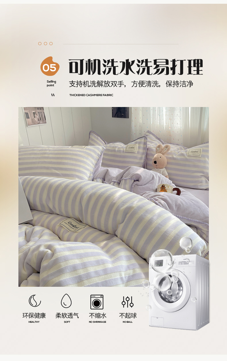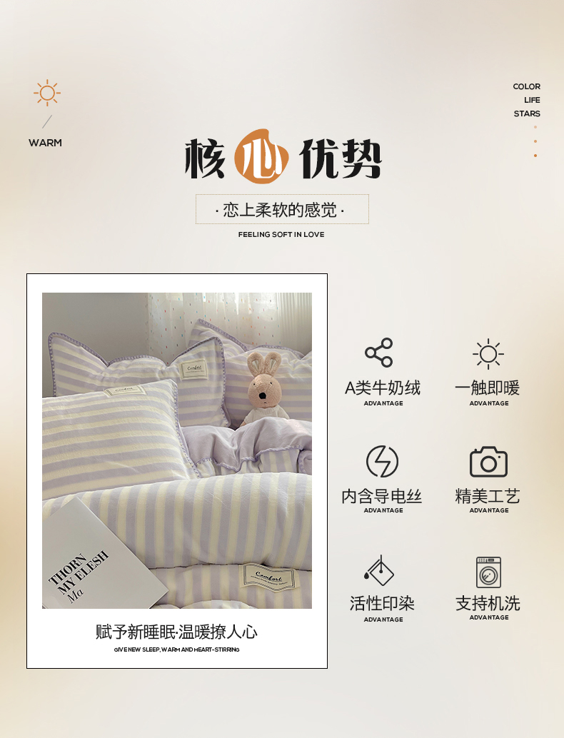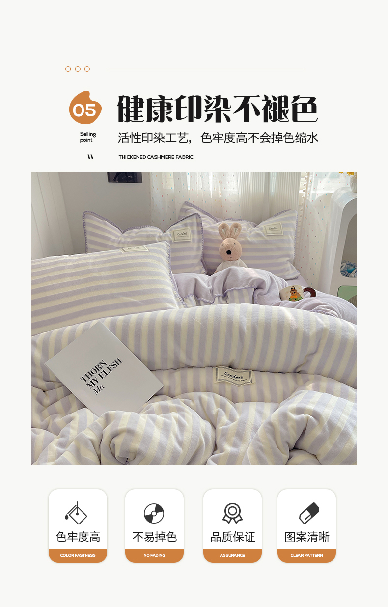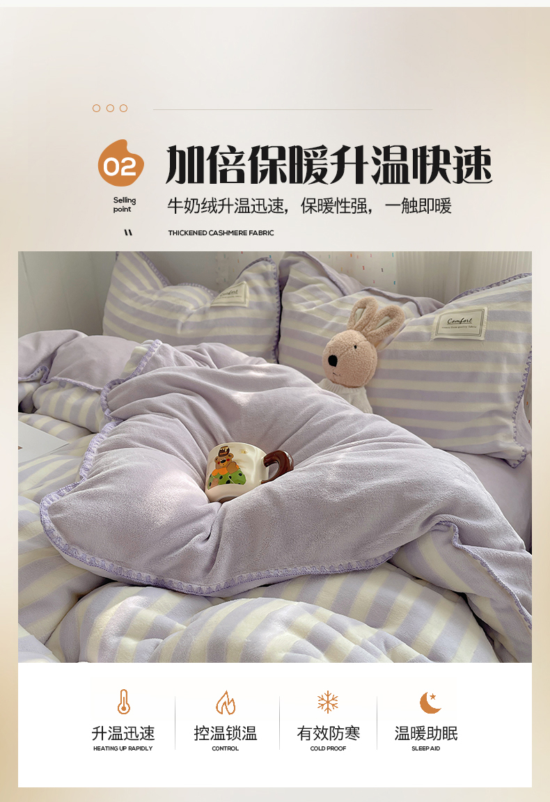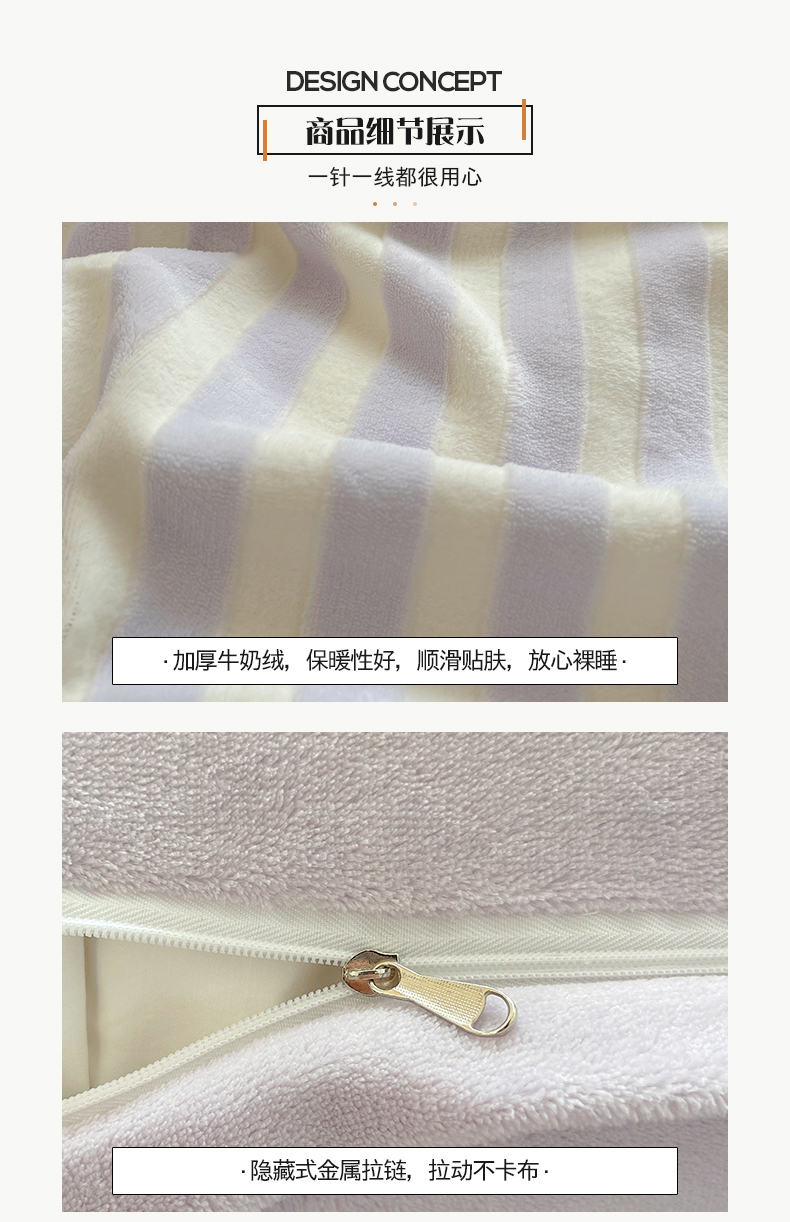 商品名称:桃子家居 2024新款A类ins无印格子条条简约撞色马卡龙立体提花烂花雕花三角贝壳边织标工艺加厚牛奶绒四件套 绒三角针-紫条紫紫
