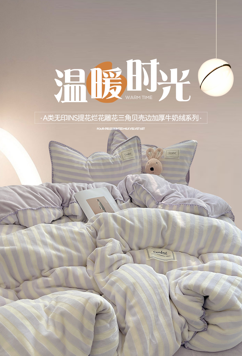 桃子家居 2024新款A类ins无印格子条条简约撞色马卡龙立体提花烂花雕花三角贝壳边织标工艺加厚牛奶绒四件套 绒三角针-紫条紫紫