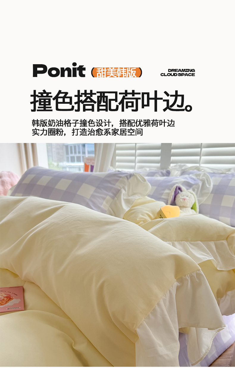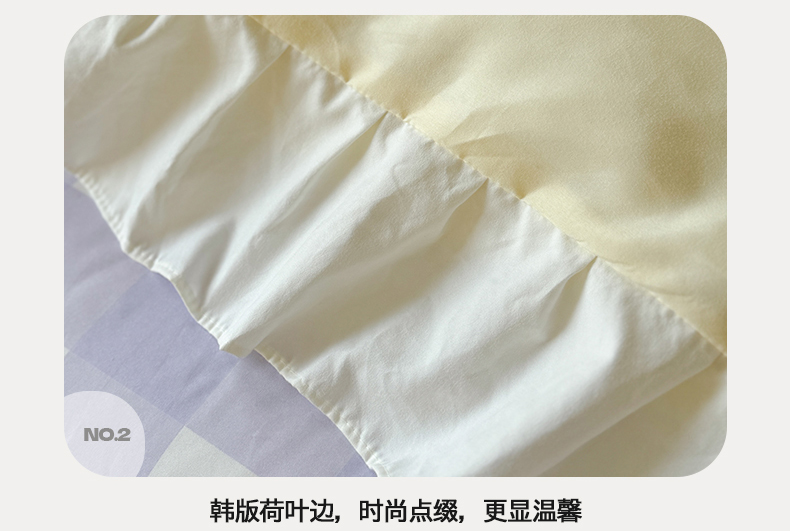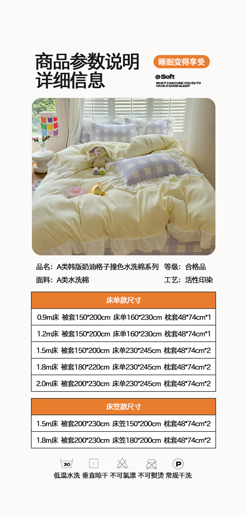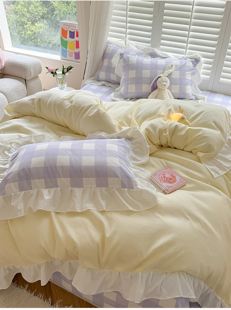 当前位置: 91家纺网 > 商品网购 > 床品套件 > 四件套 > 水洗棉四件套 > 桃心家居 2024新款A类亲肤舒适软糯云柔水洗棉化纤韩版奶油格子撞色水洗棉系列四件套 水洗棉花边-H黄黄紫格