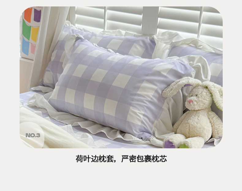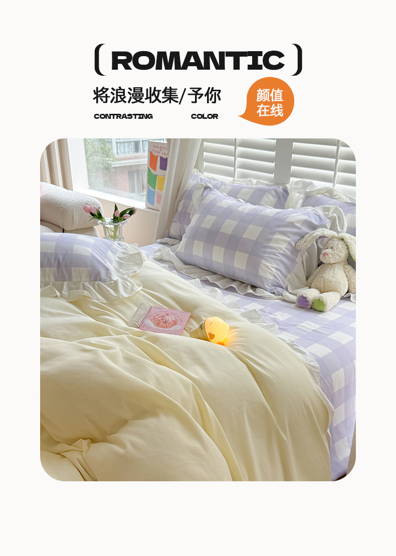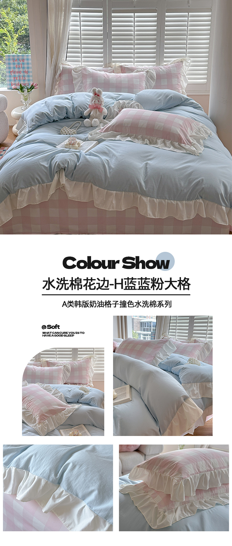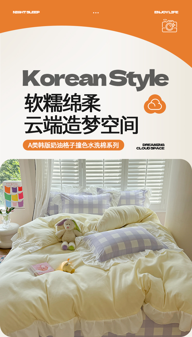 当前位置: 91家纺网 > 商品网购 > 床品套件 > 四件套 > 水洗棉四件套 > 桃心家居 2024新款A类亲肤舒适软糯云柔水洗棉化纤韩版奶油格子撞色水洗棉系列四件套 水洗棉花边-H黄黄紫格