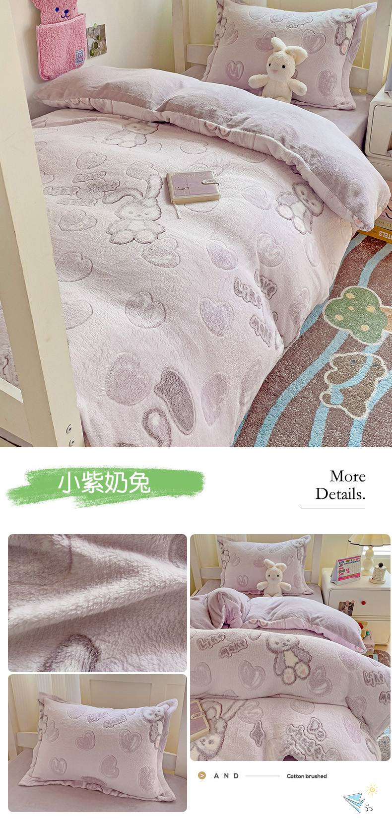 当前位置: 91家纺网 > 商品网购 > 床品套件 > 三件套 > 贝扬思家纺 2024新款加厚雪花绒印花三件套 小紫奶兔