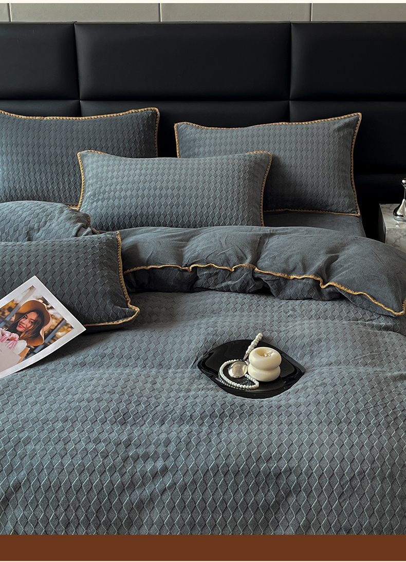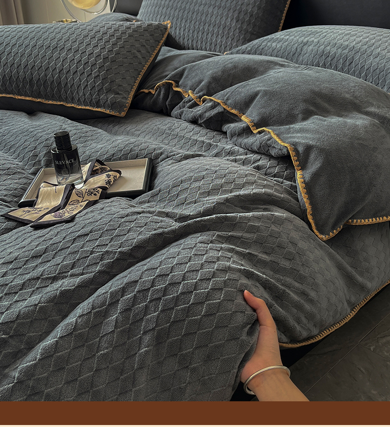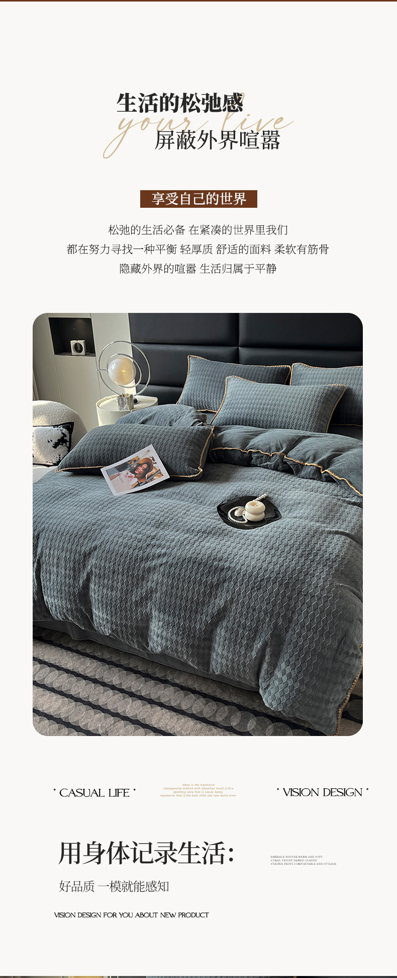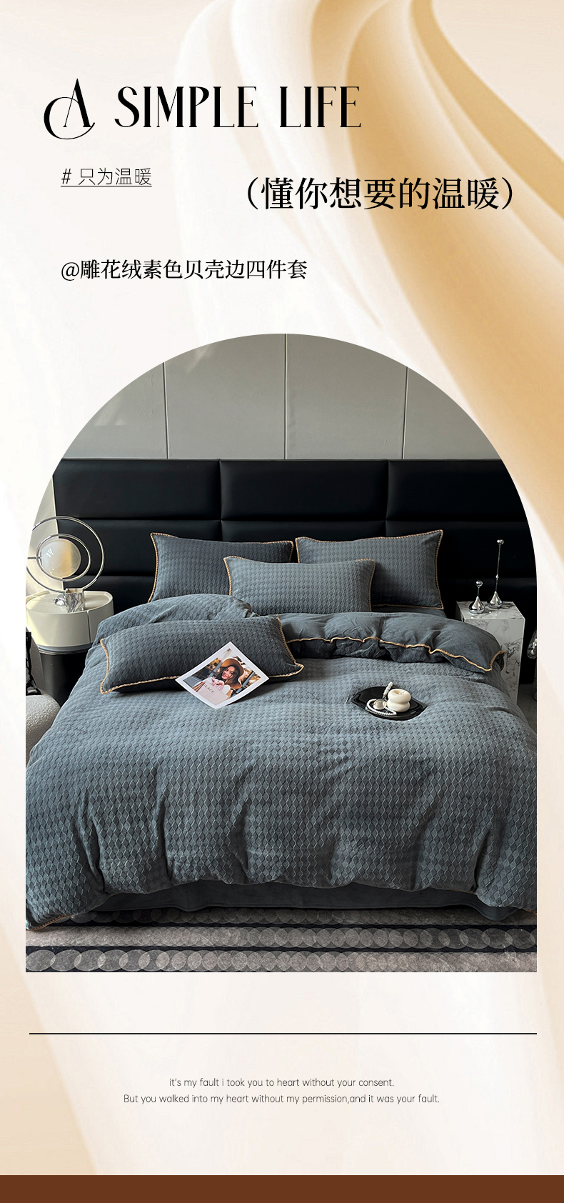 当前位置: 91家纺网 > 商品网购 > 床品套件 > 四件套 > 雕花绒四件套 > 菡宝 2024新款贝壳边无印风230g雕花绒床单四件套 菱形格-深灰