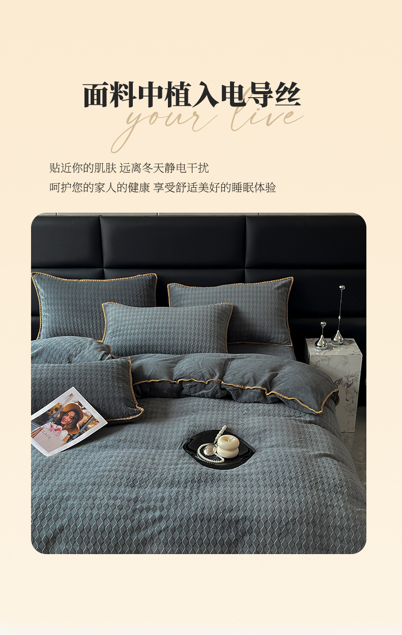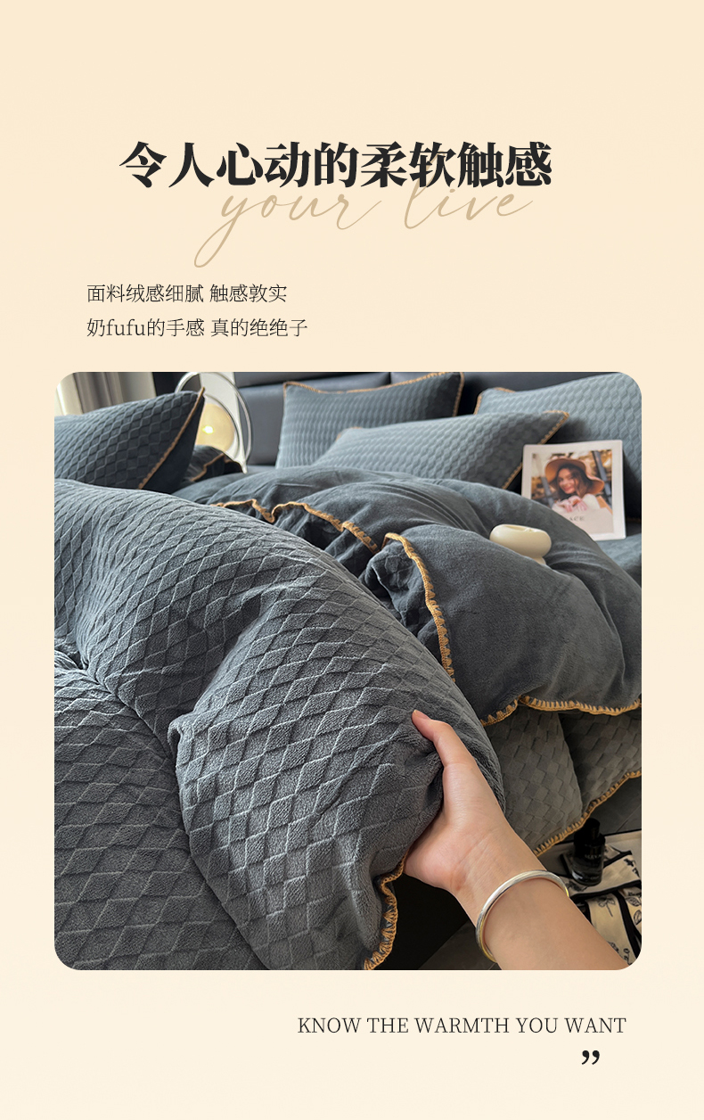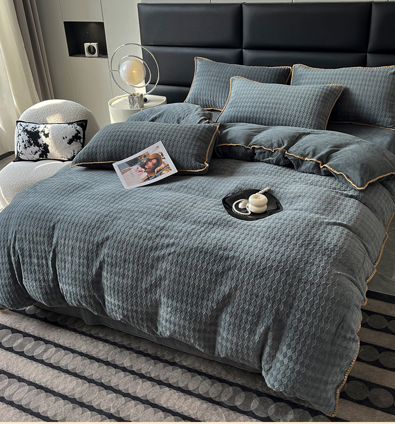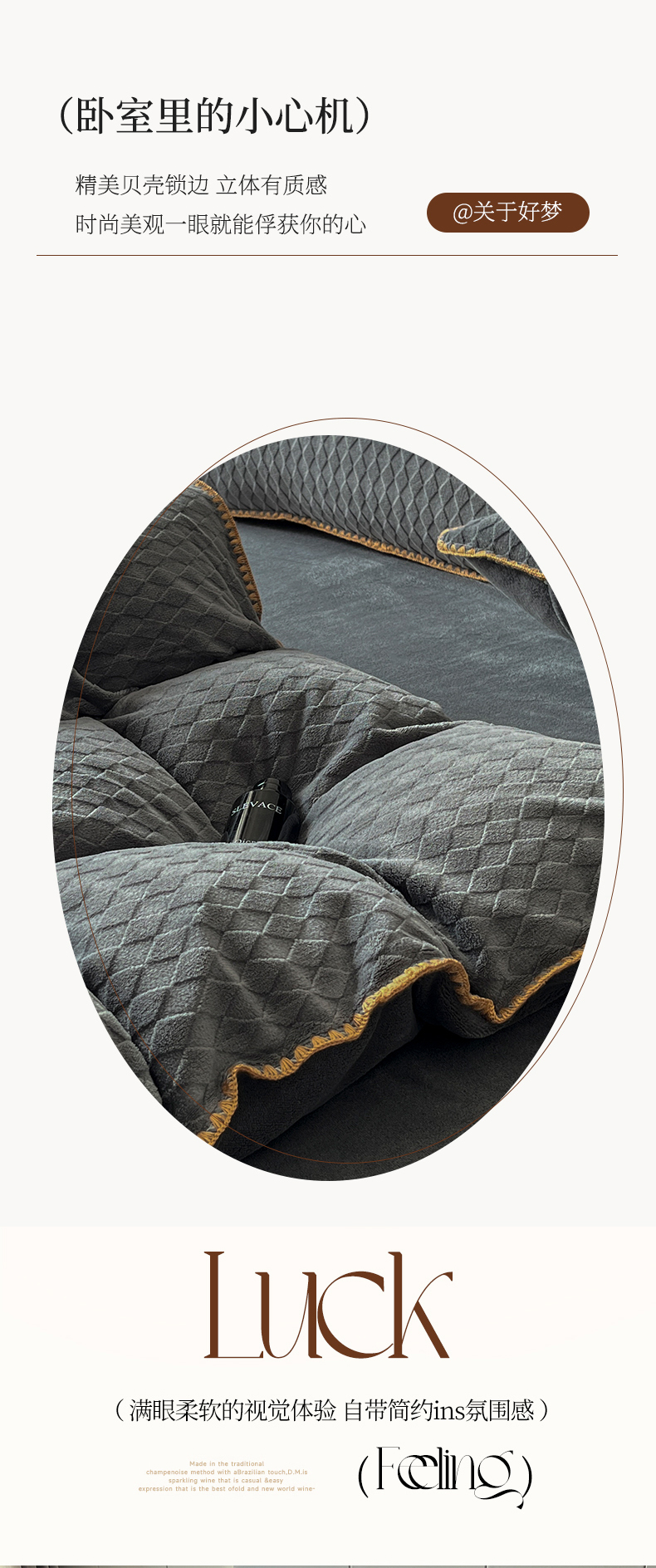 当前位置: 91家纺网 > 商品网购 > 床品套件 > 四件套 > 雕花绒四件套 > 菡宝 2024新款贝壳边无印风230g雕花绒床单四件套 菱形格-深灰