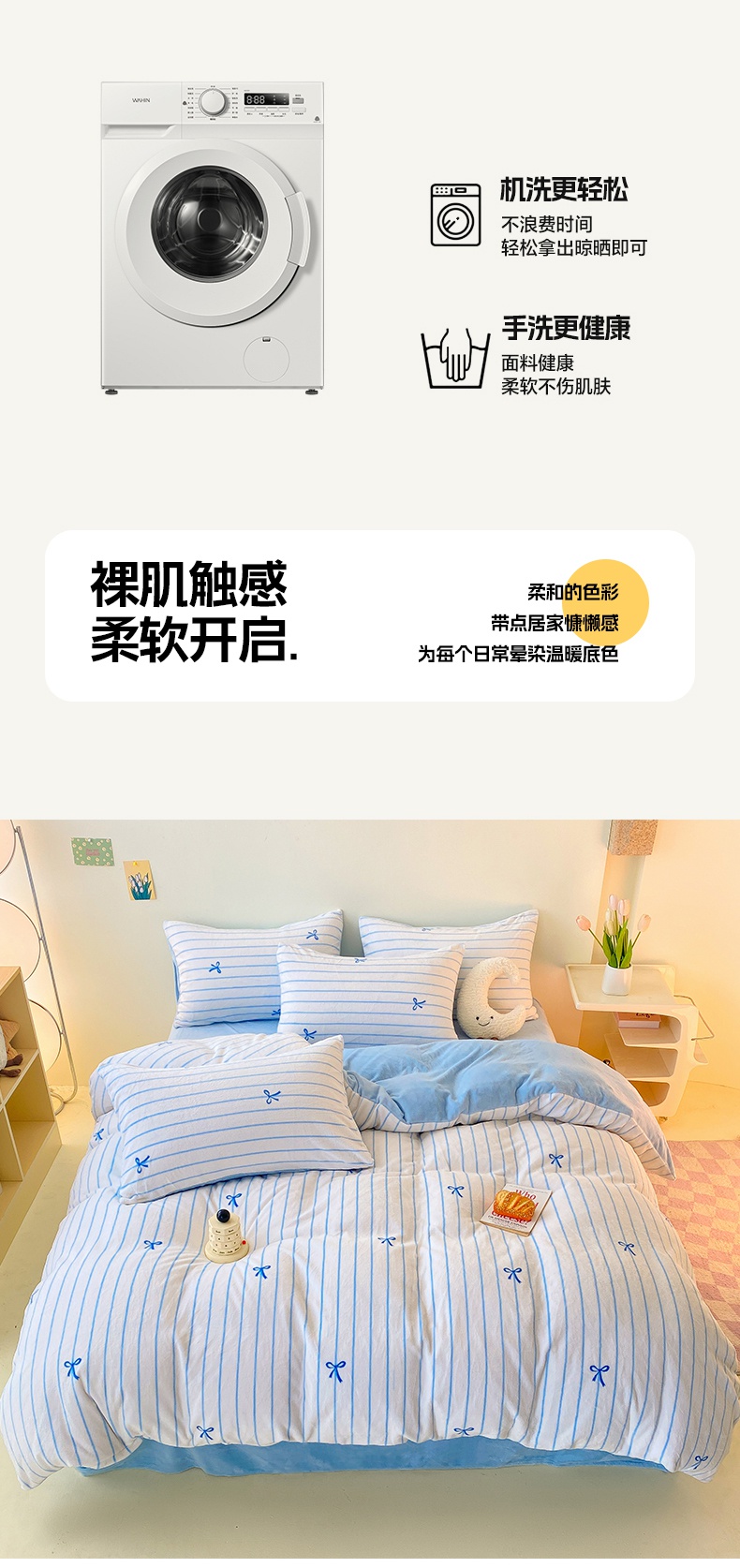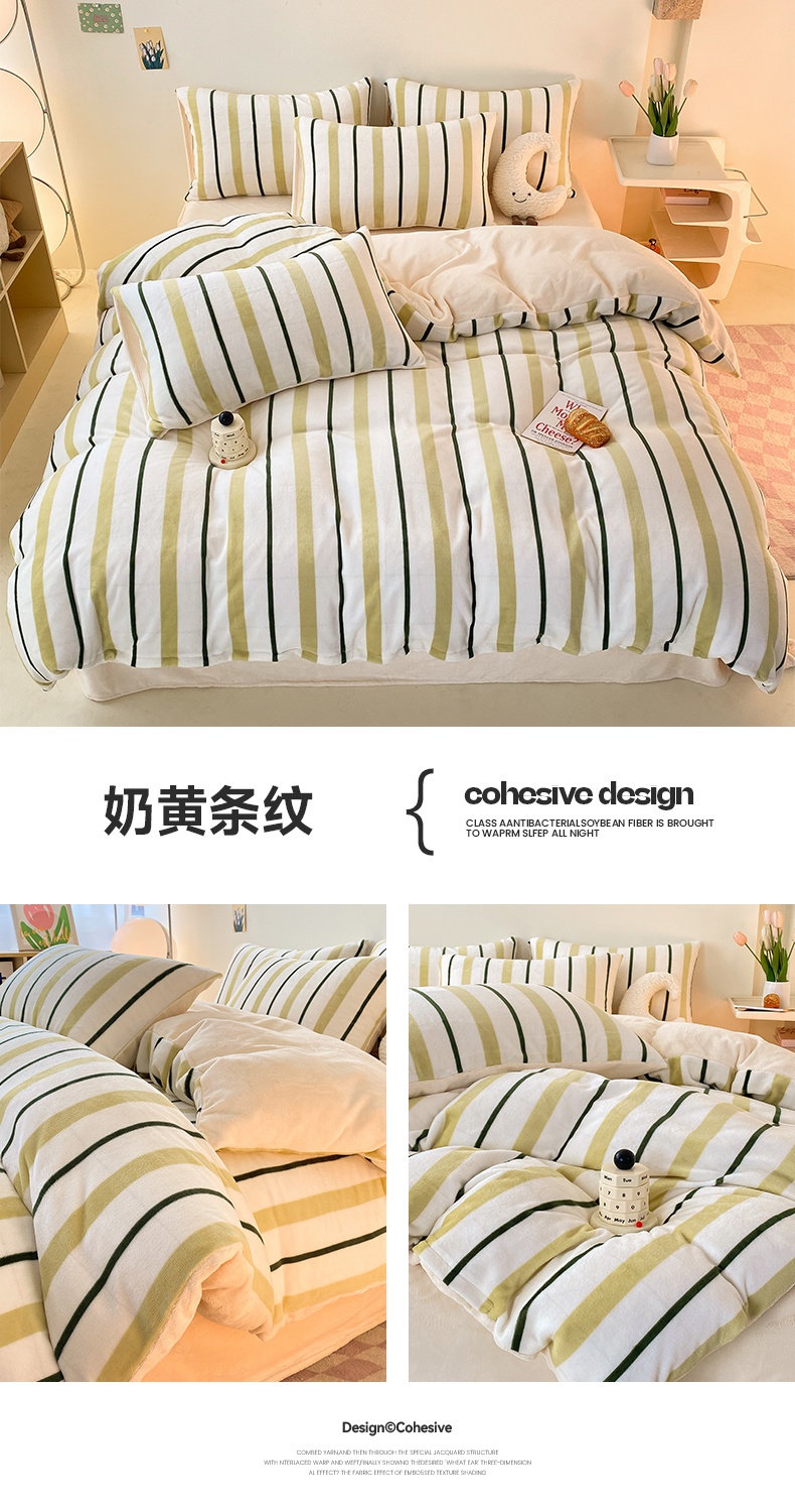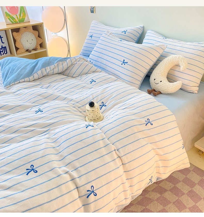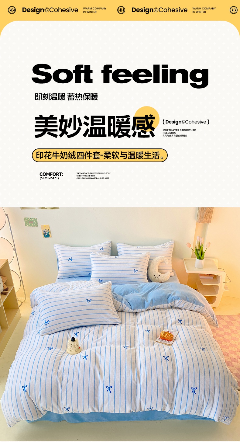 2024新款高克重印花牛奶绒四件套条纹风格二 采花小兔