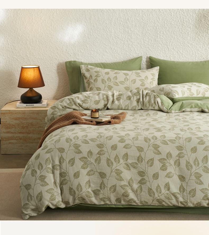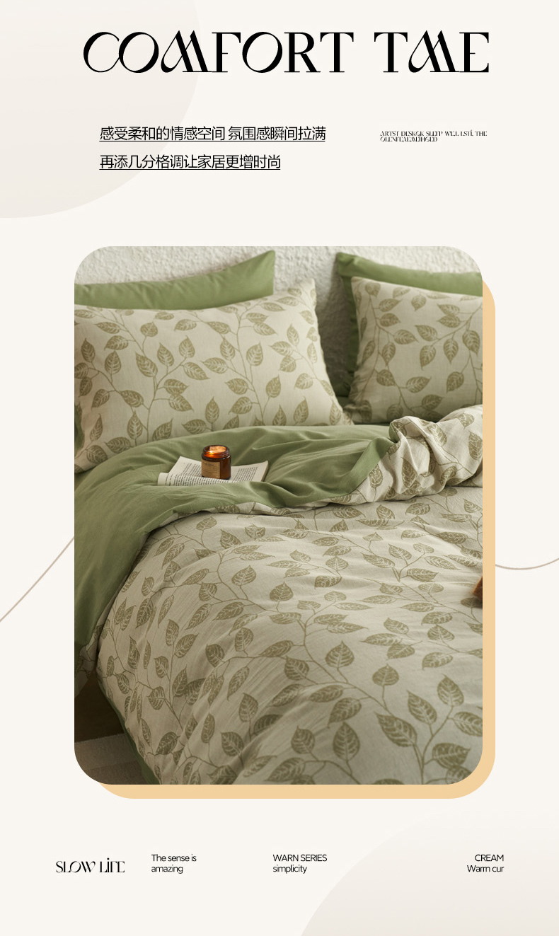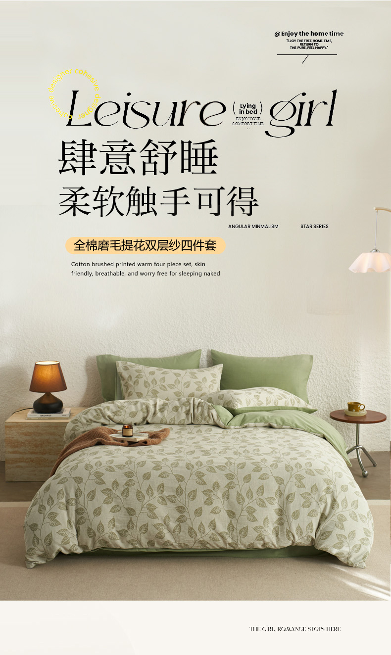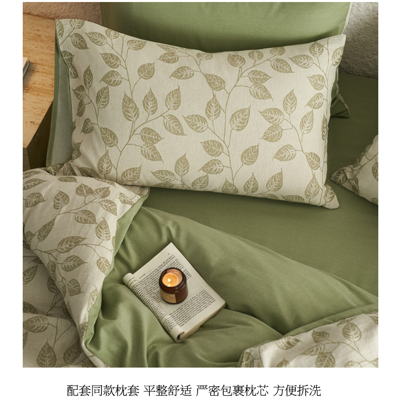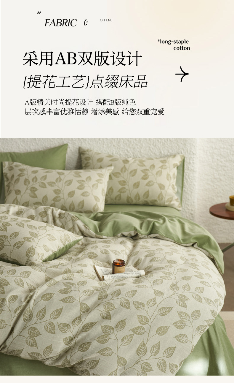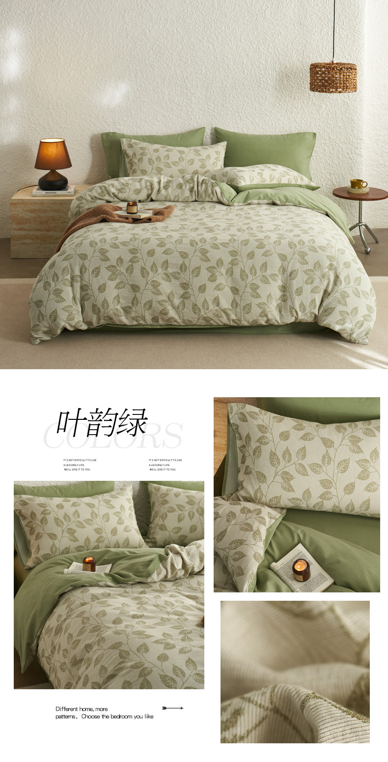当前位置: 91家纺网 > 商品网购 > 床品套件 > 四件套 > 普通磨毛四件套 > 慕尚家纺 2025新款磨毛提花双层纱四件套 叶韵绿