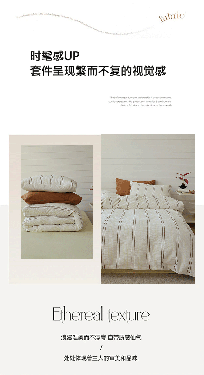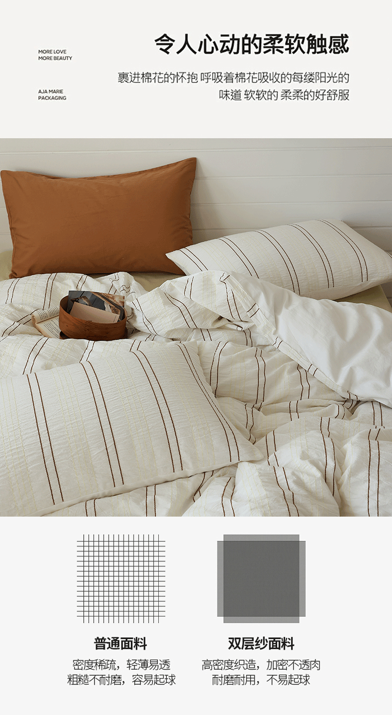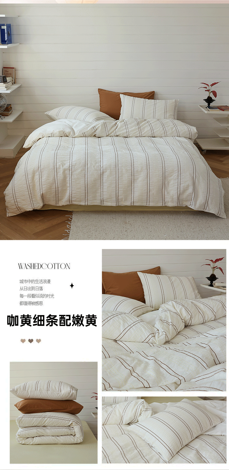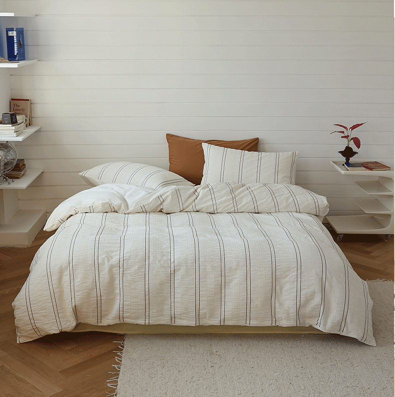 当前位置: 91家纺网 > 商品网购 > 床品套件 > 四件套 > 水洗棉四件套 > 棉眠 2024新款水洗皱皱纱色织提花线条混搭系列四件套 咖黄细条配嫩黄