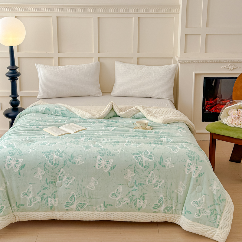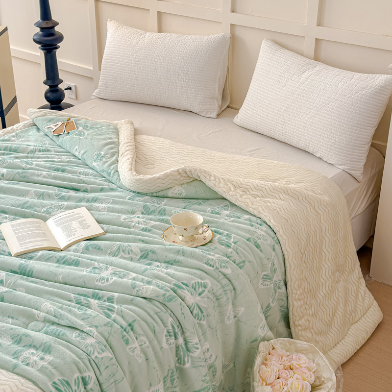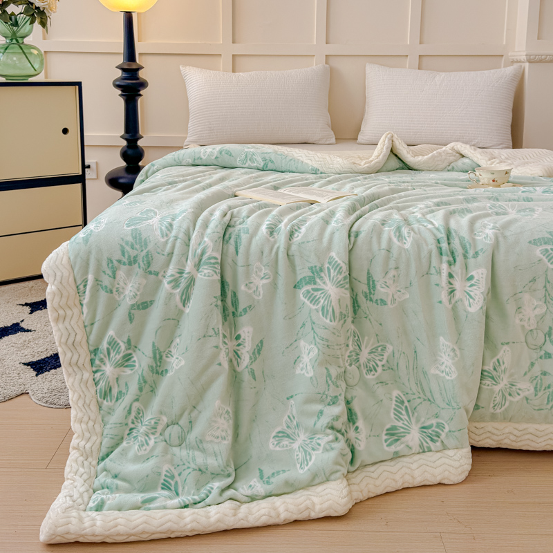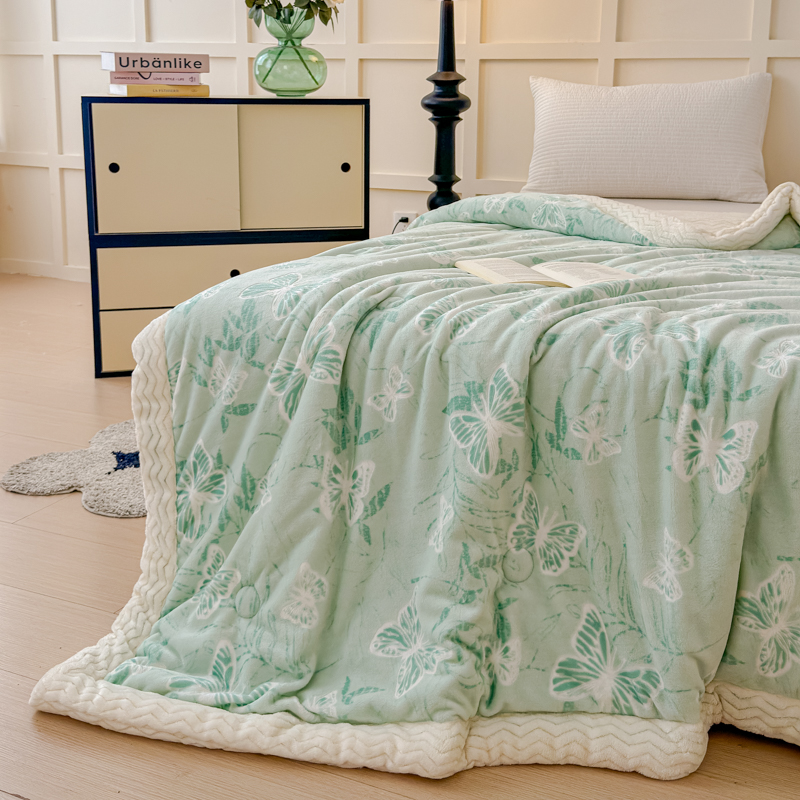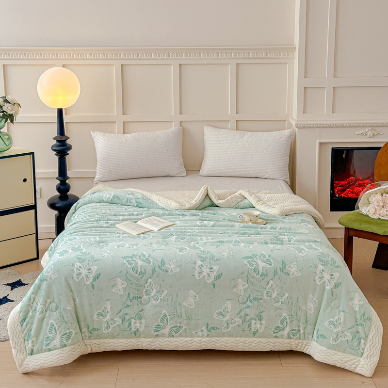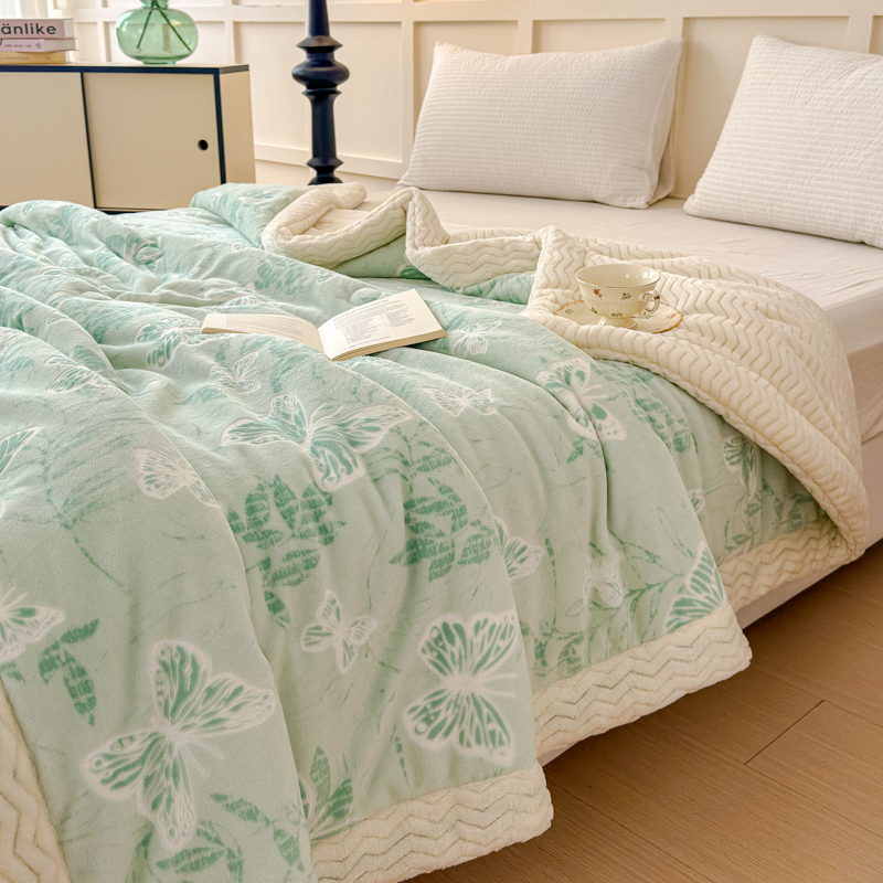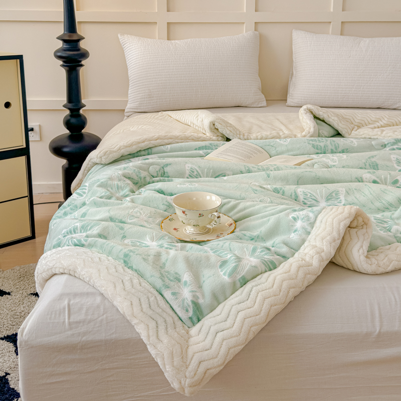 商品名称:金丝鸟 2024加厚240g立体雕花牛奶绒夹棉绗缝手包毛毯毯子 蝴蝶飞 绿 手包毯
