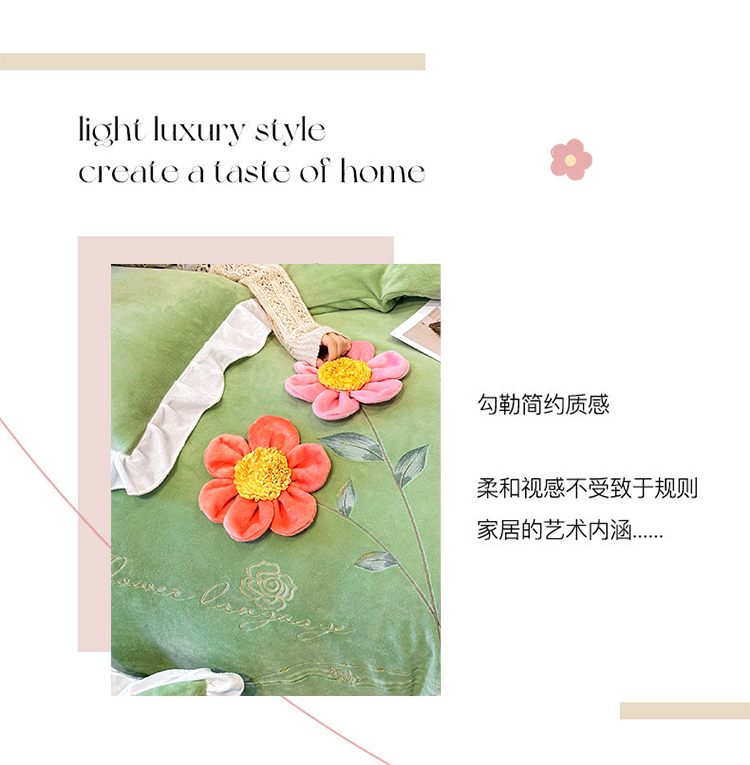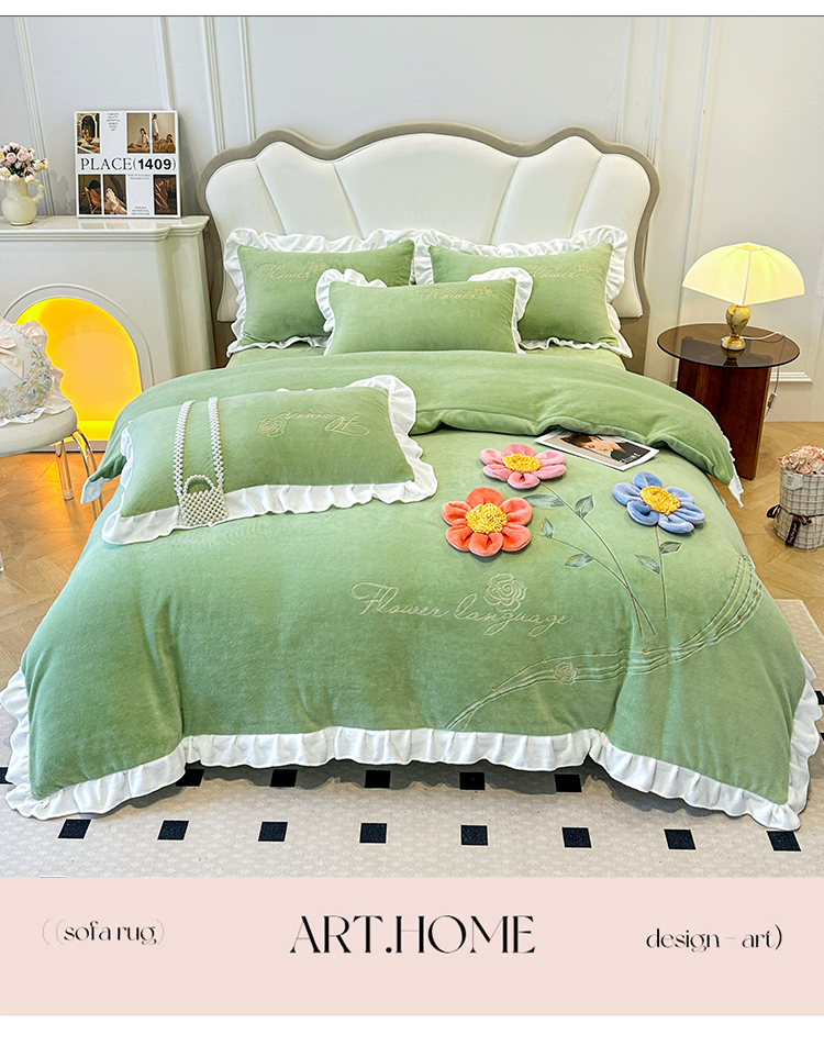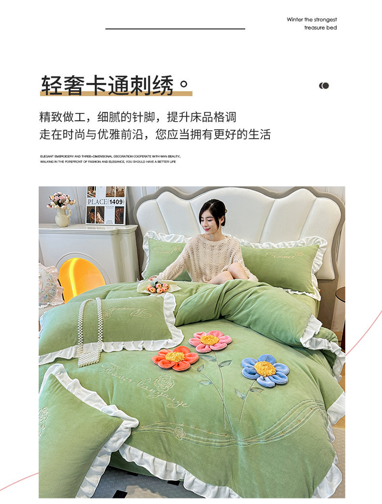 9斤高端韩版少女心法式公主风贴布绣花牛奶绒四件套小清新绒兔毛绒法莱绒床盖被套丝绒兔毛绒法莱绒床盖被套 锦上添花-新芽绿