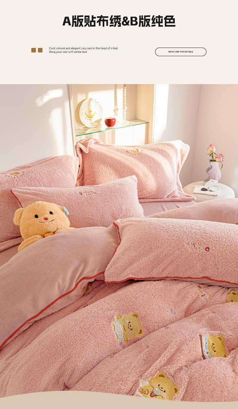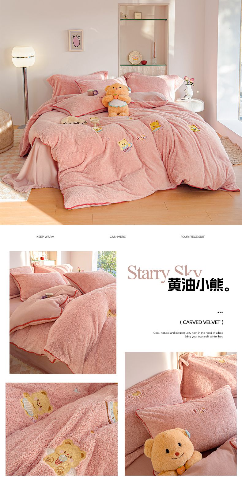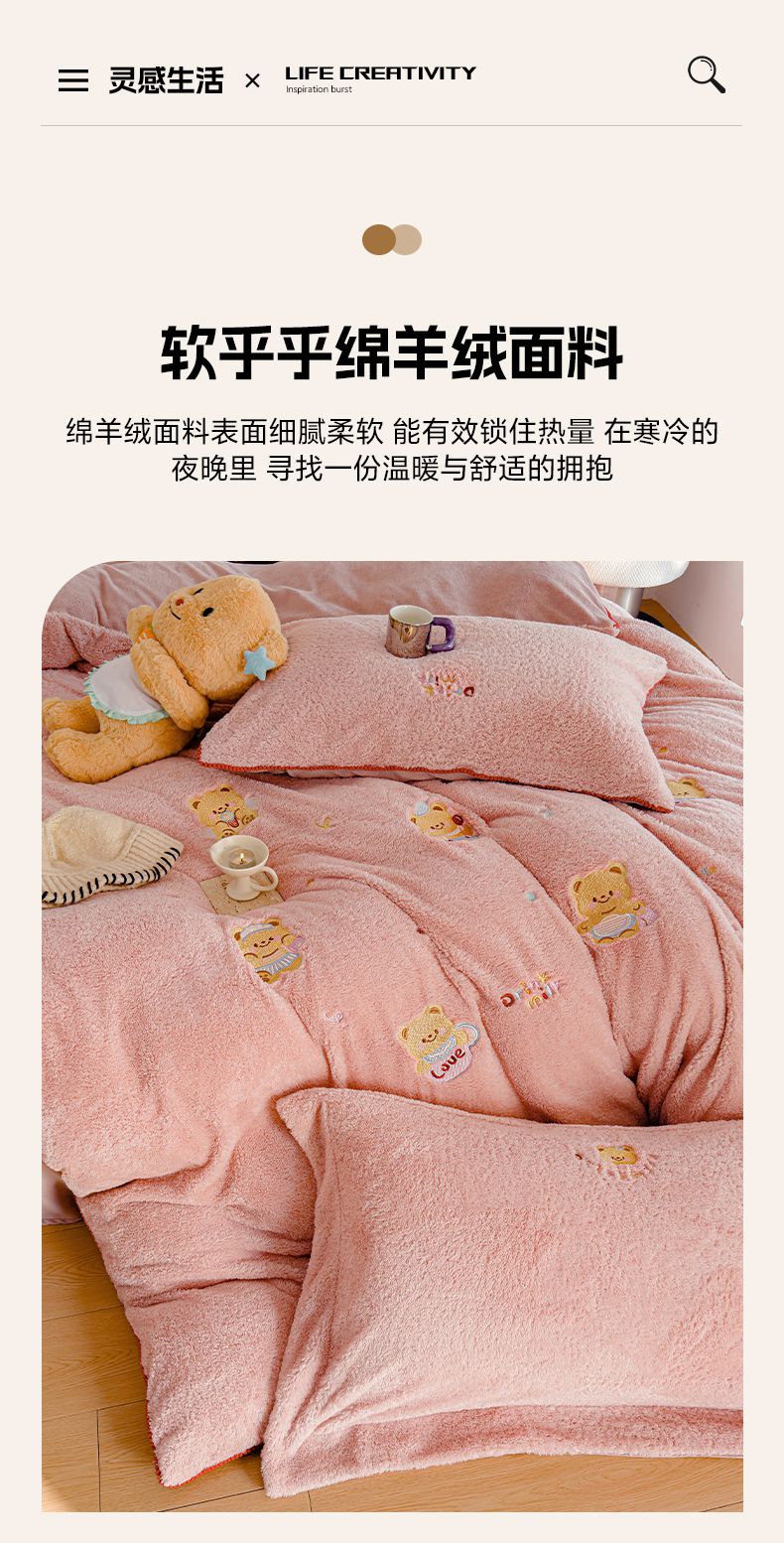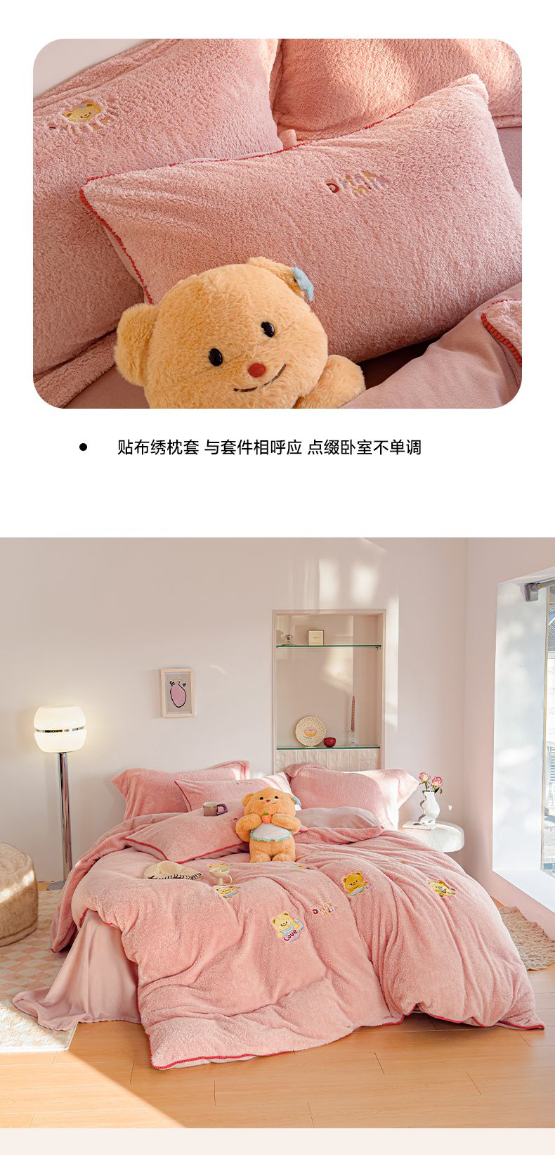 商品名称:秀色家纺 2025新款卡通风可爱少女心绵羊绒牛奶绒四件套加厚保暖秋冬季法兰绒刺绣被套 黄油小熊