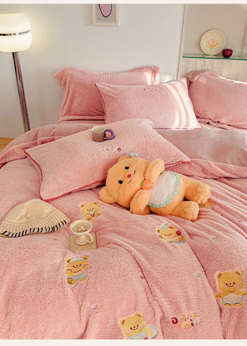 秀色家纺 2025新款卡通风可爱少女心绵羊绒牛奶绒四件套加厚保暖秋冬季法兰绒刺绣被套 黄油小熊