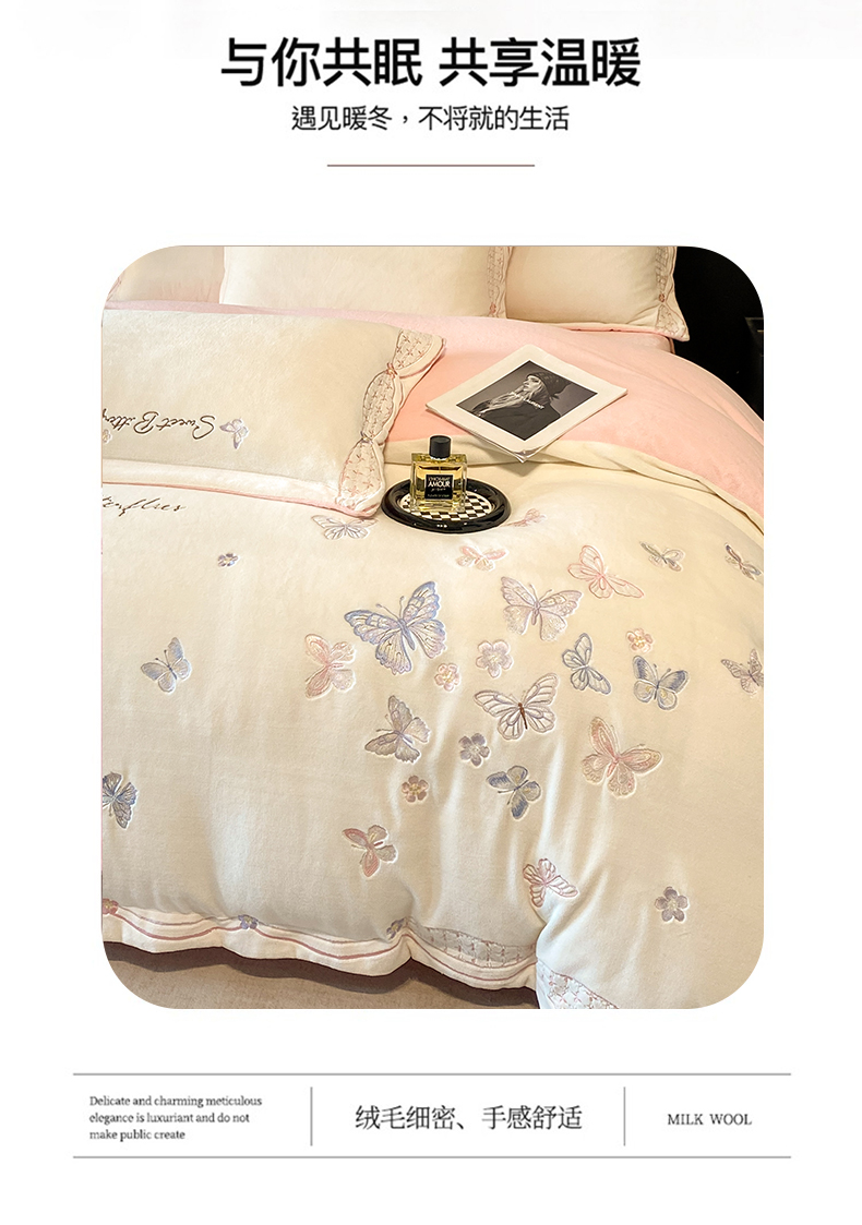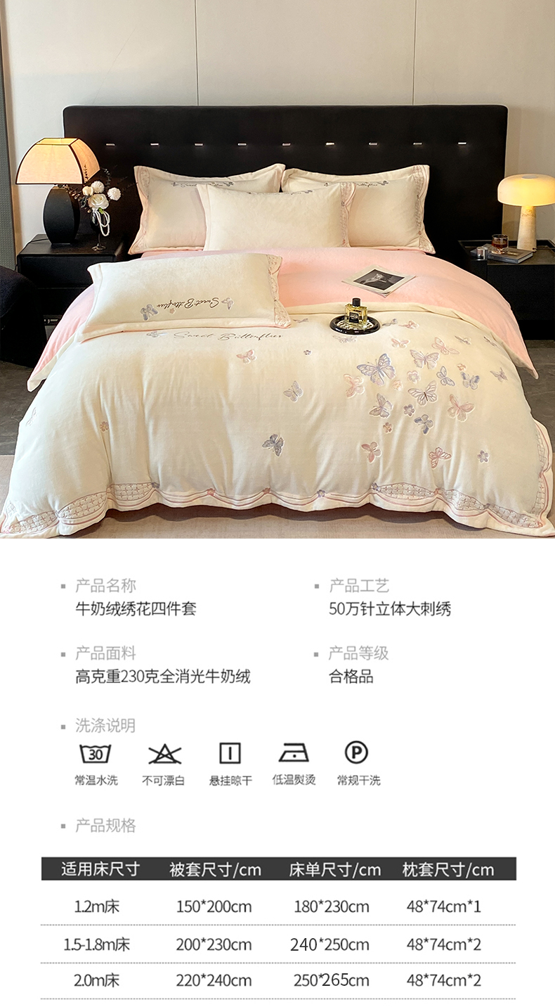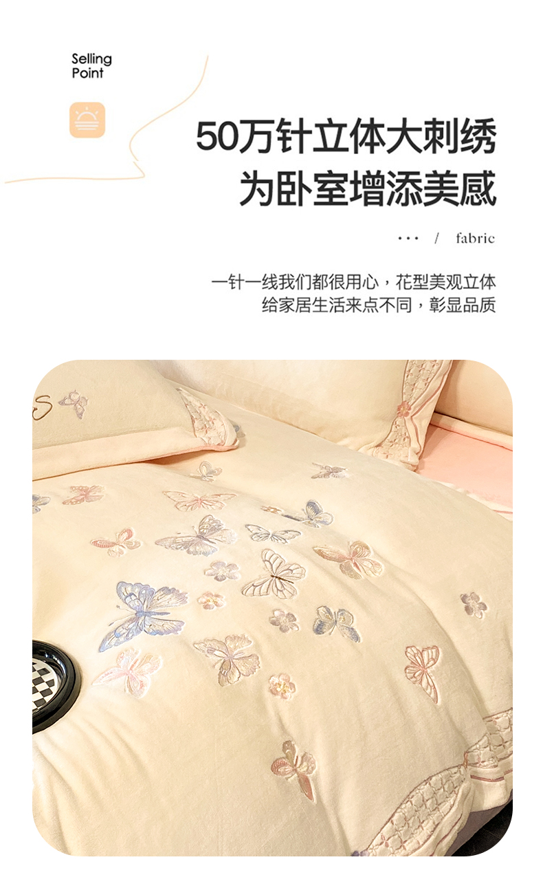 商品名称:赛丽雅 2024新款全消光牛奶绒刺绣四件套-梦蝶 梦蝶-米月白