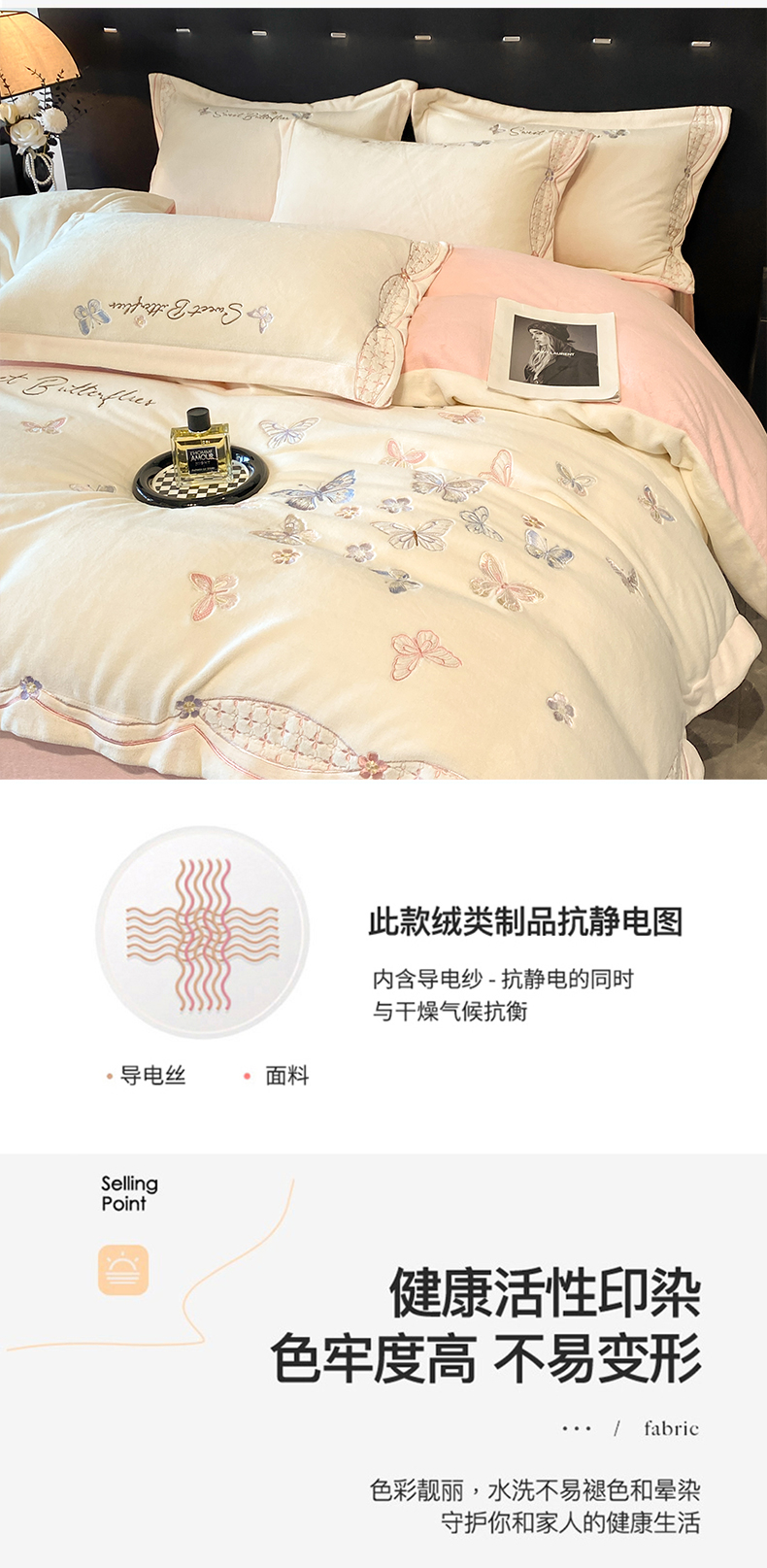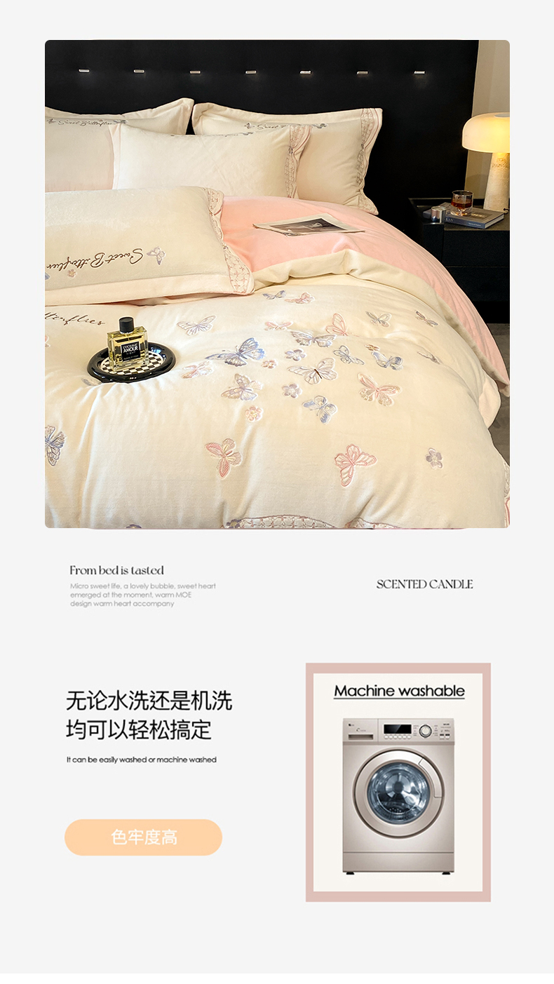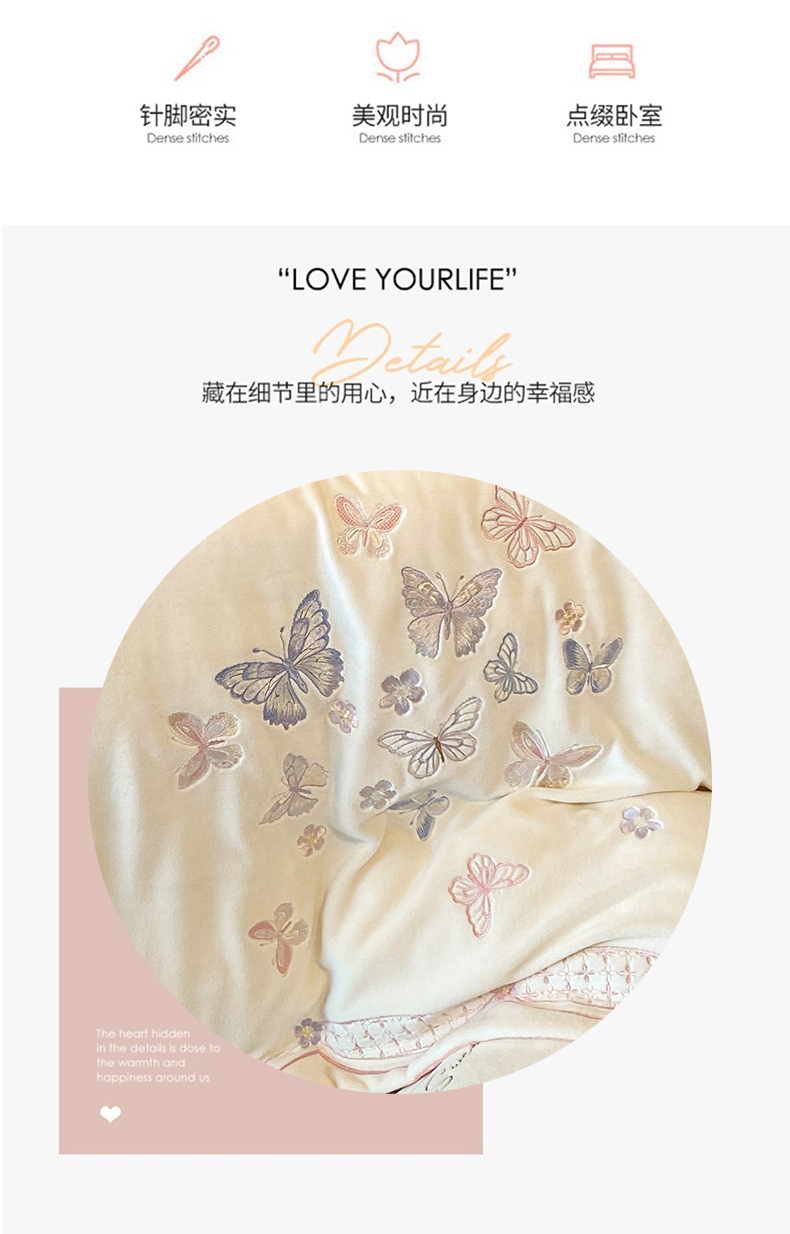 商品名称:赛丽雅 2024新款全消光牛奶绒刺绣四件套-梦蝶 梦蝶-米月白