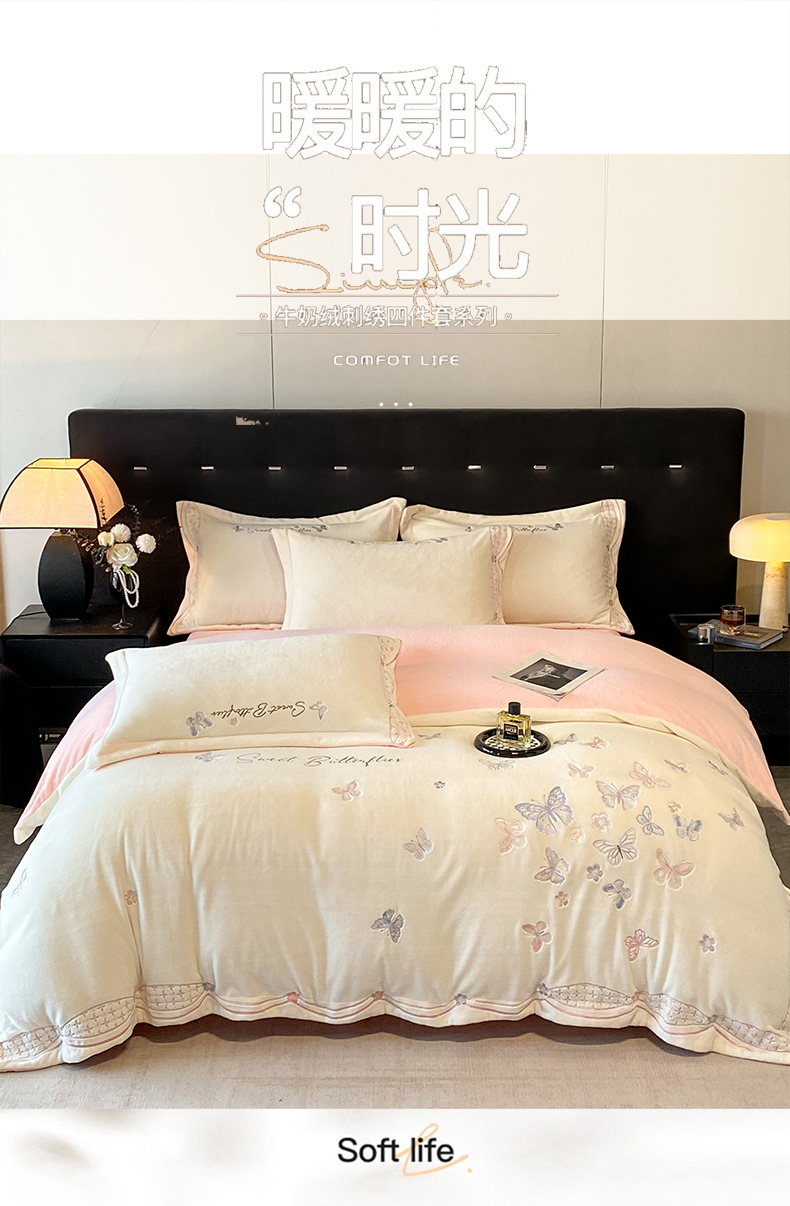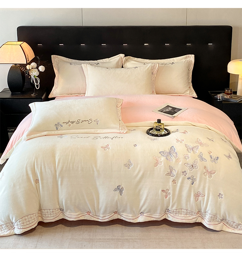 赛丽雅 2024新款全消光牛奶绒刺绣四件套-梦蝶 梦蝶-米月白