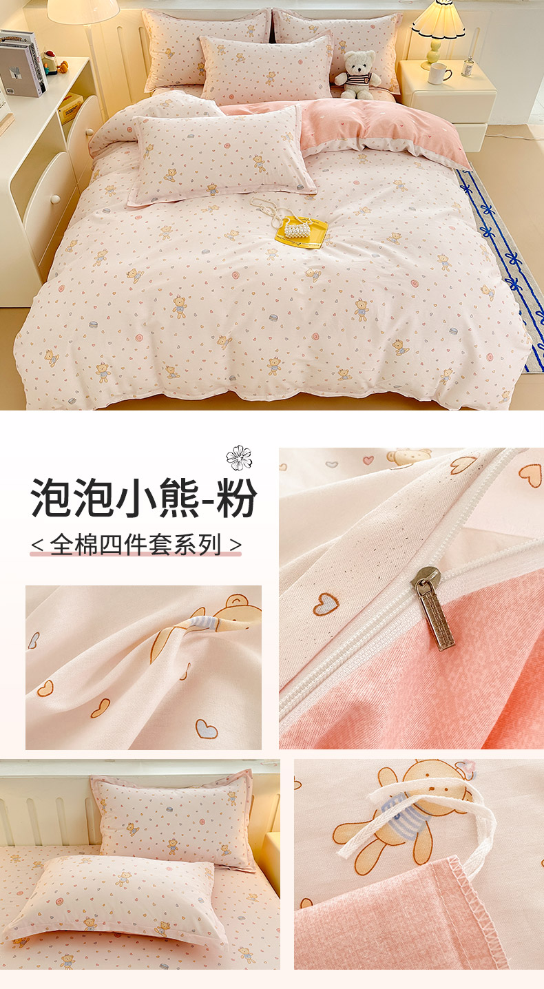 商品名称:绵庭家纺 2025新款全棉印花四件套系列 泡泡小熊-粉