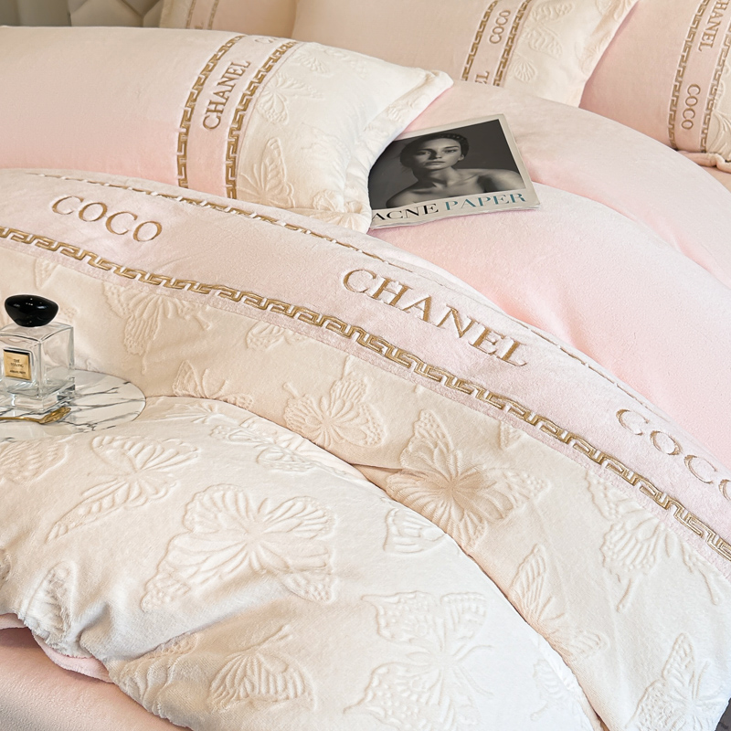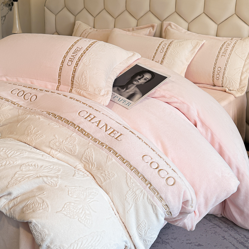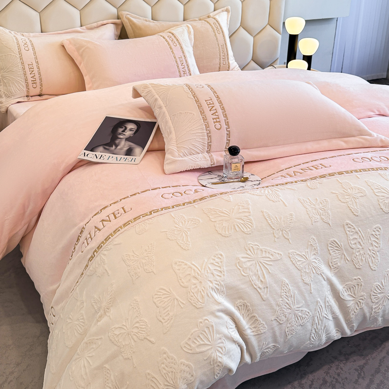 商品名称:宅家居 2024新款雕花拼接刺绣全消光A类高克重牛奶绒四件套-蝶之舞系列 蝶之舞-粉玉