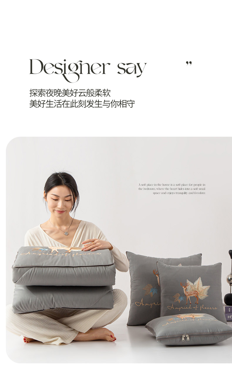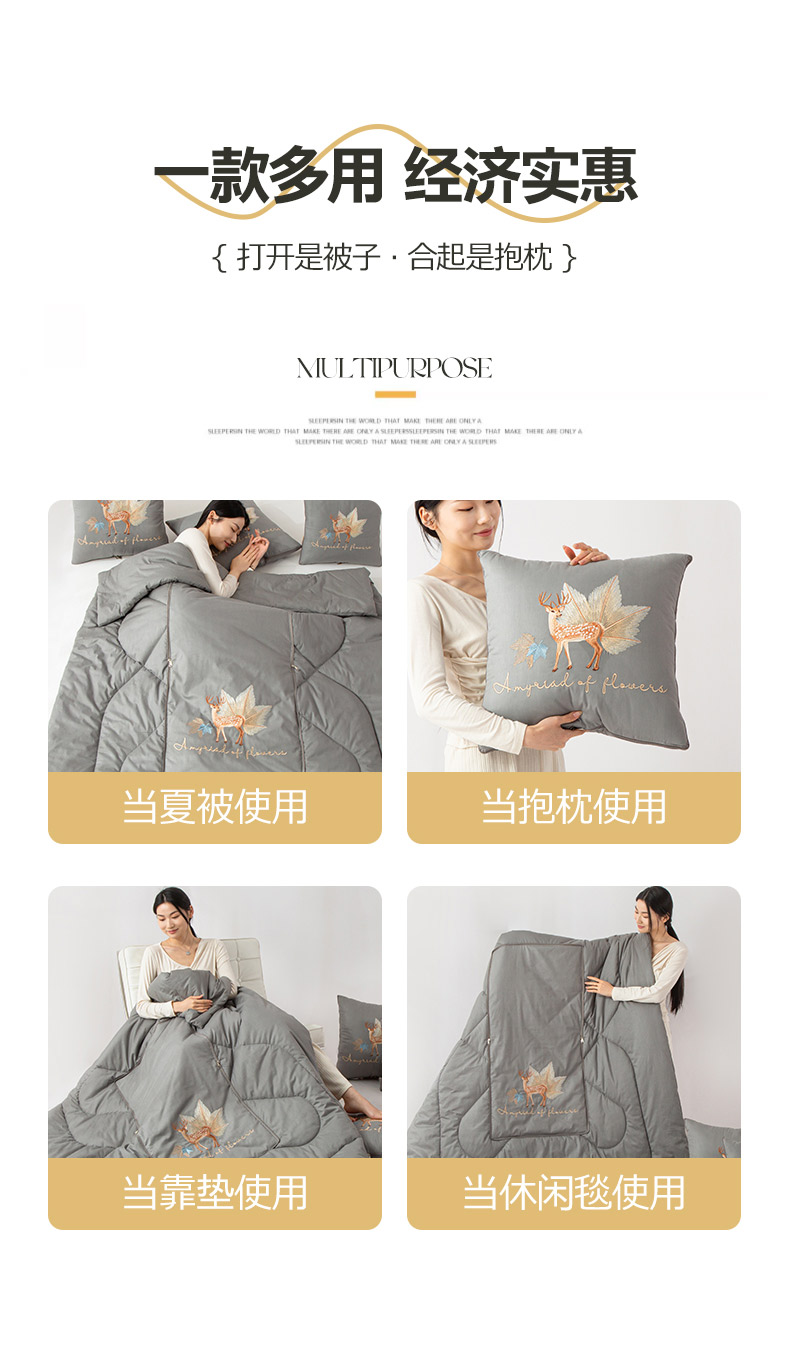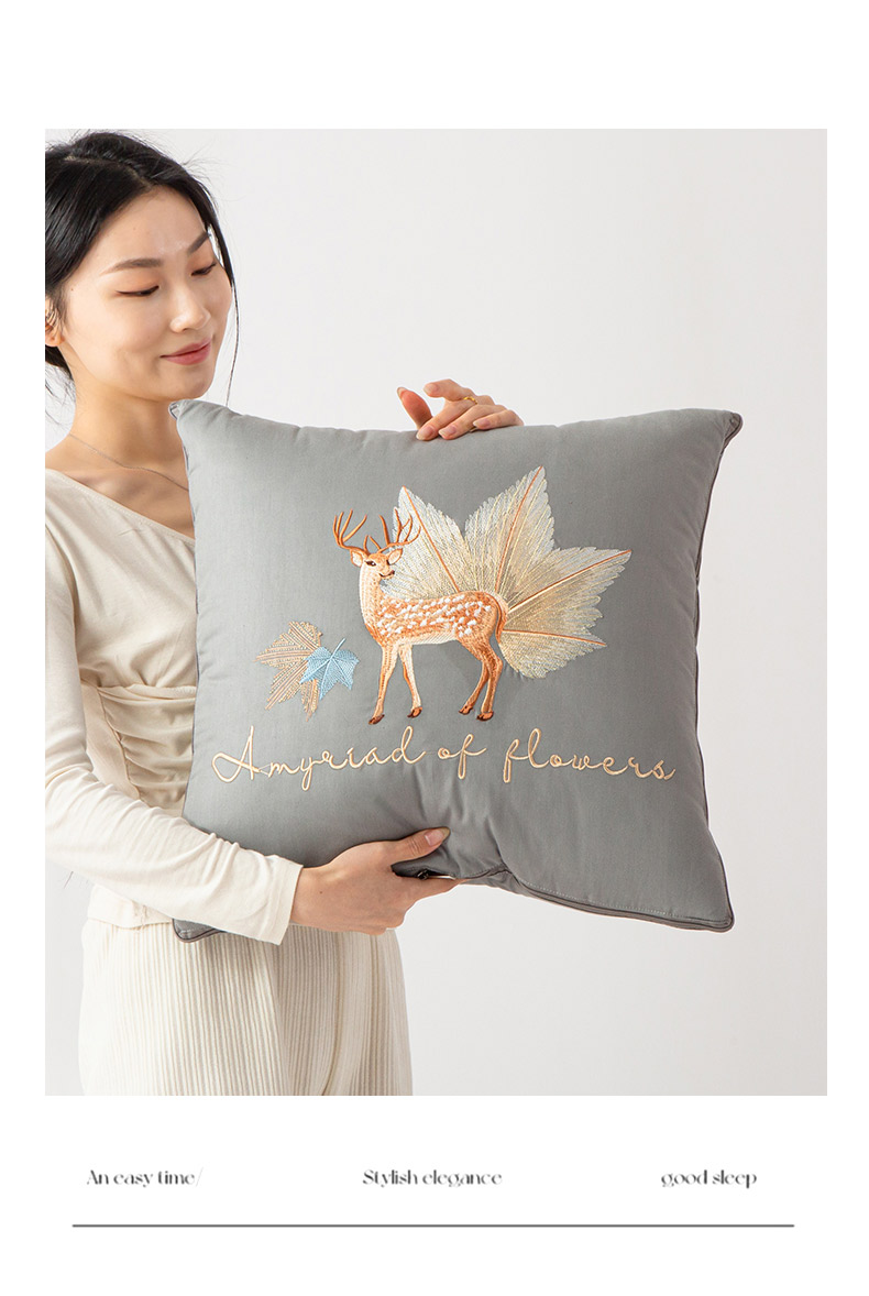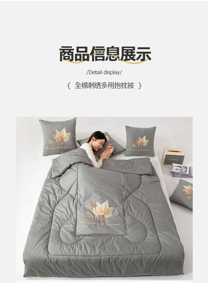 商品名称:雷人家纺 2023新款全棉喷气13*72刺绣抱枕被 一鹿相随(银光灰)