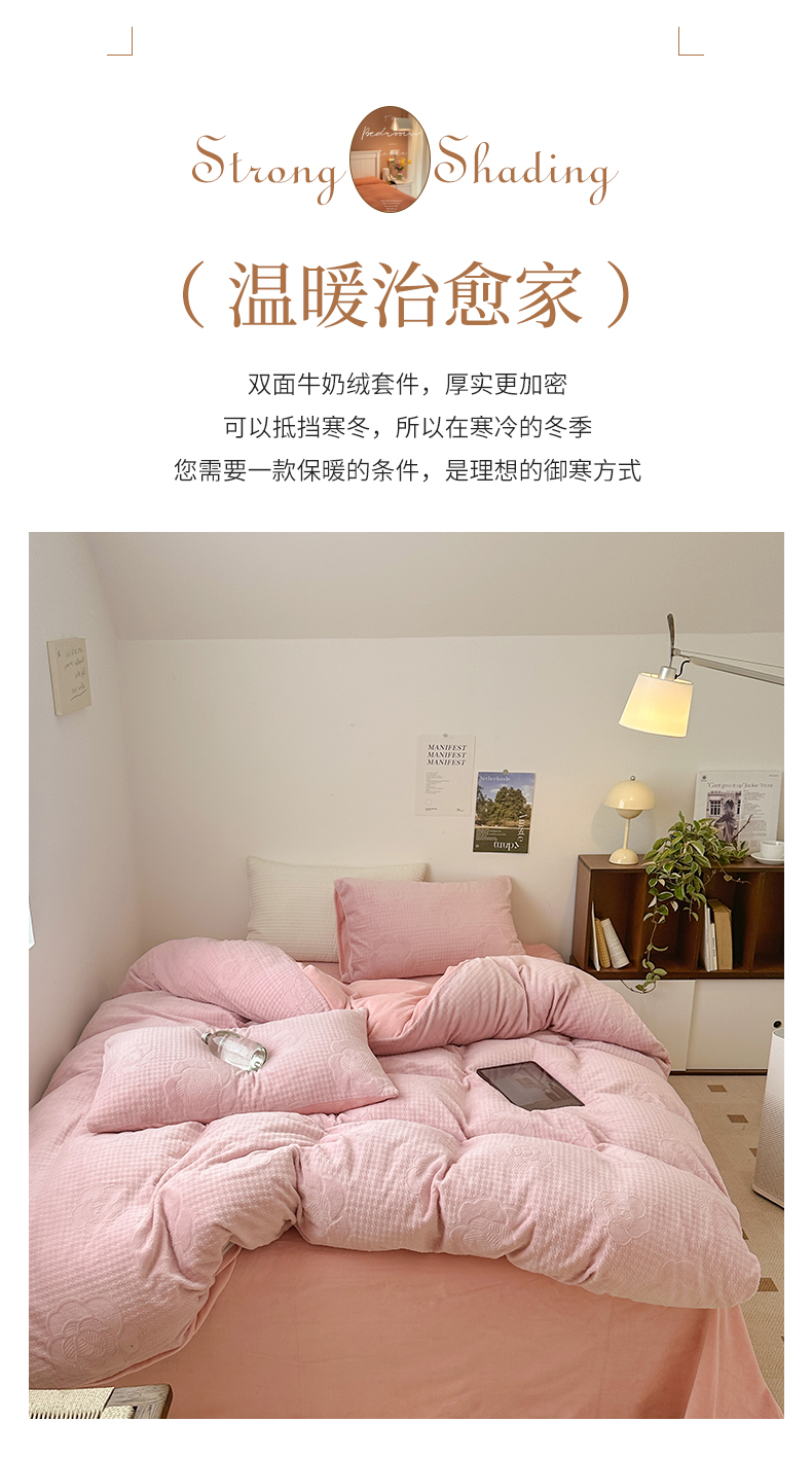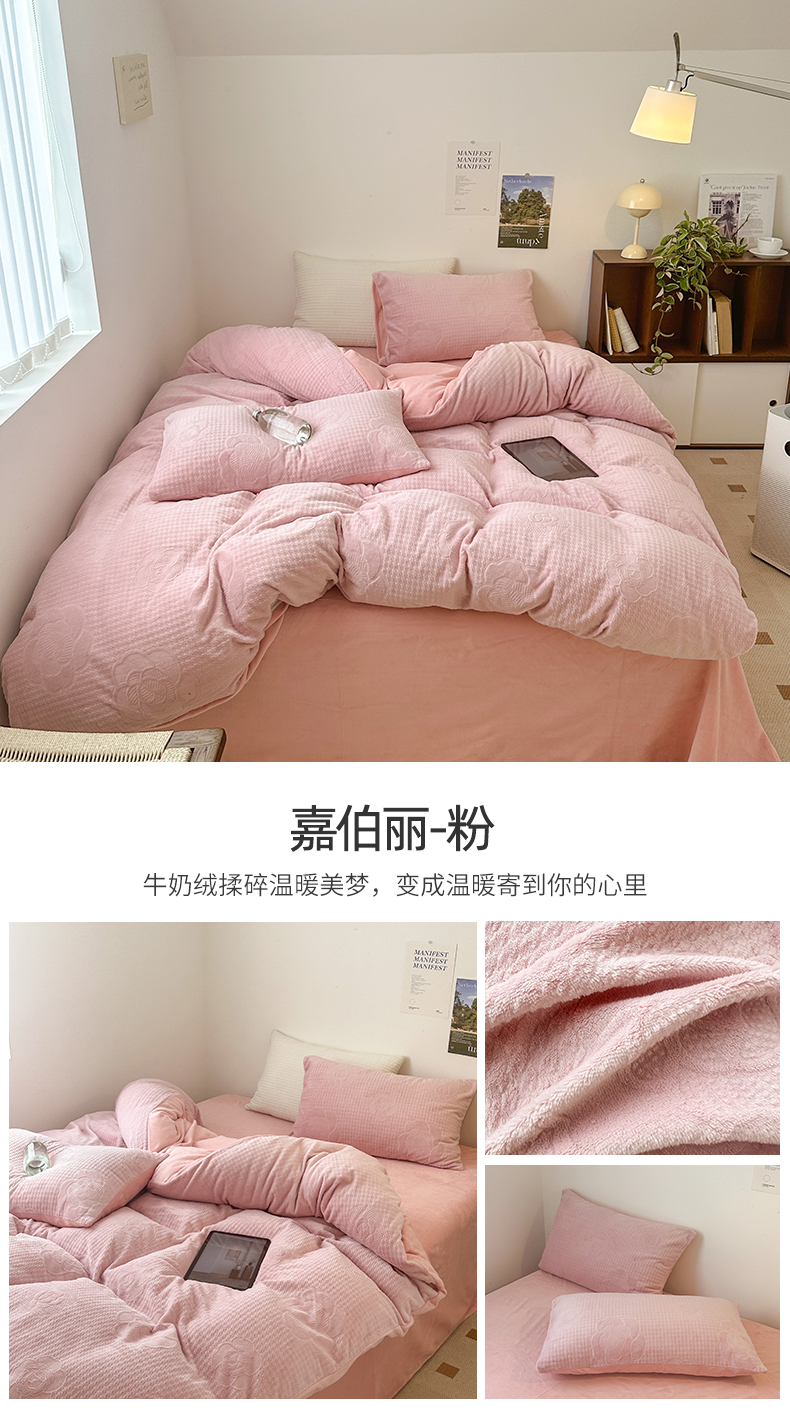(买家秀爆款不断货)A类母婴级牛奶雕花绒四件套珊瑚绒小香风牛奶绒四件套雪花绒四件套雕花牛奶绒四件套白 嘉伯丽-粉