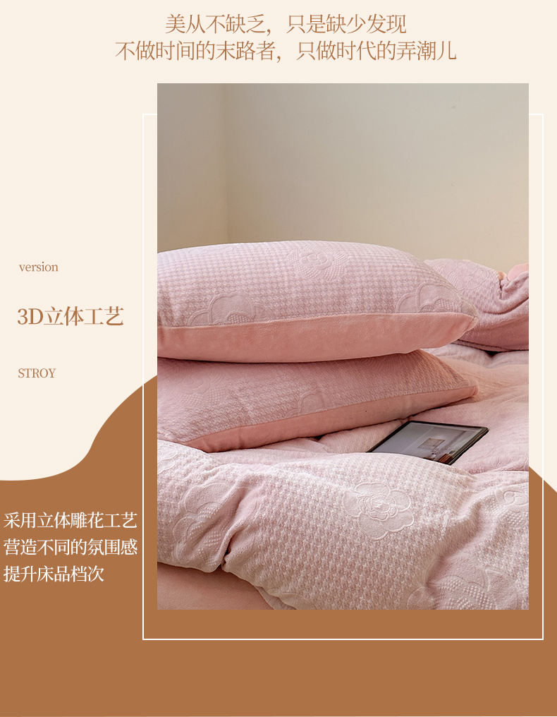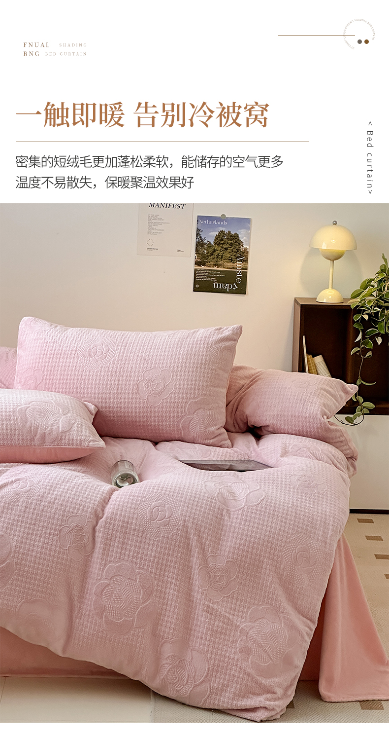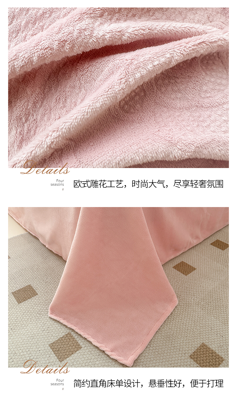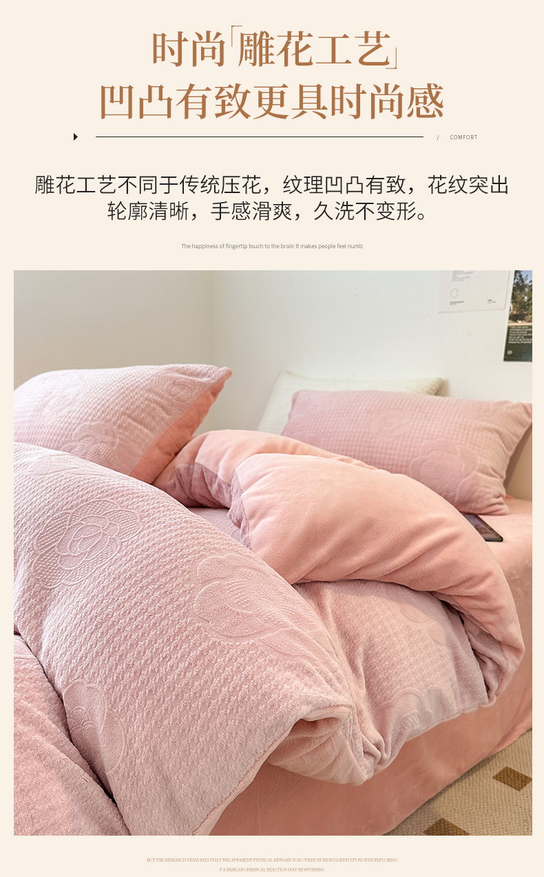 商品名称:(买家秀爆款不断货)A类母婴级牛奶雕花绒四件套珊瑚绒小香风牛奶绒四件套雪花绒四件套雕花牛奶绒四件套白 嘉伯丽-粉