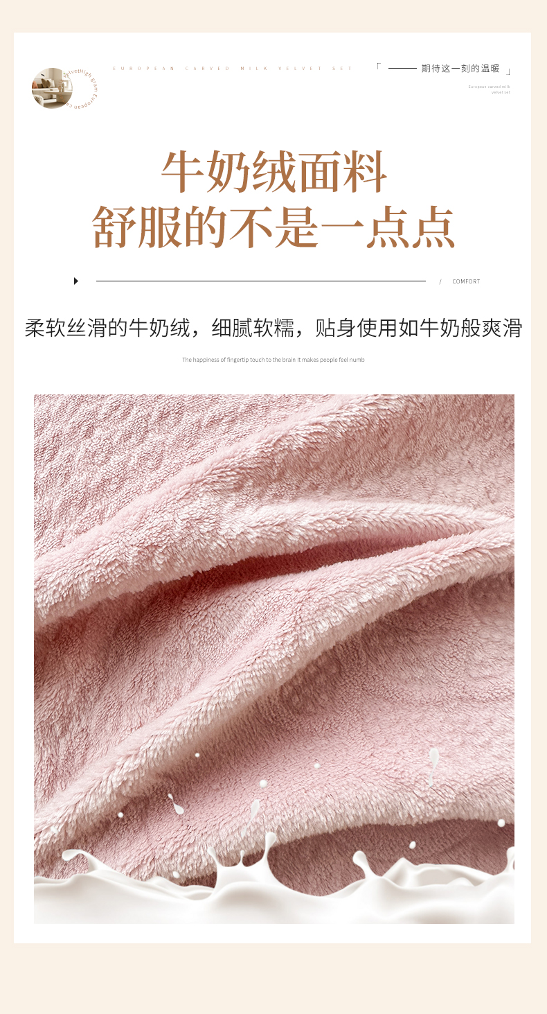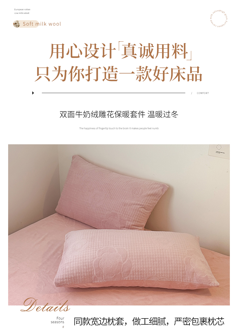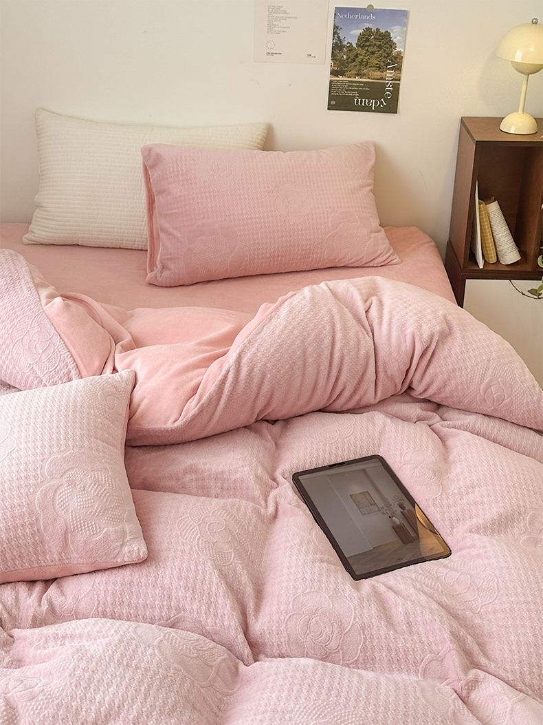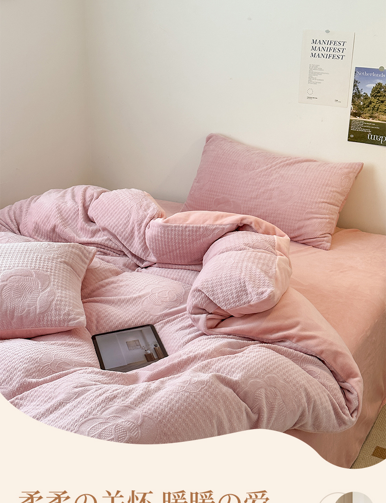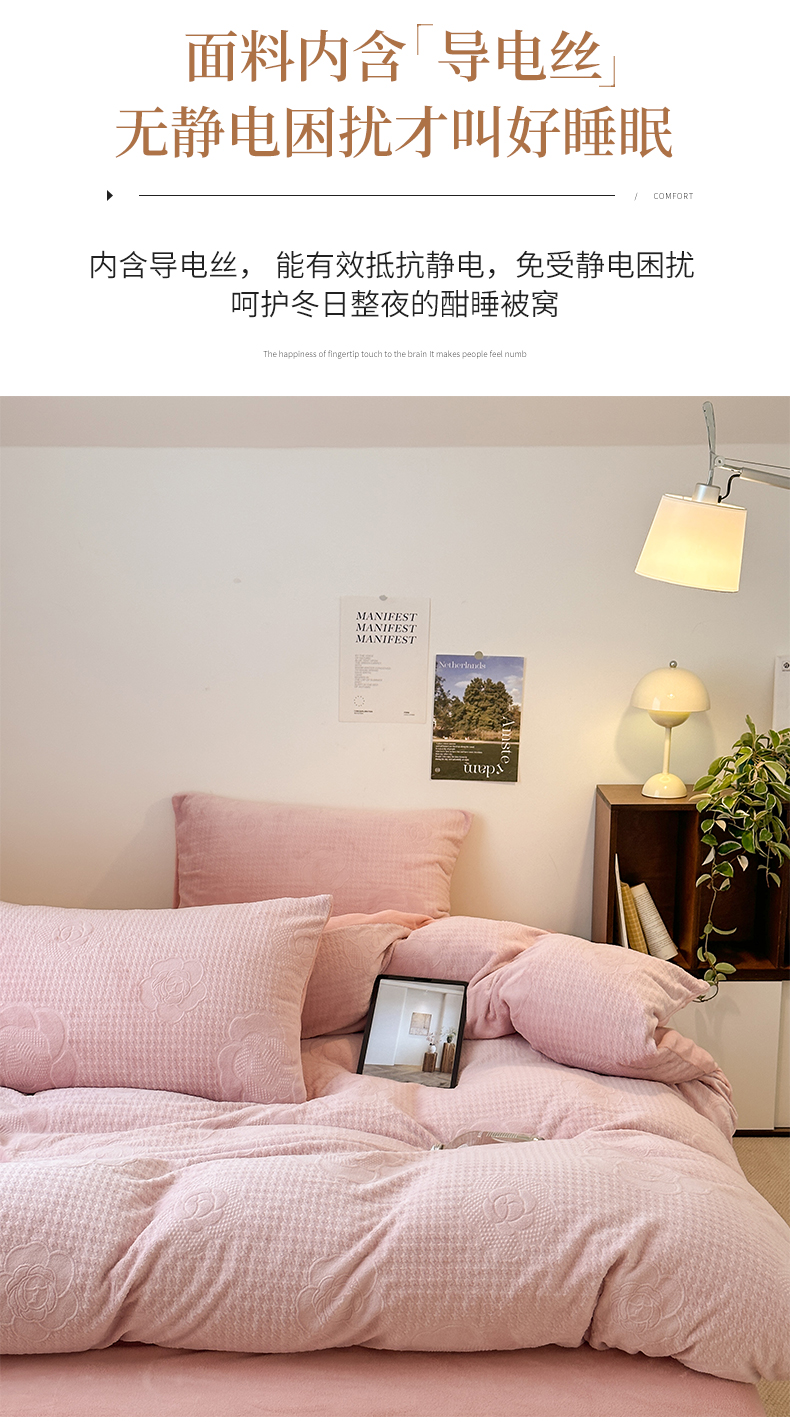商品名称:(买家秀爆款不断货)A类母婴级牛奶雕花绒四件套珊瑚绒小香风牛奶绒四件套雪花绒四件套雕花牛奶绒四件套白 嘉伯丽-粉