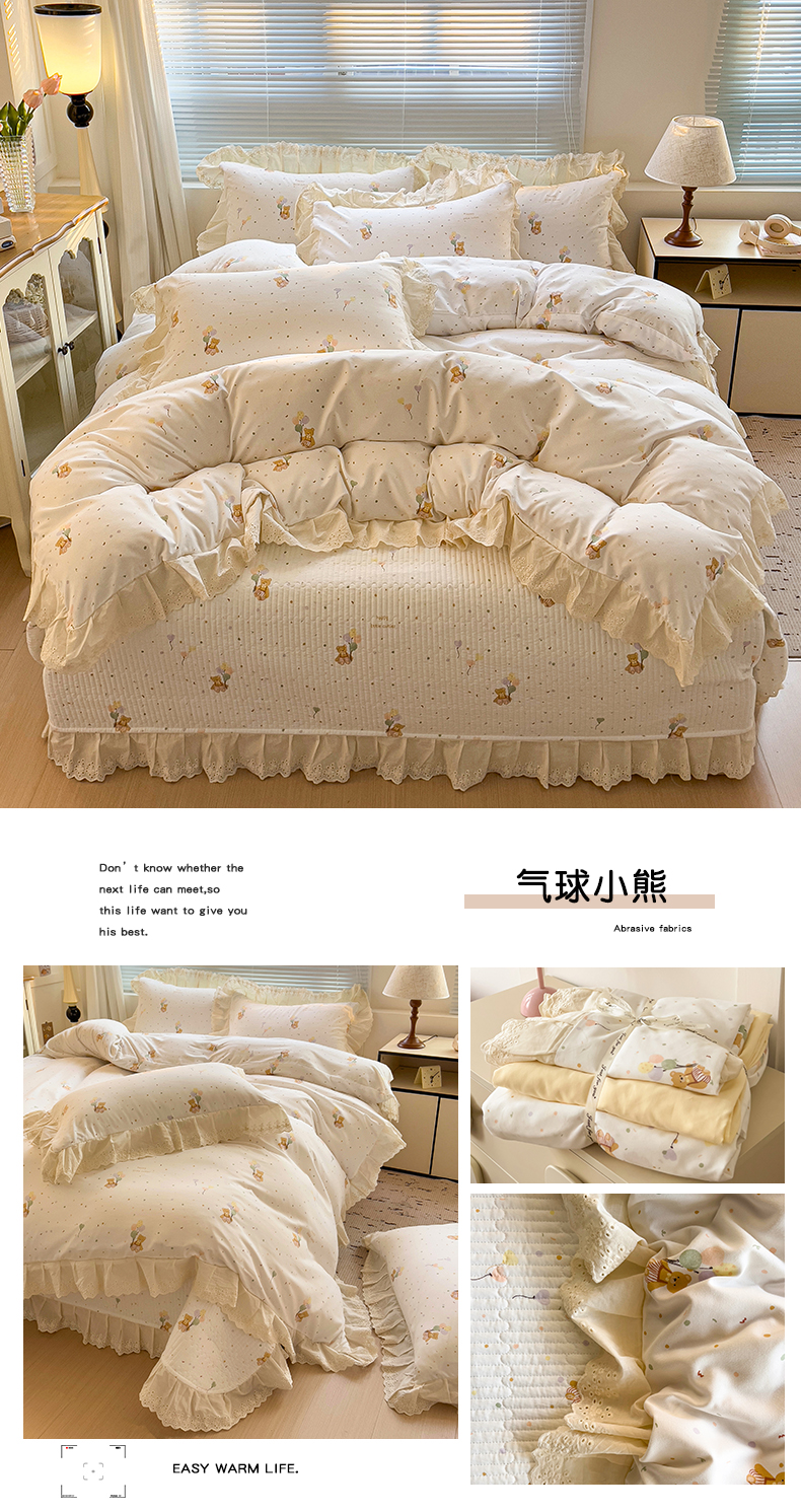 当前位置: 91家纺网 > 商品网购 > 床品套件 > 四件套 > 双层纱四件套 > 富米莱(原臻工厂) 2025新款A类针织双层纱花边款四件套床盖四件套 气球小熊