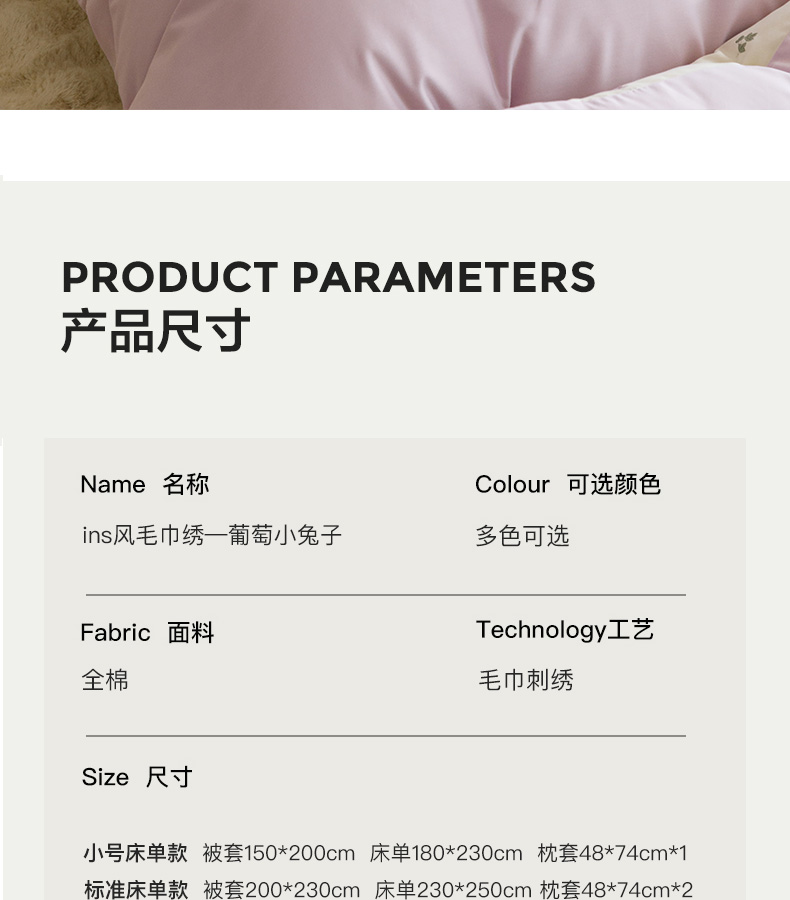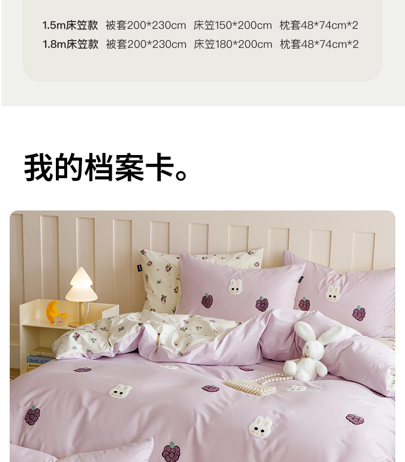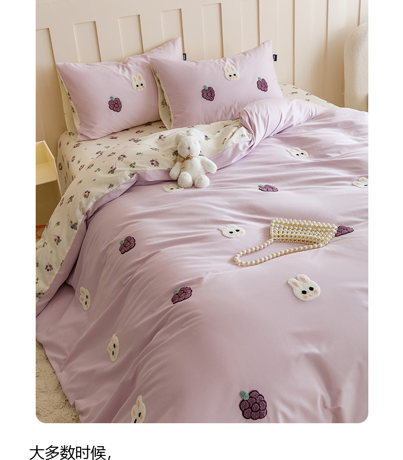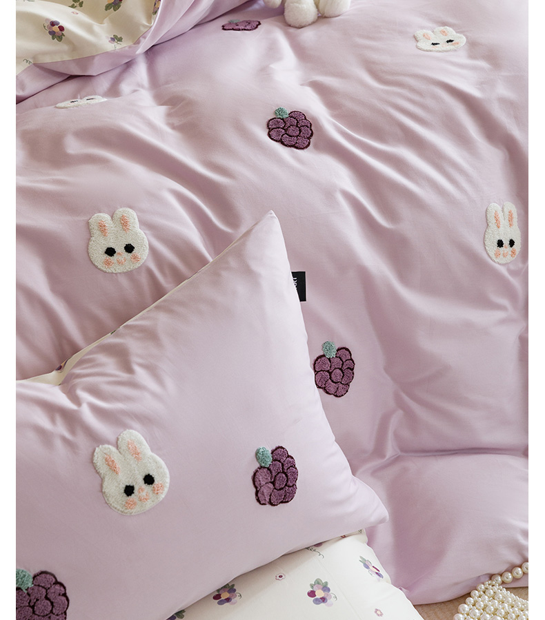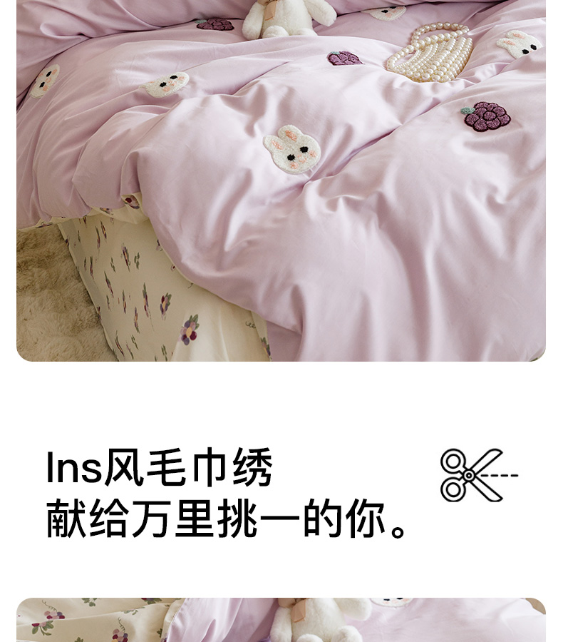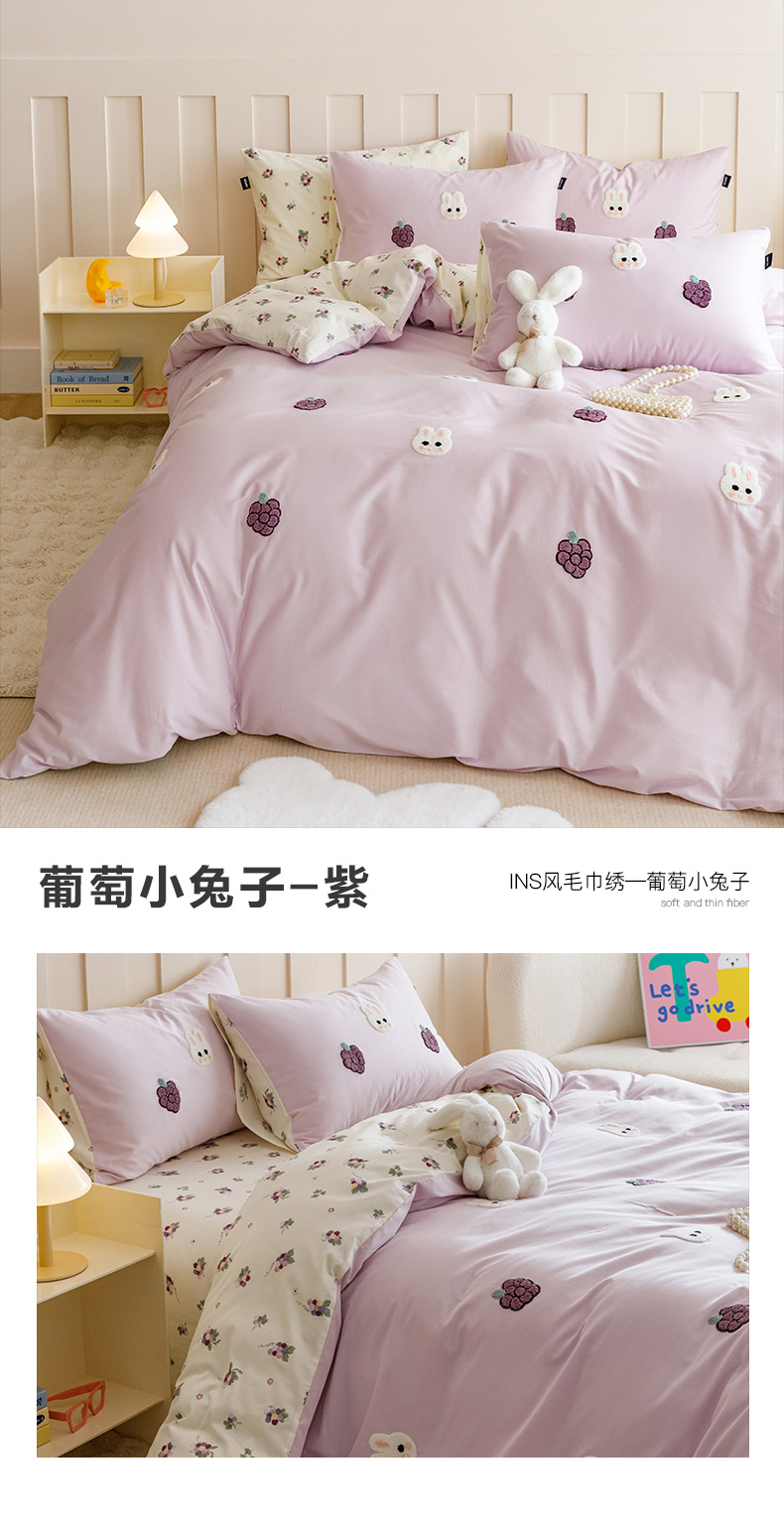 商品名称:卡姿家纺 2025春夏新款ins风毛巾绣—葡萄小兔子系列四件套 葡萄小兔子-紫