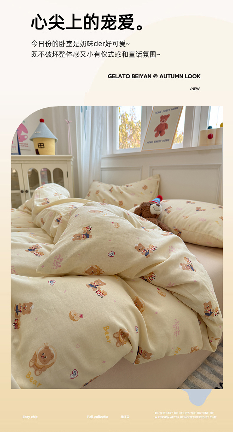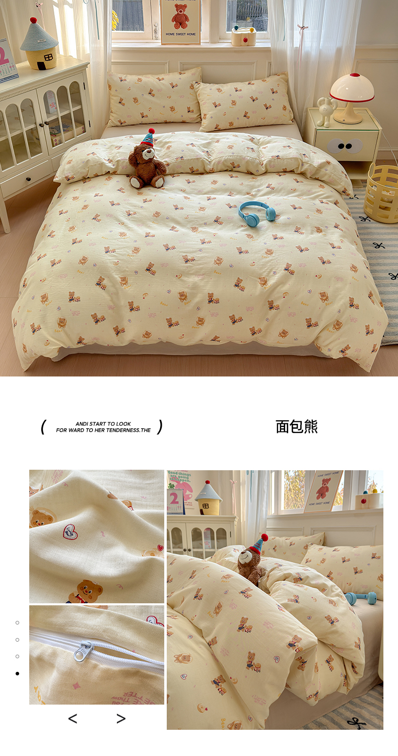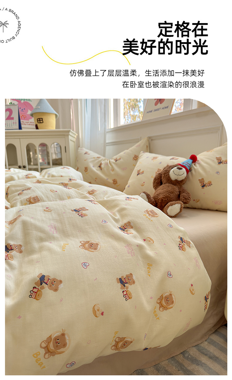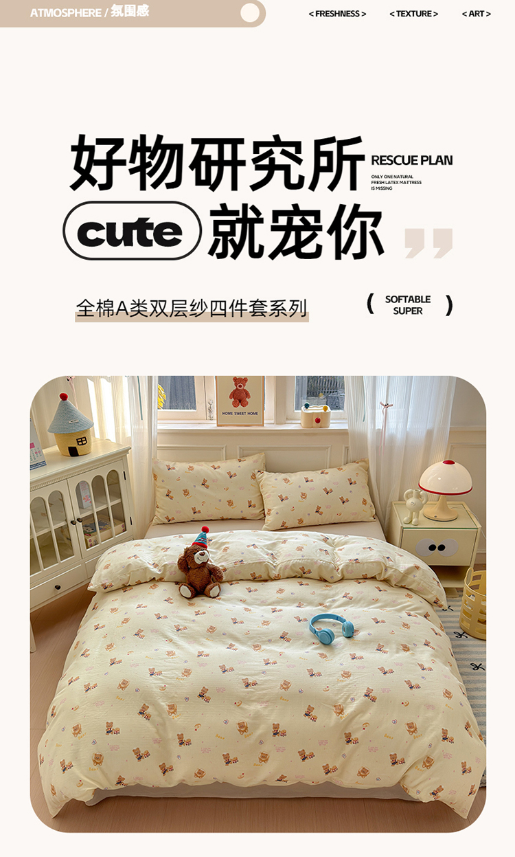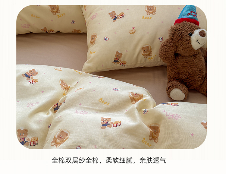 商品名称:2025新款全棉A类双层纱四件套系列-叠拍 面包熊