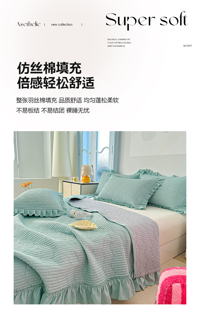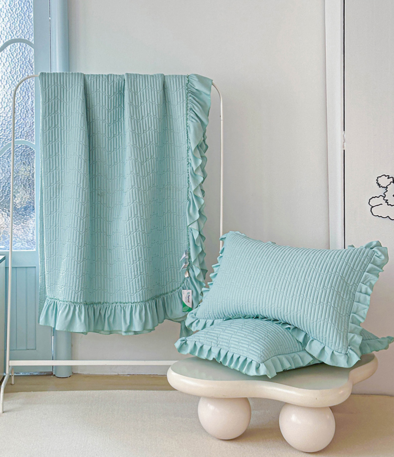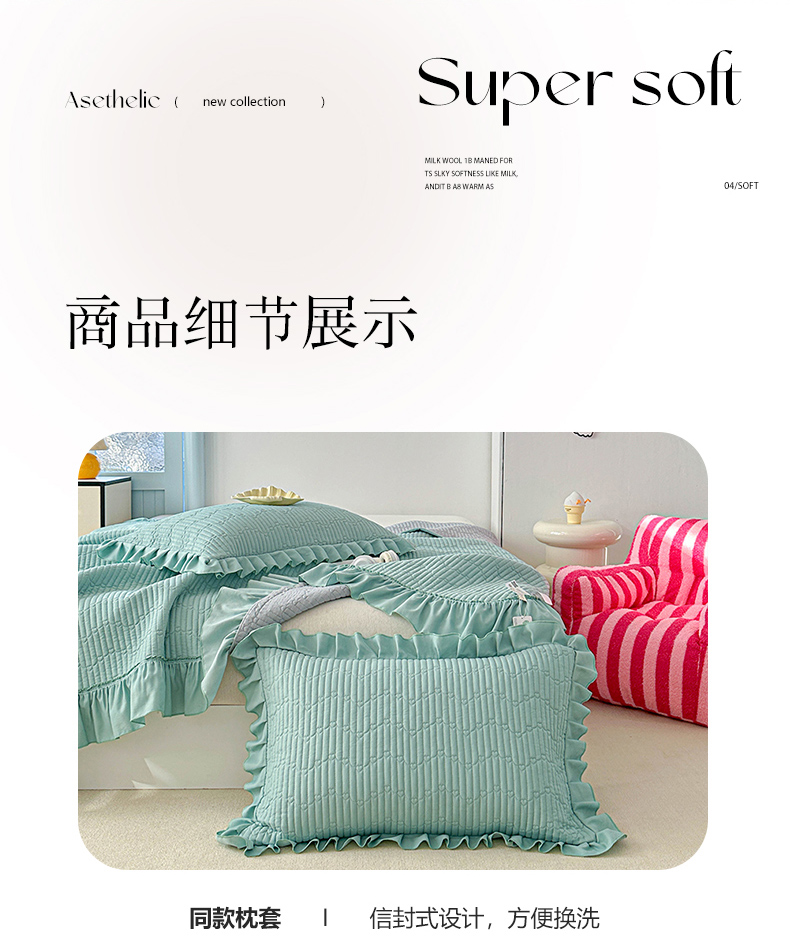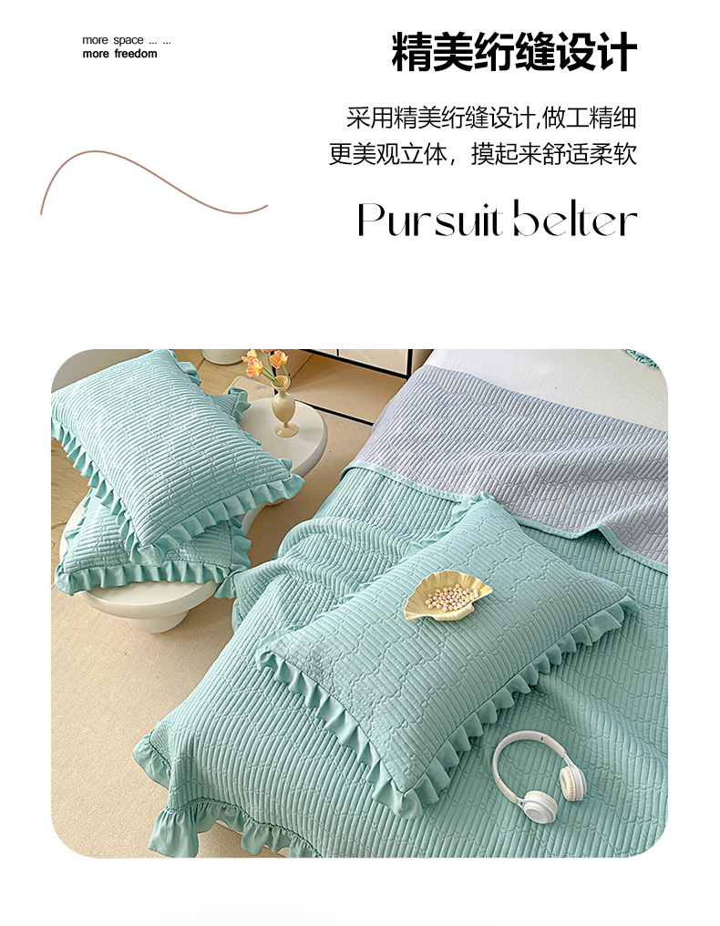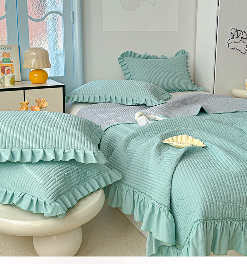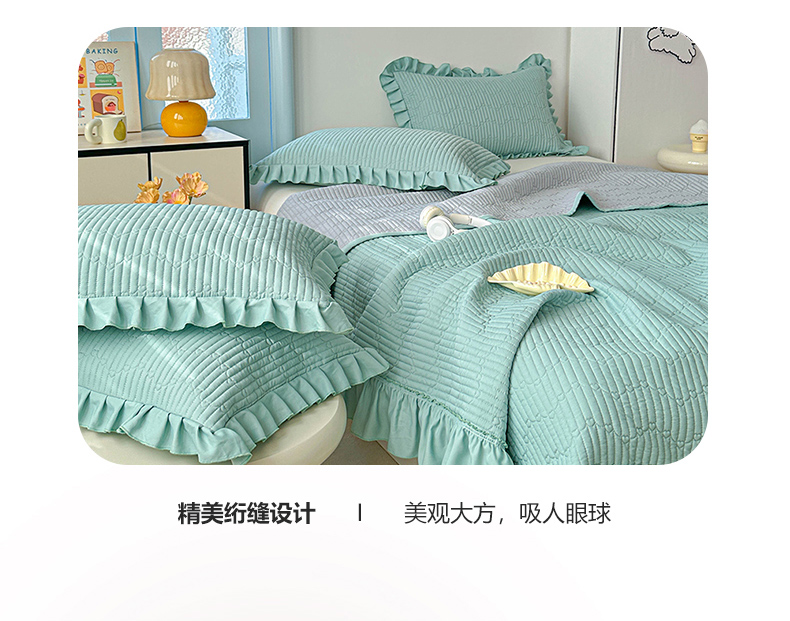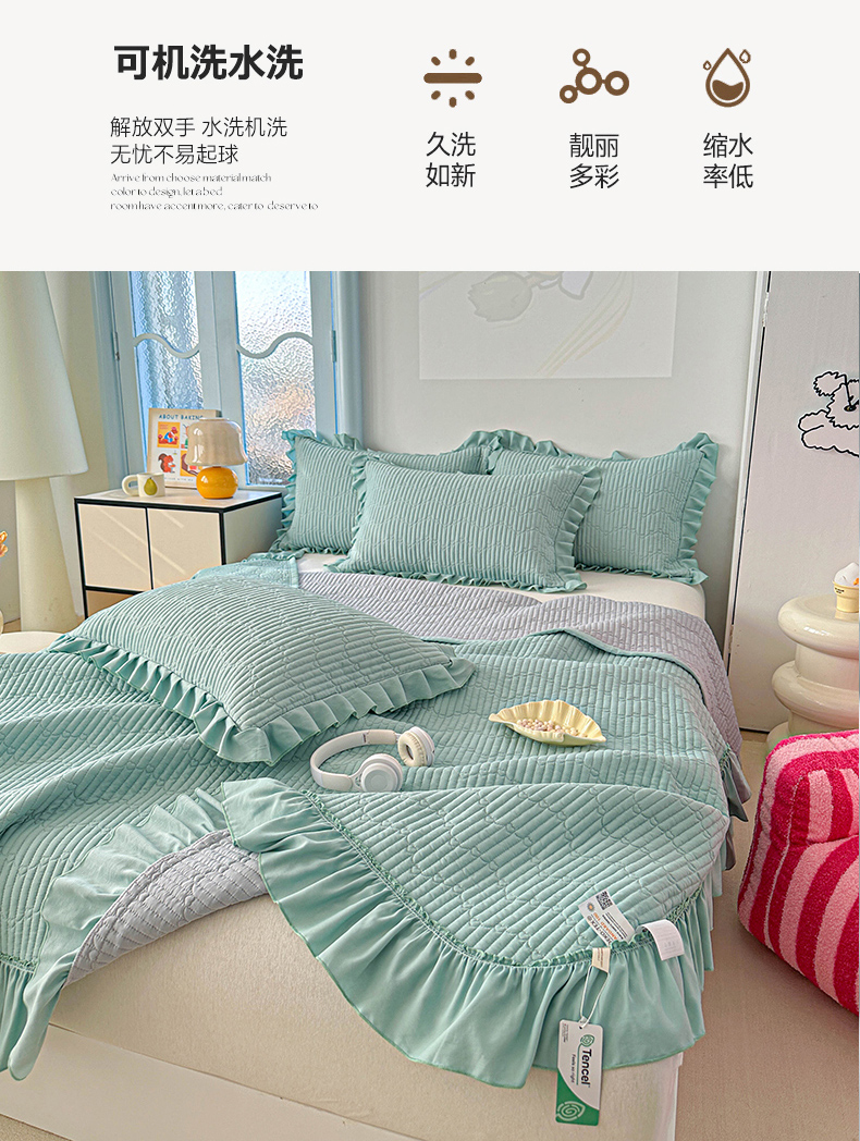 (总)源舜家纺 2025新款色织棉简约韩系花边床盖三件套,简约灰,简约粉,简约绿,简约驼,简约蓝