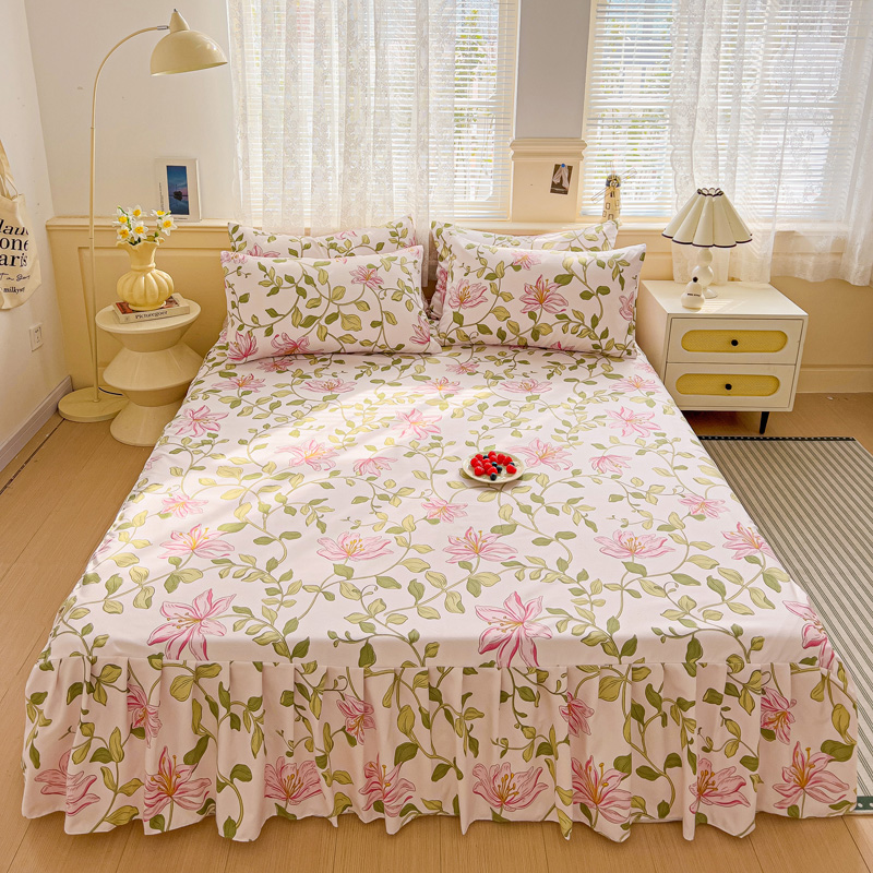 极梦家纺(支持定制) 2025新款春秋130克加厚植物羊绒磨毛印花单床裙三件套 花韵佳人