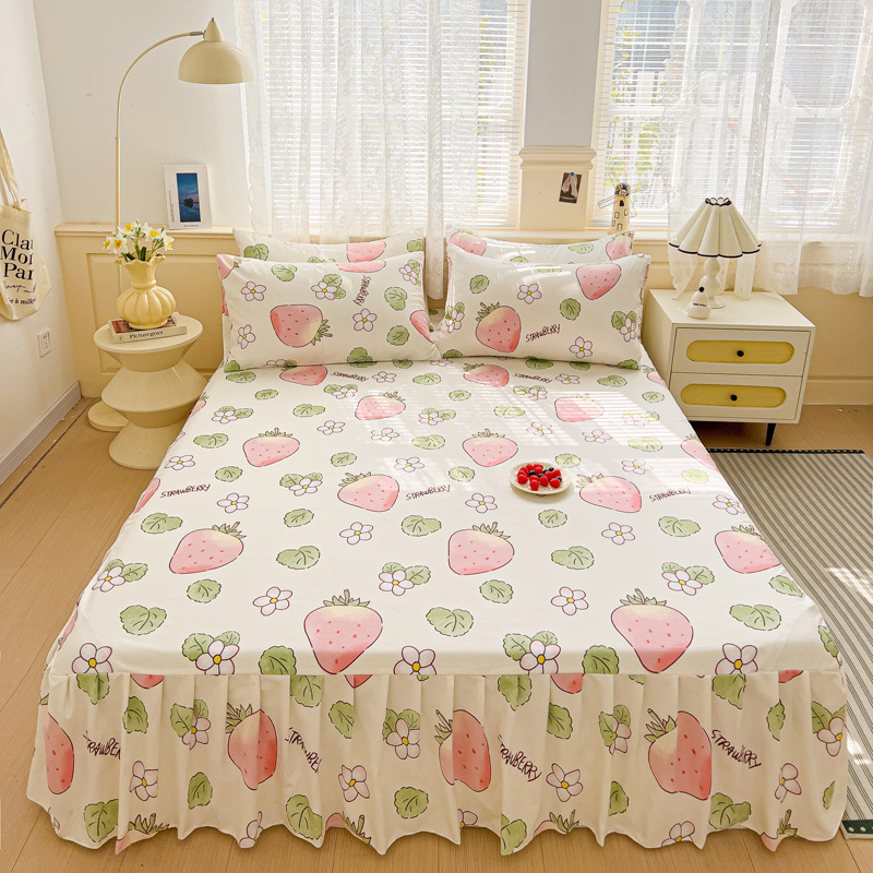 商品名称:极梦家纺(支持定制) 2025新款春秋130克加厚植物羊绒磨毛印花单床裙三件套 仙仙草莓