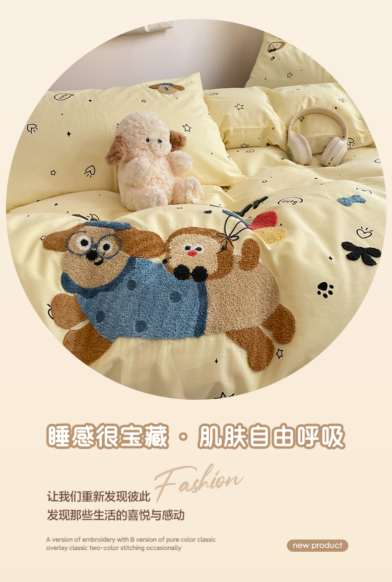 (总)寐居家纺 2025新款贴布绣高克重牛奶绒四件套,安吉拉喵,查理狗,粉糯kitty,皮皮布布