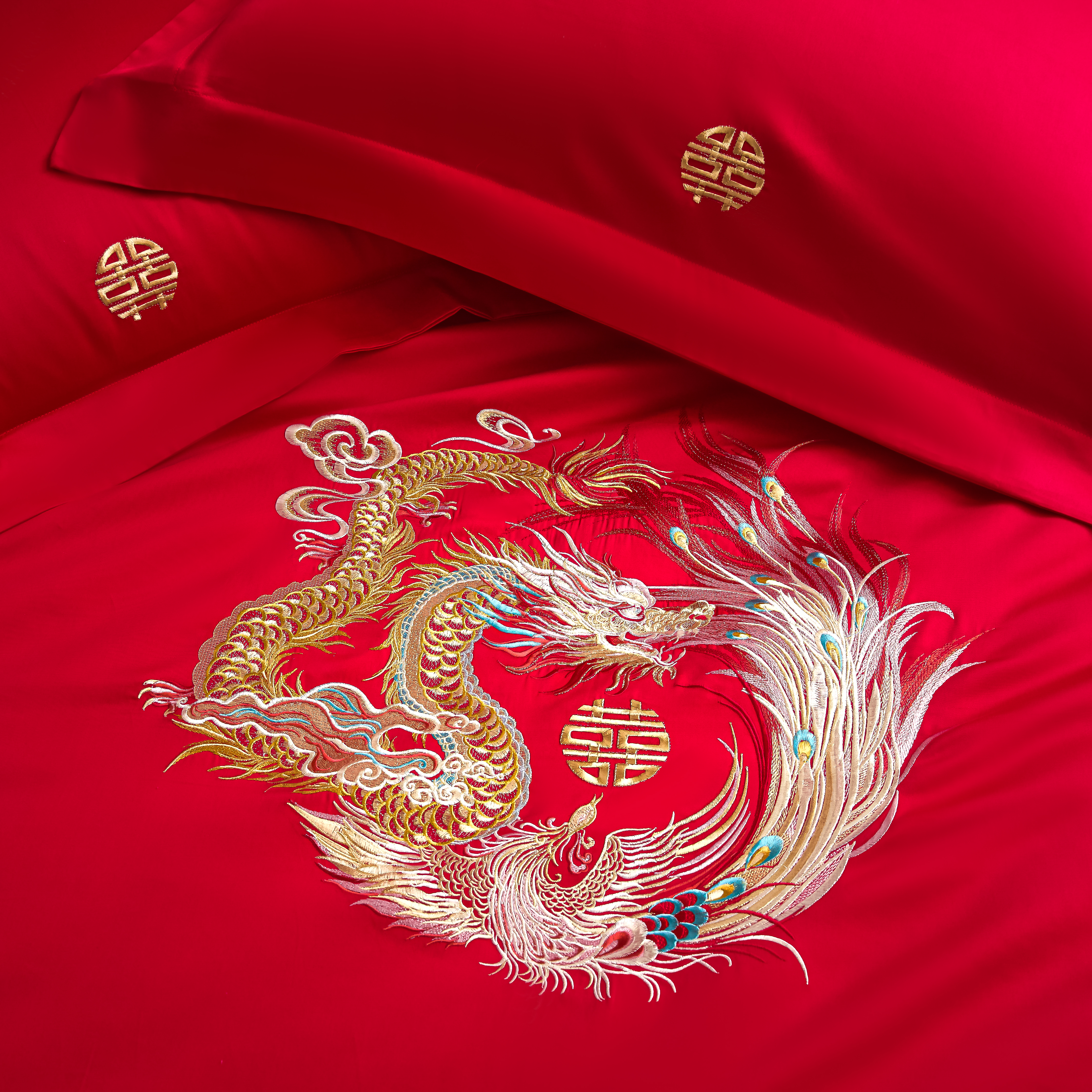 (总)秀色家纺 2025新款高档100支新疆长绒棉婚庆四件套纯棉喜被全棉大红色结婚床单被套-龙凤呈祥