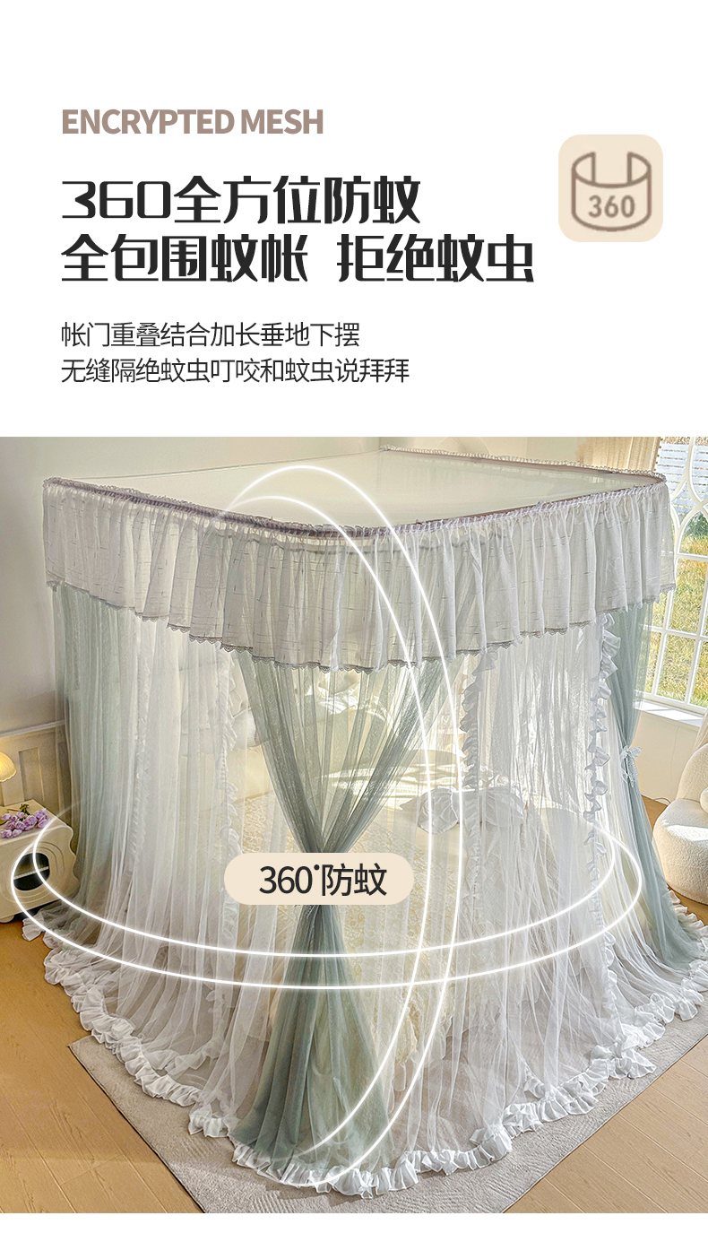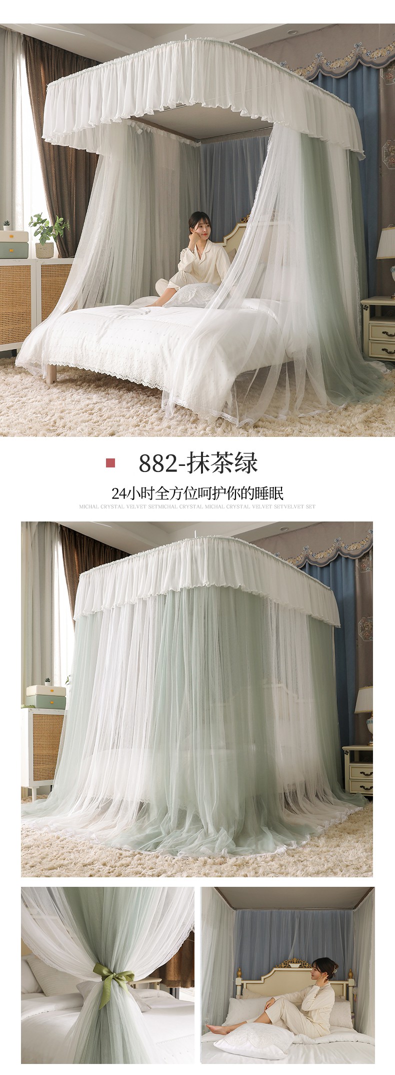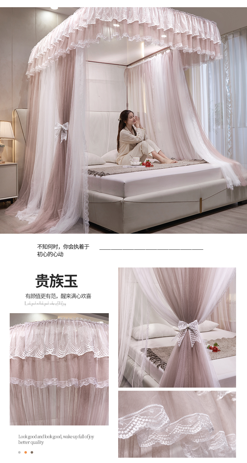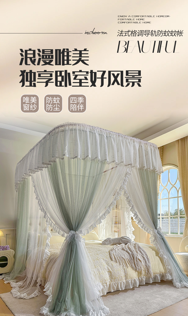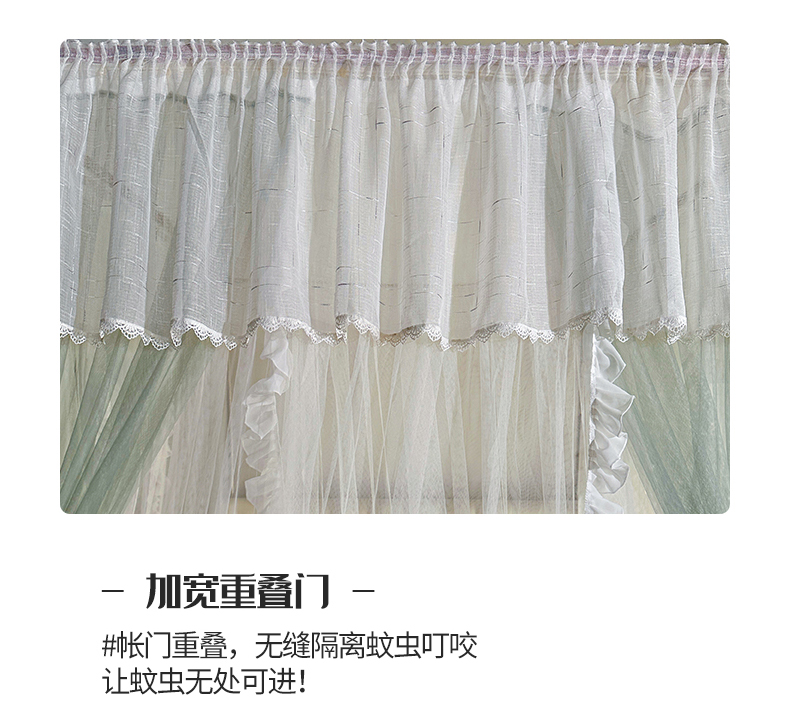 (总)夏彩 2025新款蕾丝U型防摔坐床蚊帐-88630,绿雅灰,藕玉色,香槟色