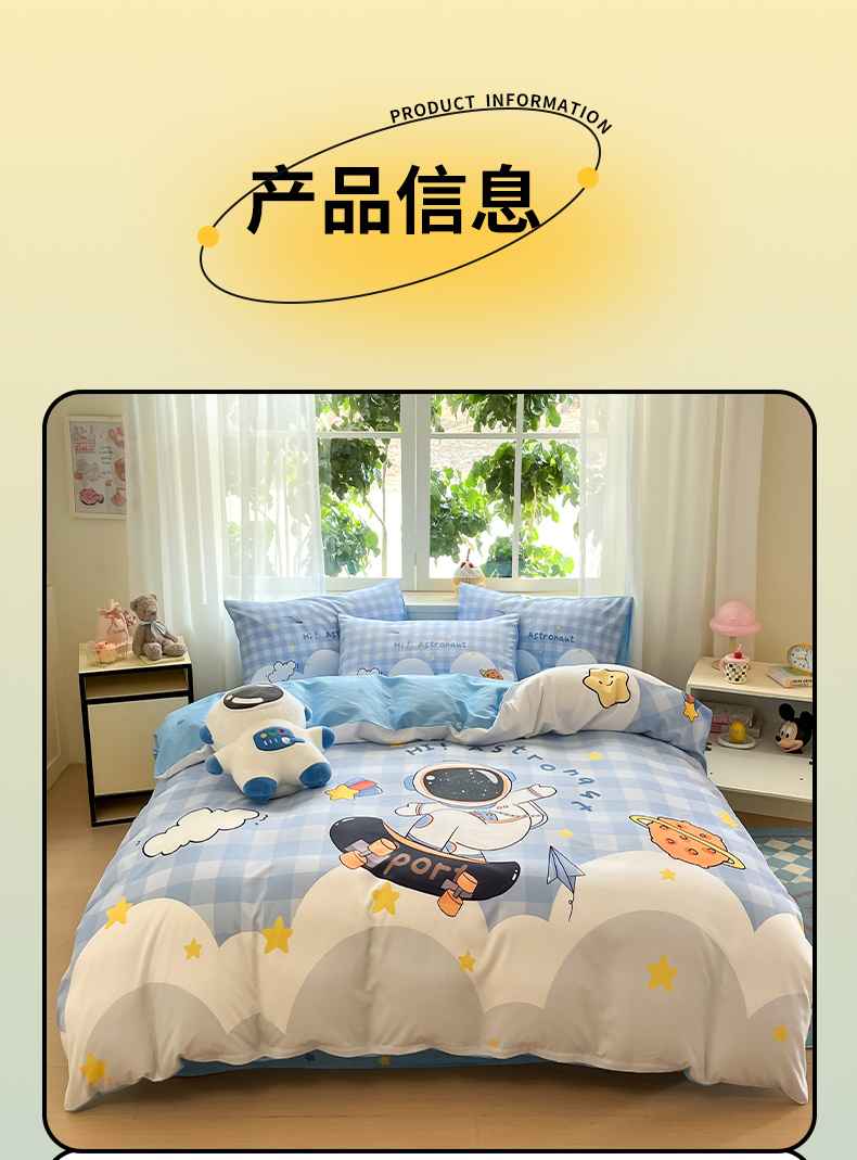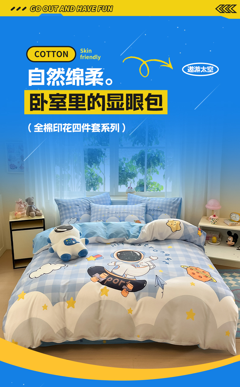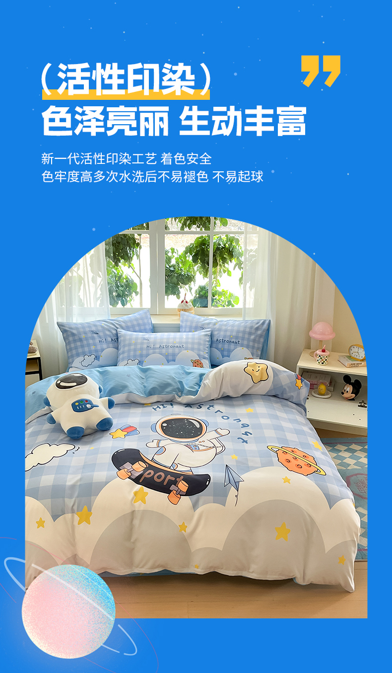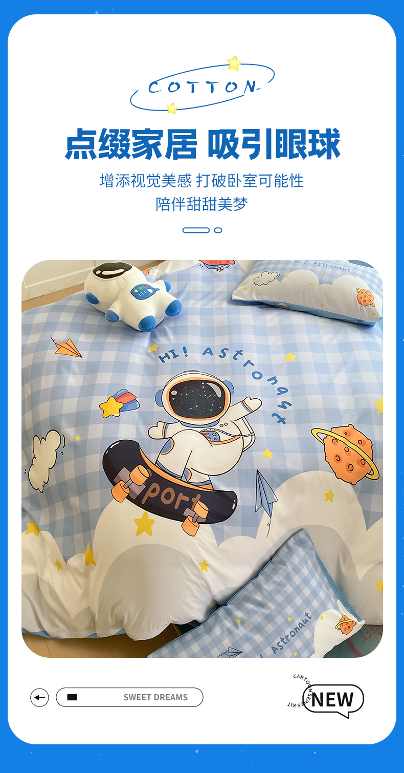 当前位置: 91家纺网 > 商品网购 > 床品套件 > 四件套 > 全棉普通四件套 > 博雅 2025新款纯棉宇航员四件套 滑板宇航员