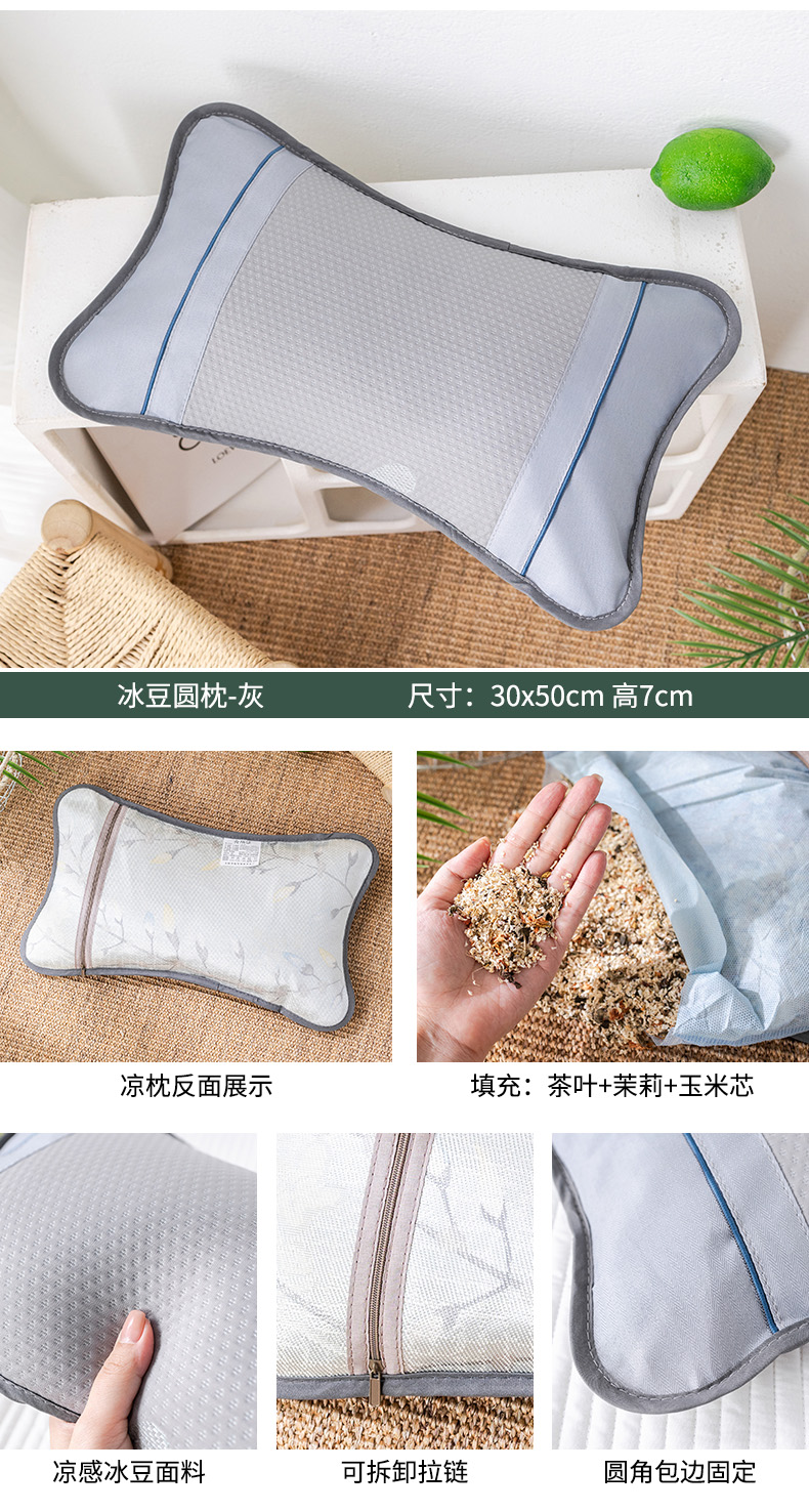 商品名称:2025新款凉感席夏季冰藤枕茶叶枕头凉豆豆席护颈椎竹席枕芯单人冰丝凉枕 冰豆圆枕-灰30x50
